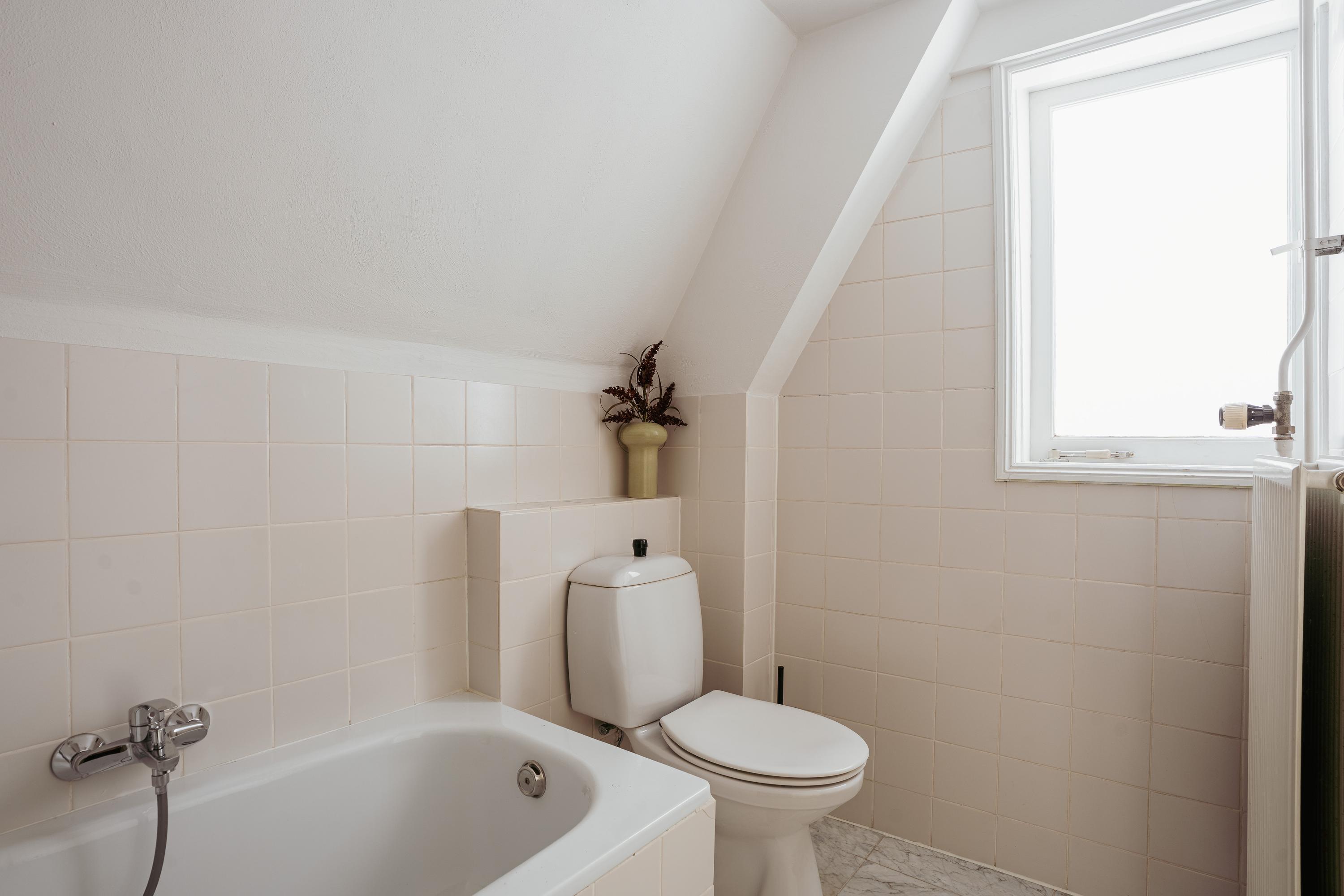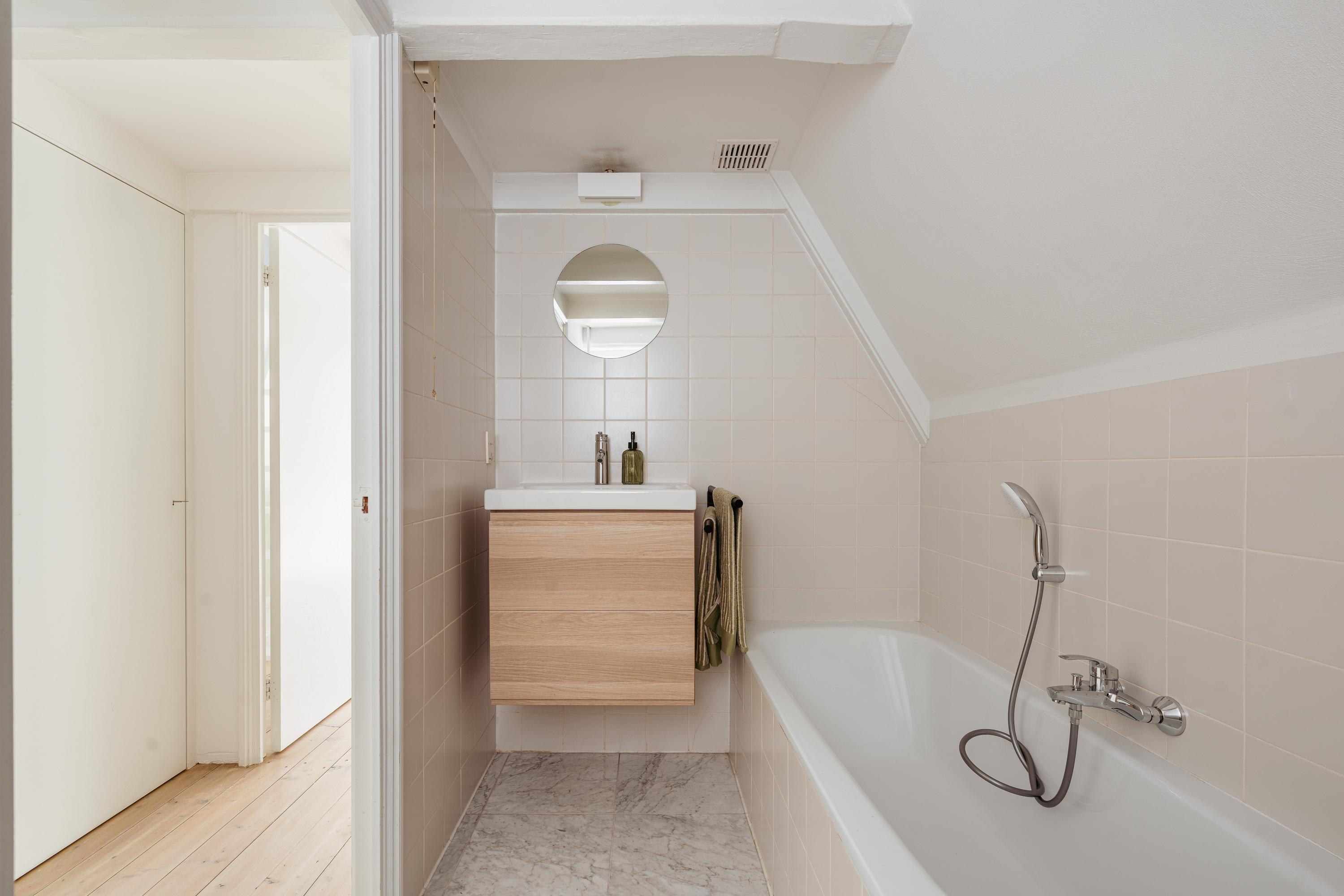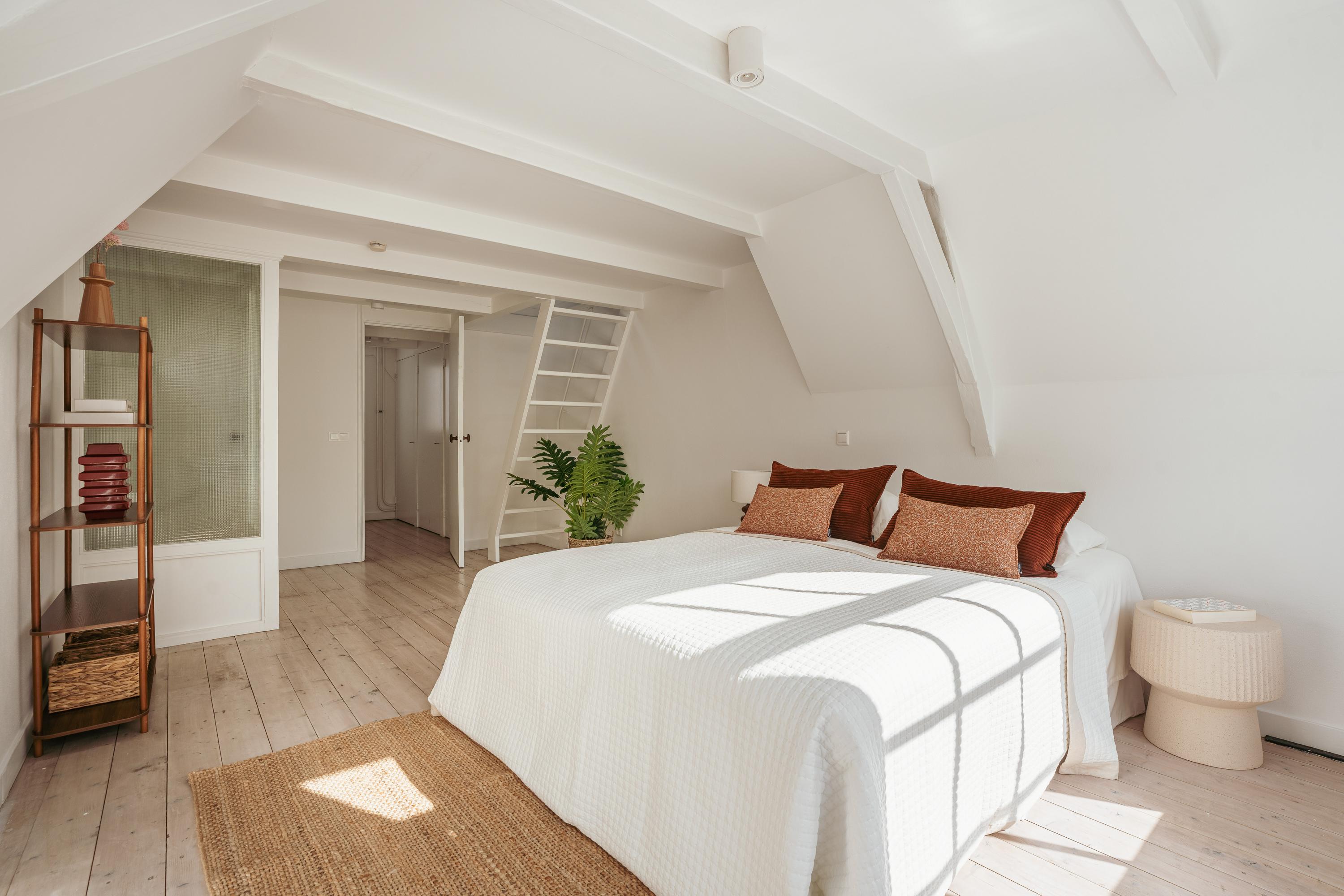 On the third floor is the second spacious bedroom, also with a beautiful canal view at the front. This floor has its own bathroom, fitted with a bathtub with shower, toilet, and washbasin. Several built-in wardrobes are also present here. An open staircase leads up to the attic.
