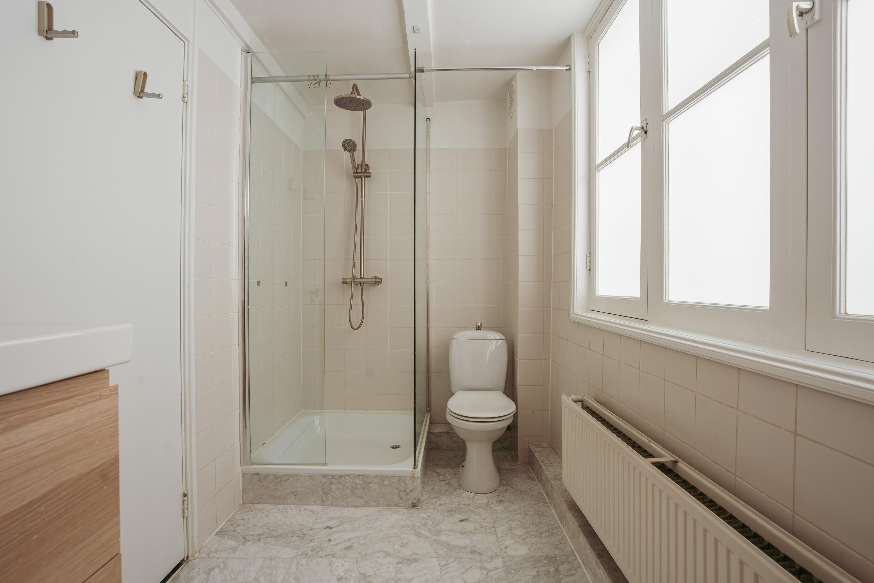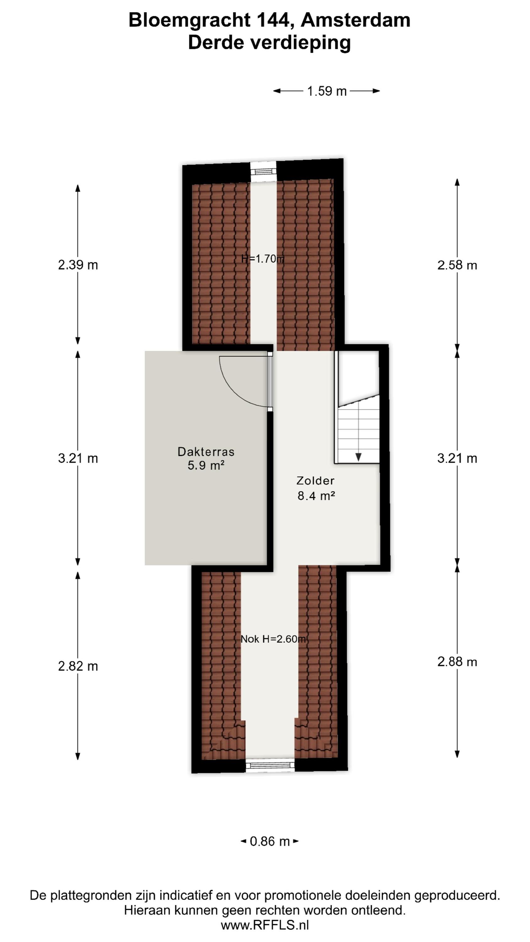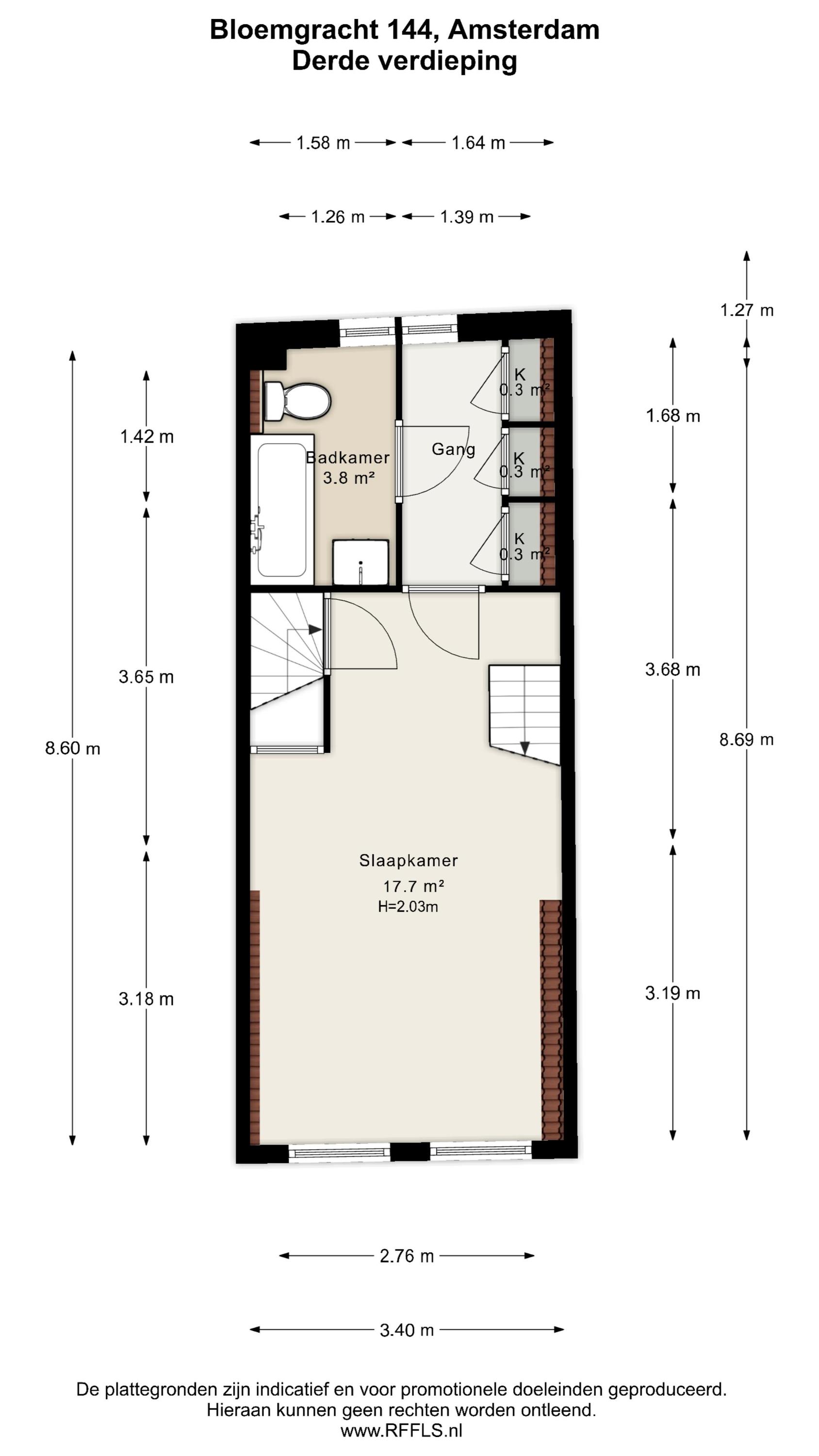 On the third floor is the second spacious bedroom, also with a beautiful canal view at the front. This floor has its own bathroom, fitted with a bathtub with shower, toilet, and washbasin. Several built-in wardrobes are also present here. An open staircase leads up to the attic.