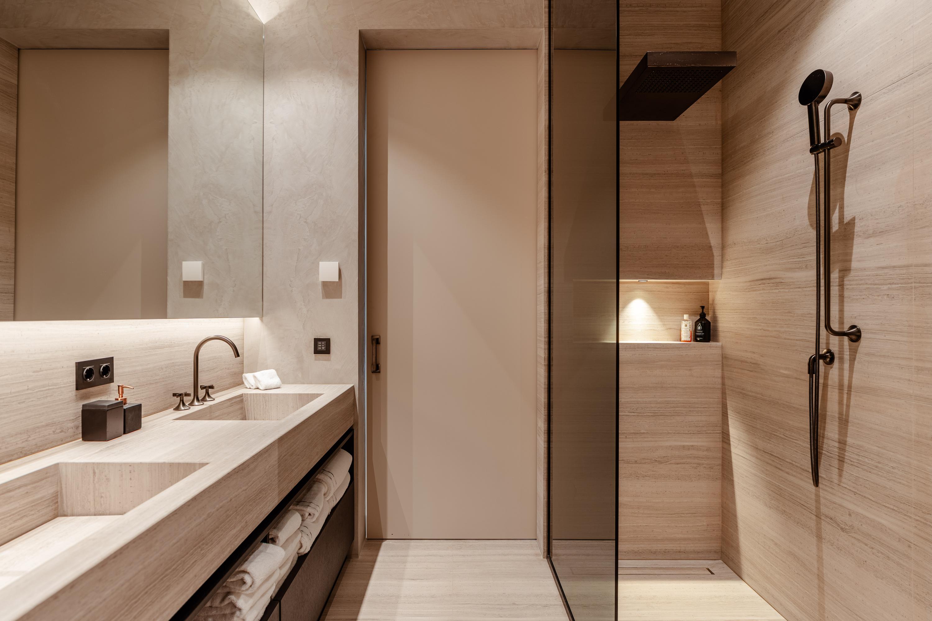 The apartment offers three bedrooms, each furnished with luxury Hästens beds. The master suite includes a private walk-in closet and a luxurious bathroom finished in marble and mosaic, featuring a bathtub, double washbasin, walk-in shower, and separate toilet. The second bathroom, designed in warm earthy tones, is also fully equipped and smartly laid out. Throughout the apartment lies a beautiful wooden floor, combined with underfloor and ceiling heating and cooling, recessed lighting, and electric sun blinds. A private storage room, as well as a technical and laundry room, are also included.