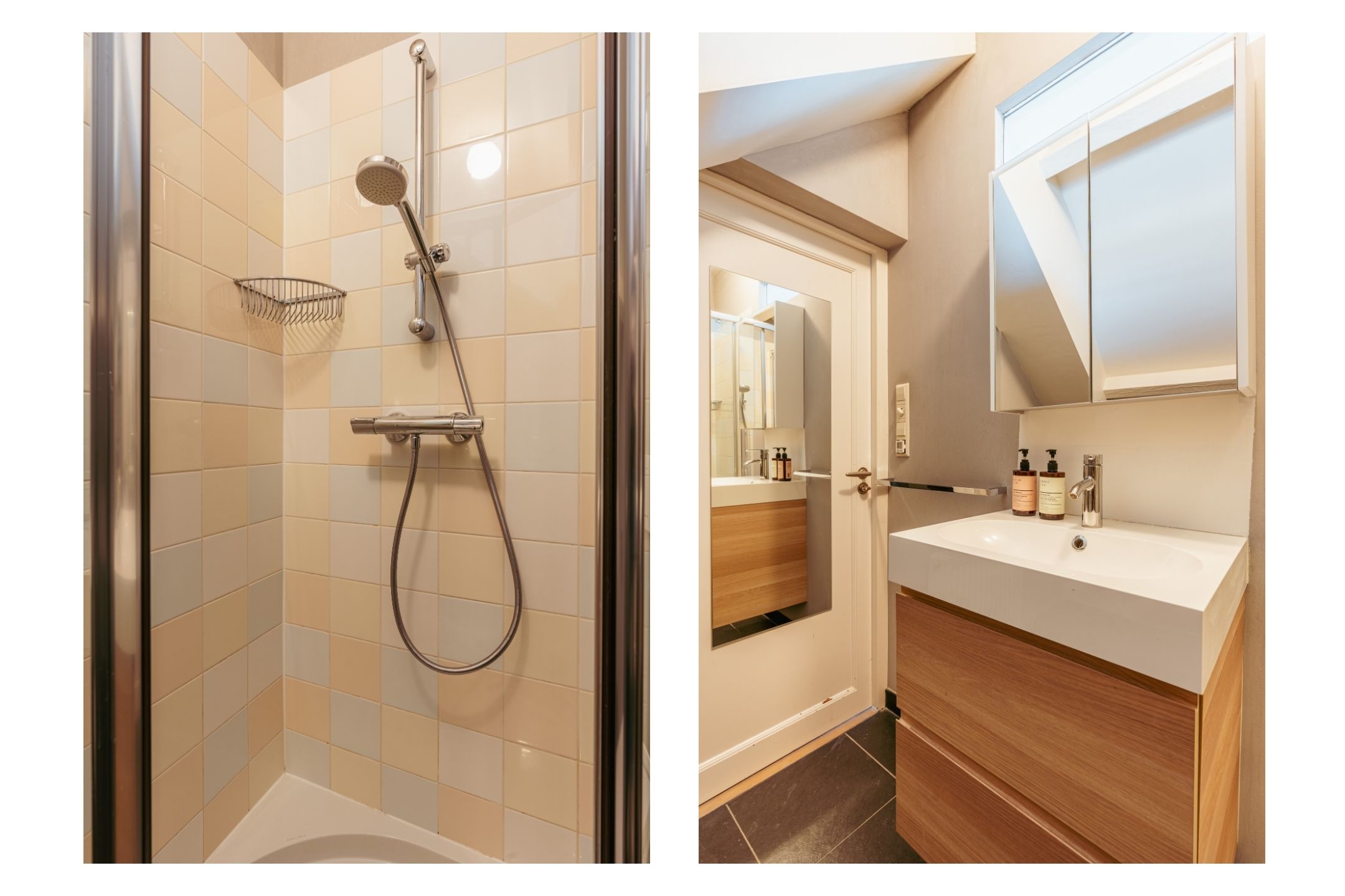 Landing with access to the fifth bedroom of this family home. The top floor boasts an impressive ceiling height and multiple windows, creating a bright and spacious atmosphere. The en-suite bathroom is fitted with a walk-in shower, washbasin with vanity unit, and toilet. A practical storage room is also accessible from the landing. This floor is highly suitable as a home office, guest room, or studio.