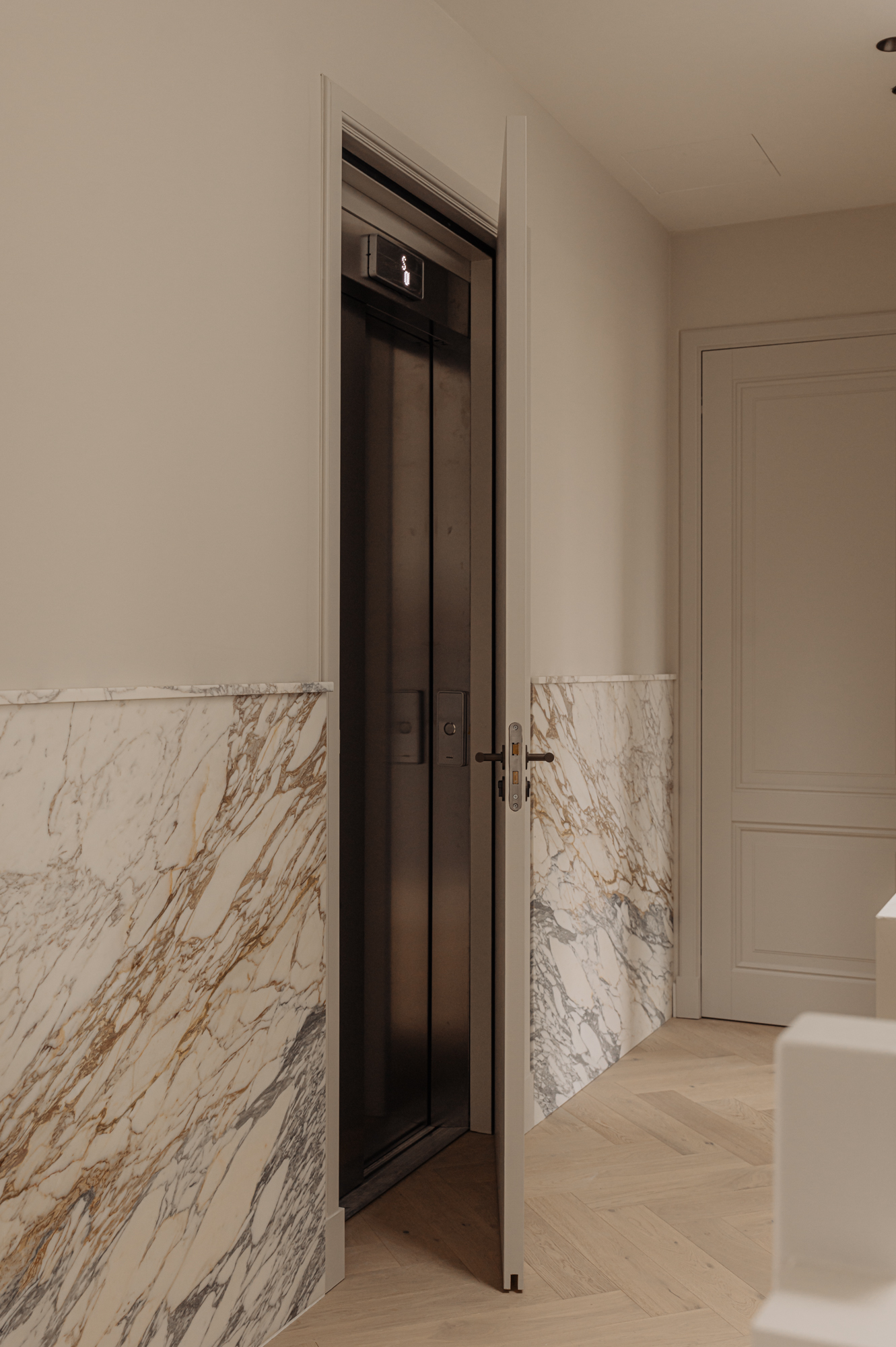 The building’s private parking spaces give access to the stylish, communal entrance with marble wainscoting. Here you will also find access to the meter cupboards for each apartment. The fourth floor and the entrance to the apartment are reached via the stairs or the elegant marble lift.
