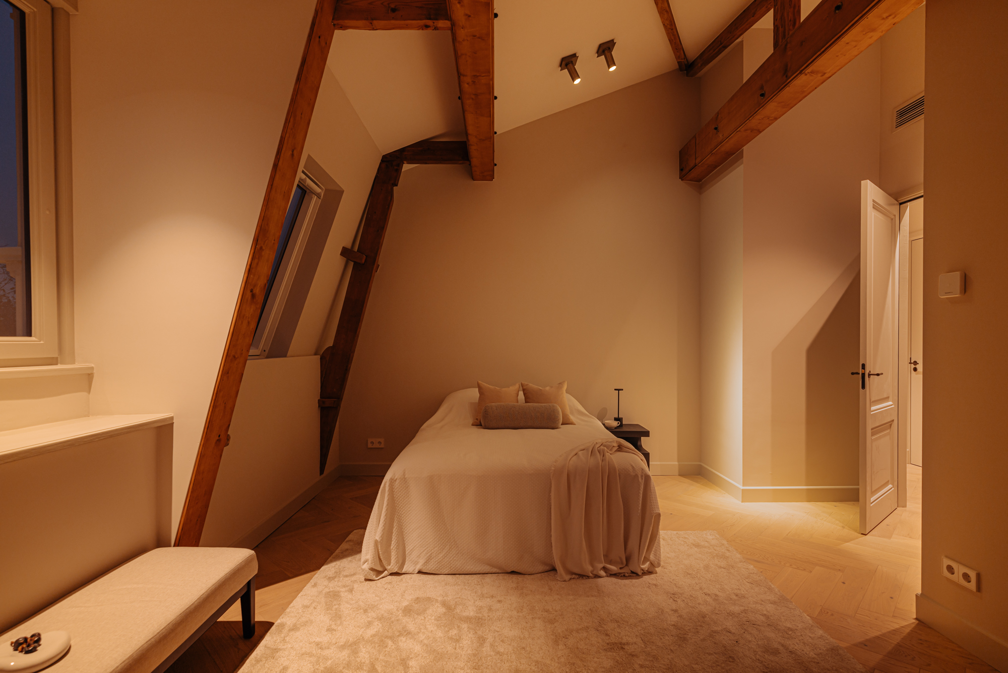 The front door to the apartment opens into a landing that gives access to storage space, a separate guest toilet and all the apartment’s other rooms. There is a large, bright living room (approx. 53 m2) and an open-plan kitchen of Italian design with a cooking island at the front of this floor. The luxury kitchen is equipped with a comprehensive range of built-in appliances and balances style and functionality perfectly. The sophisticated combination of white units with marble worktops and large units with the warm shade of walnut give the space a beautiful, atmospheric feel. A number of double doors open out onto the apartment’s sunny roof terrace.
