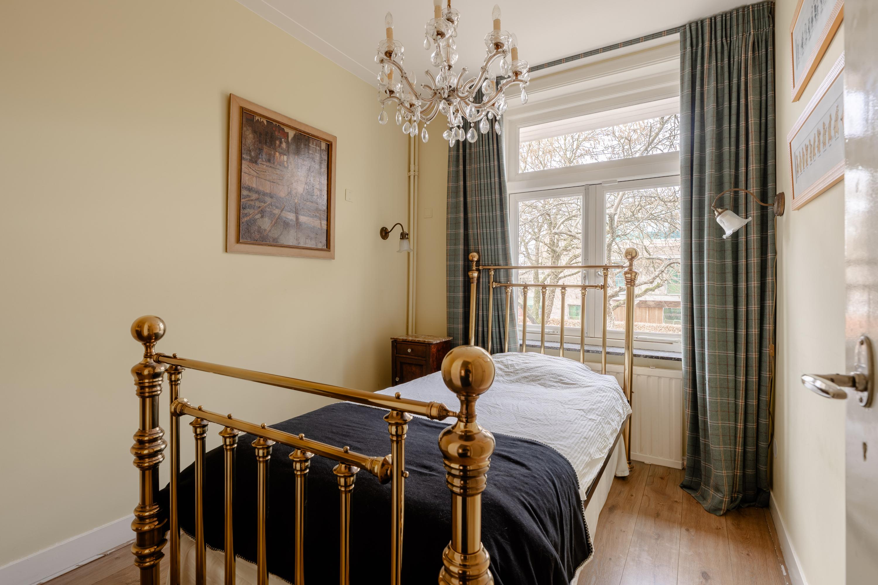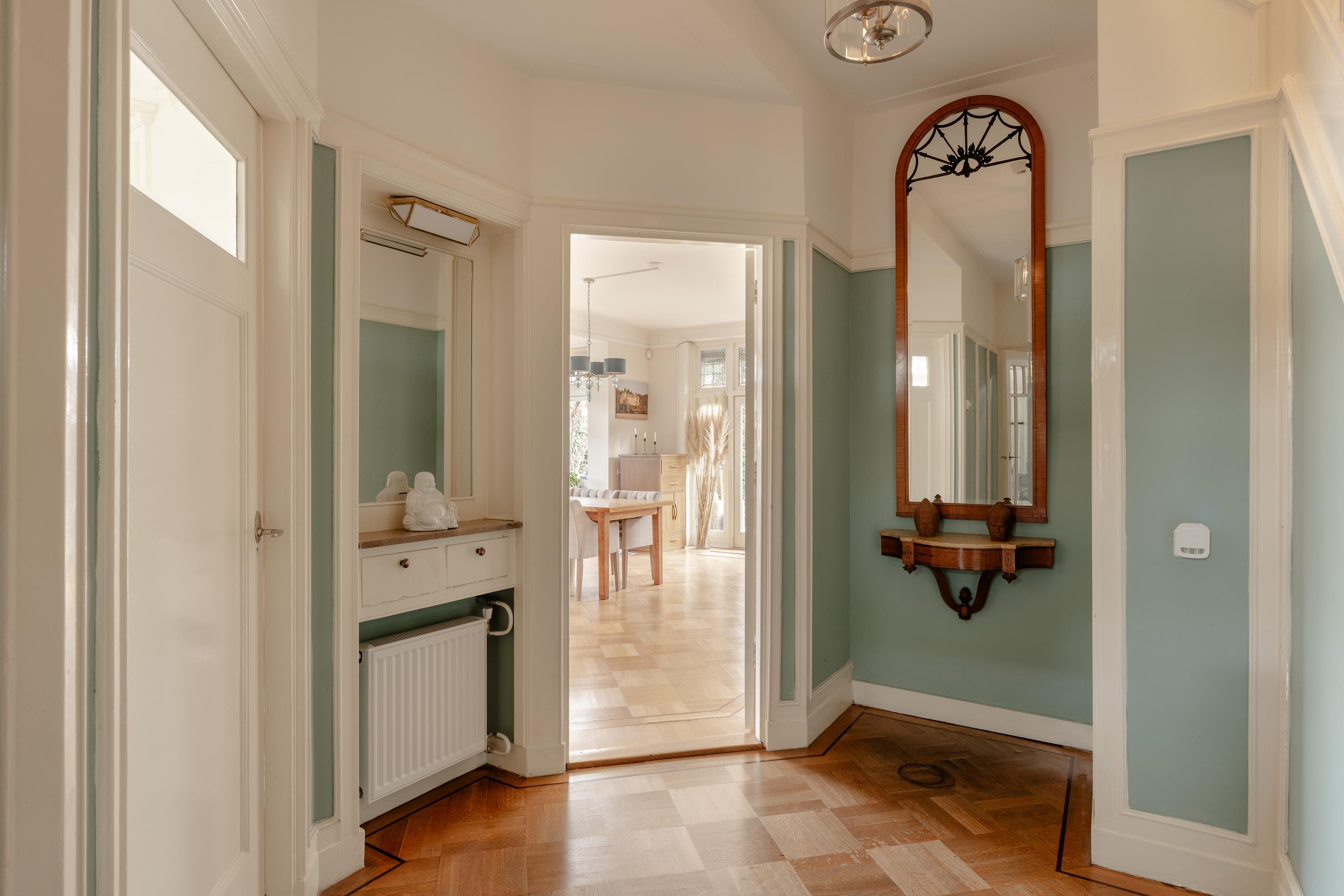This floor is characterised by beautiful original stained-glass windows and an elegant parquet floor with border. At the front of the house is the spacious and bright en-suite living room with fireplace, creating a warm and inviting living space.