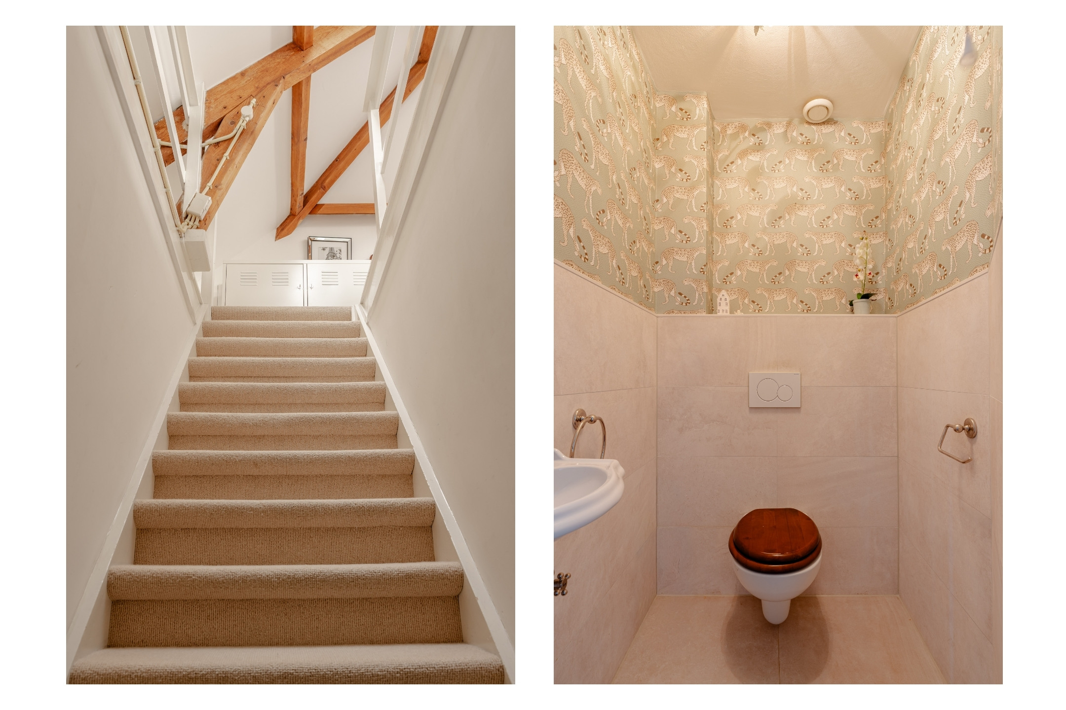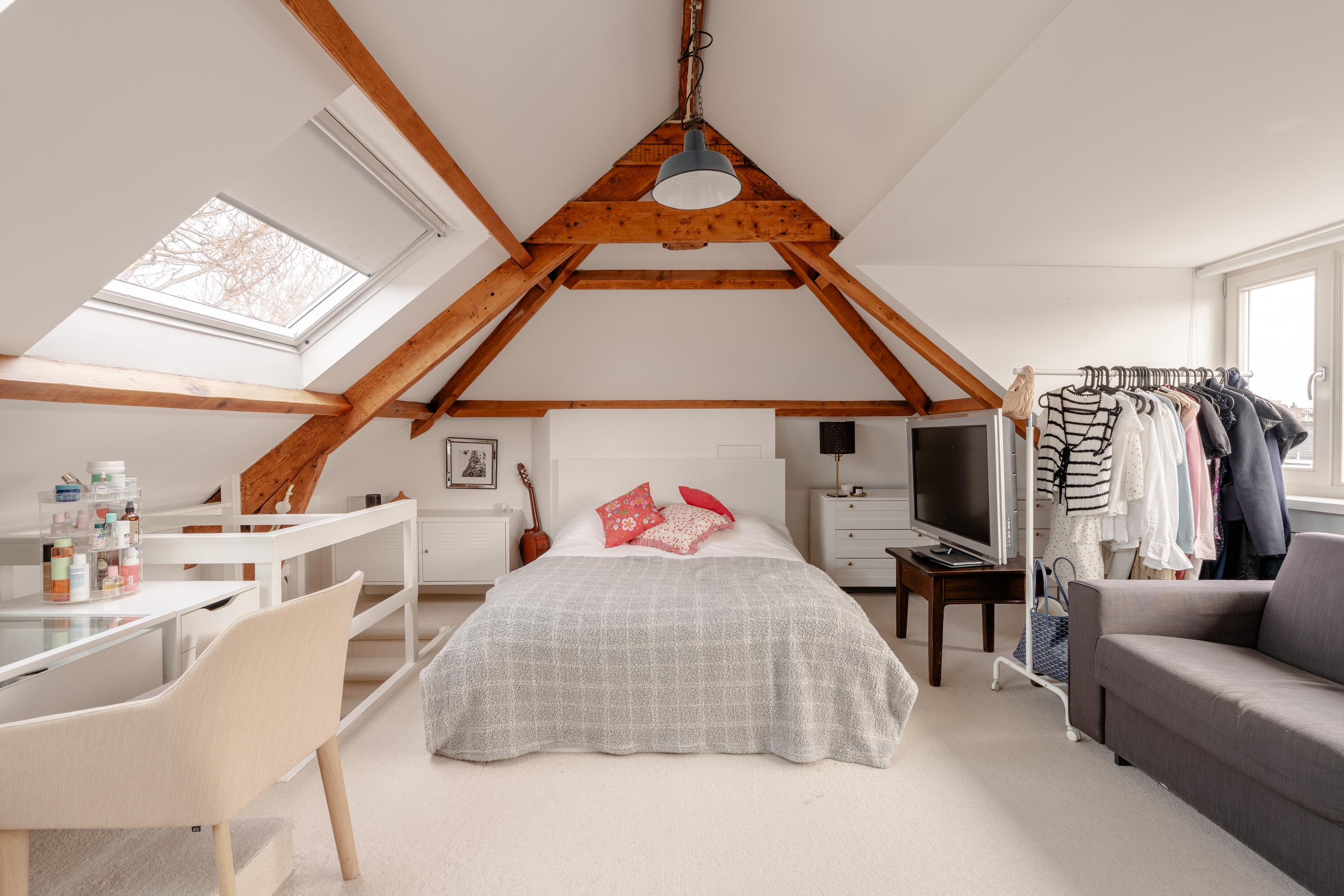 The room is currently arranged as a bedroom with a sitting area, but could easily serve as a master bedroom, studio or multifunctional space. Practical storage space is available in the knee walls.