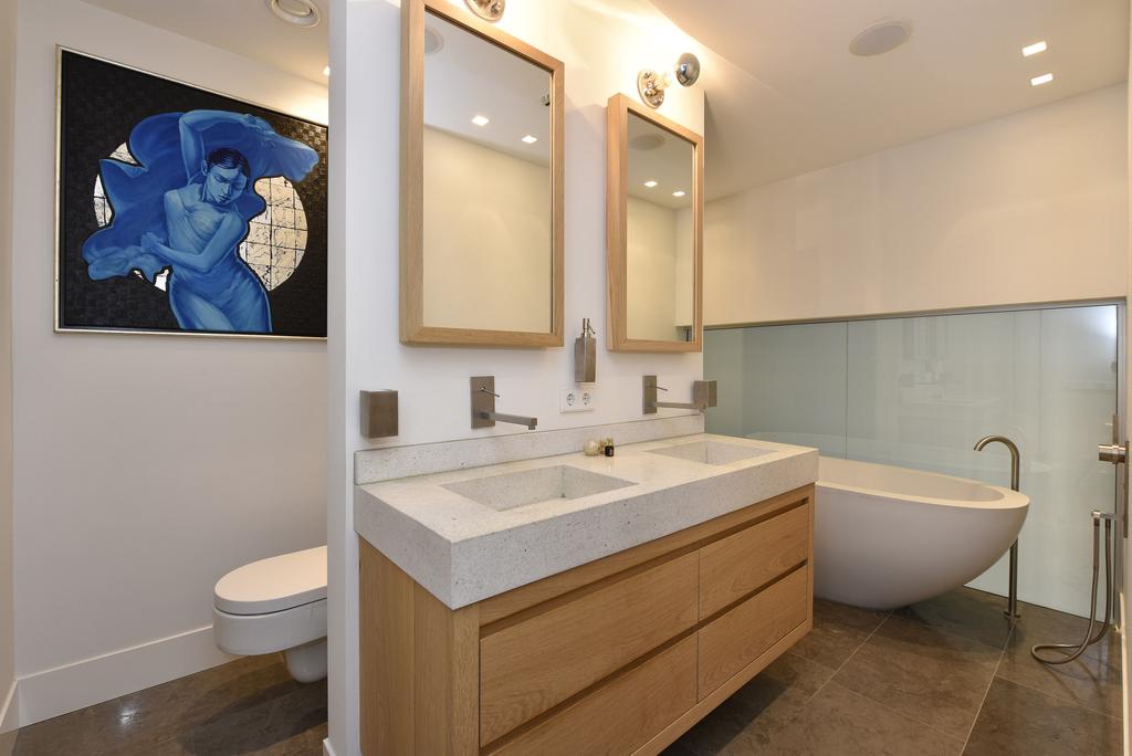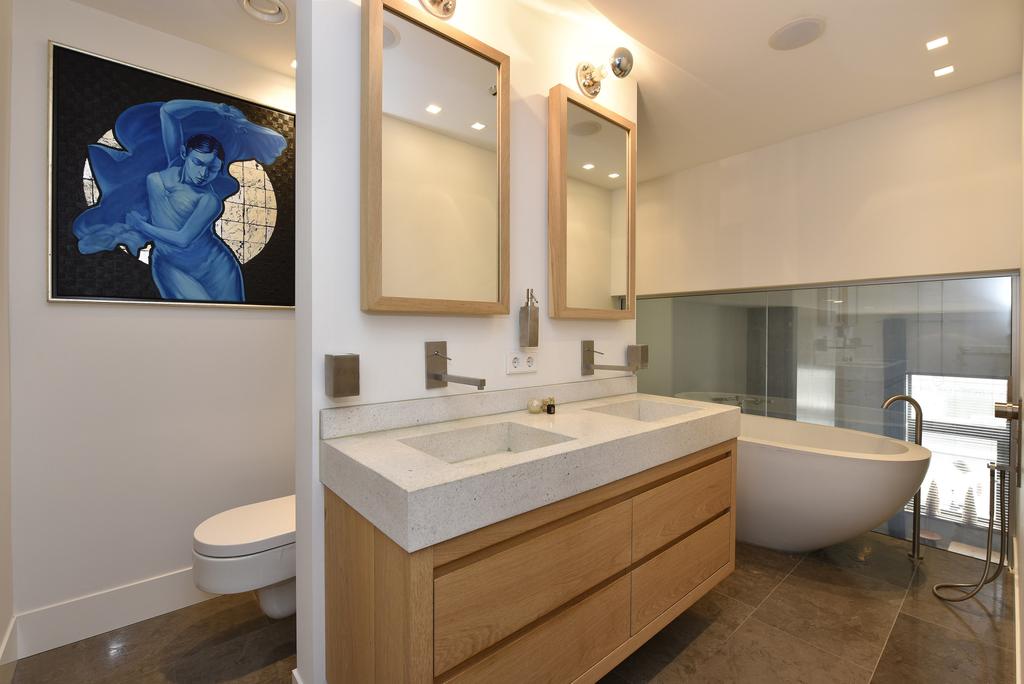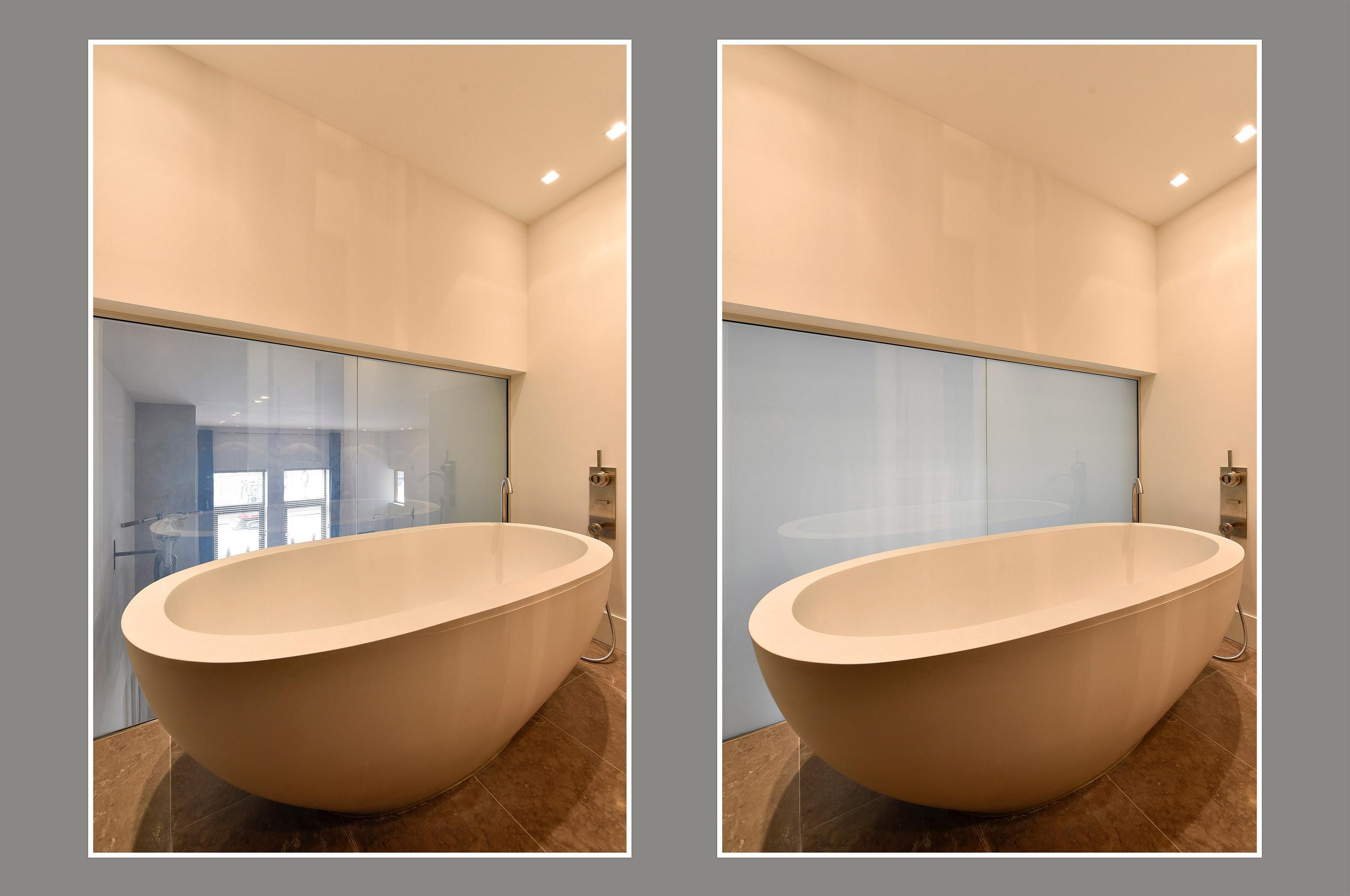 The luxurious bathroom is situated in the middle of the floor and is fitted with a freestanding bath, separate shower and toilet, as well as a double washbasin. The window, which provides the necessary light, can be electrically adjusted from transparent to matte glass when you need the privacy.