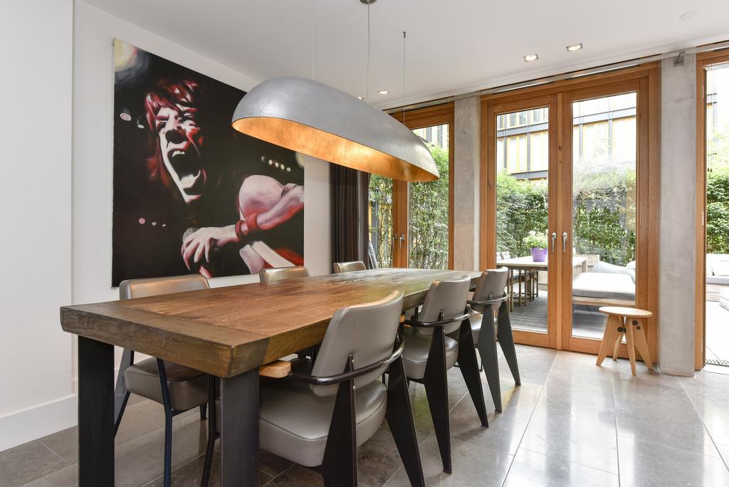 The living room is on the street side of the building and this means it has a gorgeous view out over the waters of the Boerenwetering. This area has a ceiling height of 3.90 metres and is fitted with a gas fireplace. There is a lovely view through from this space to the kitchen and garden, as well as to the freestanding bath.