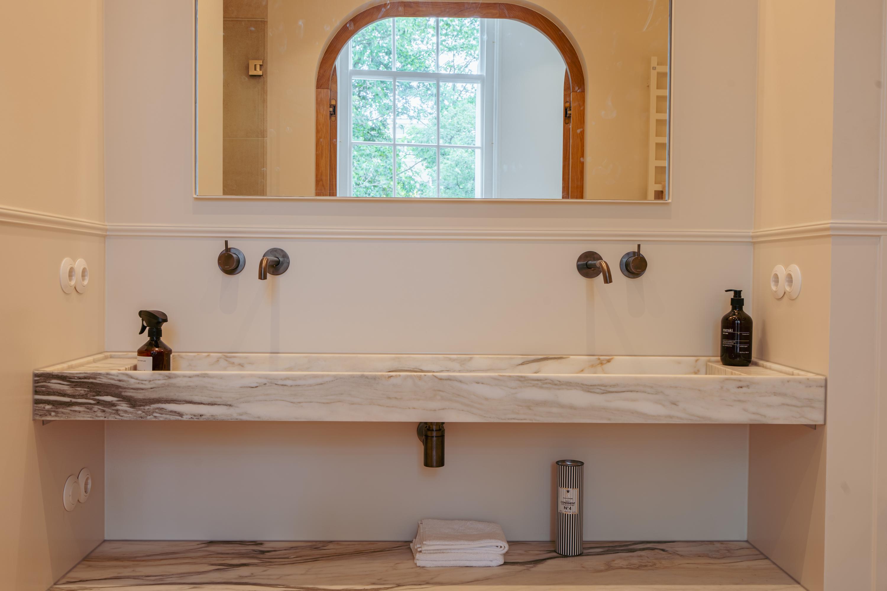 The primary bedroom features custom cabinetry and an en-suite bath detailed in marble, enhanced by characterful wooden archways and French doors opening to a rain shower. A second generous bedroom looks onto tranquil gardens, complemented by a dedicated bathroom. Mechanised ventilation, double glazing in select areas, and energy class B ensure a discreet, efficient environment.