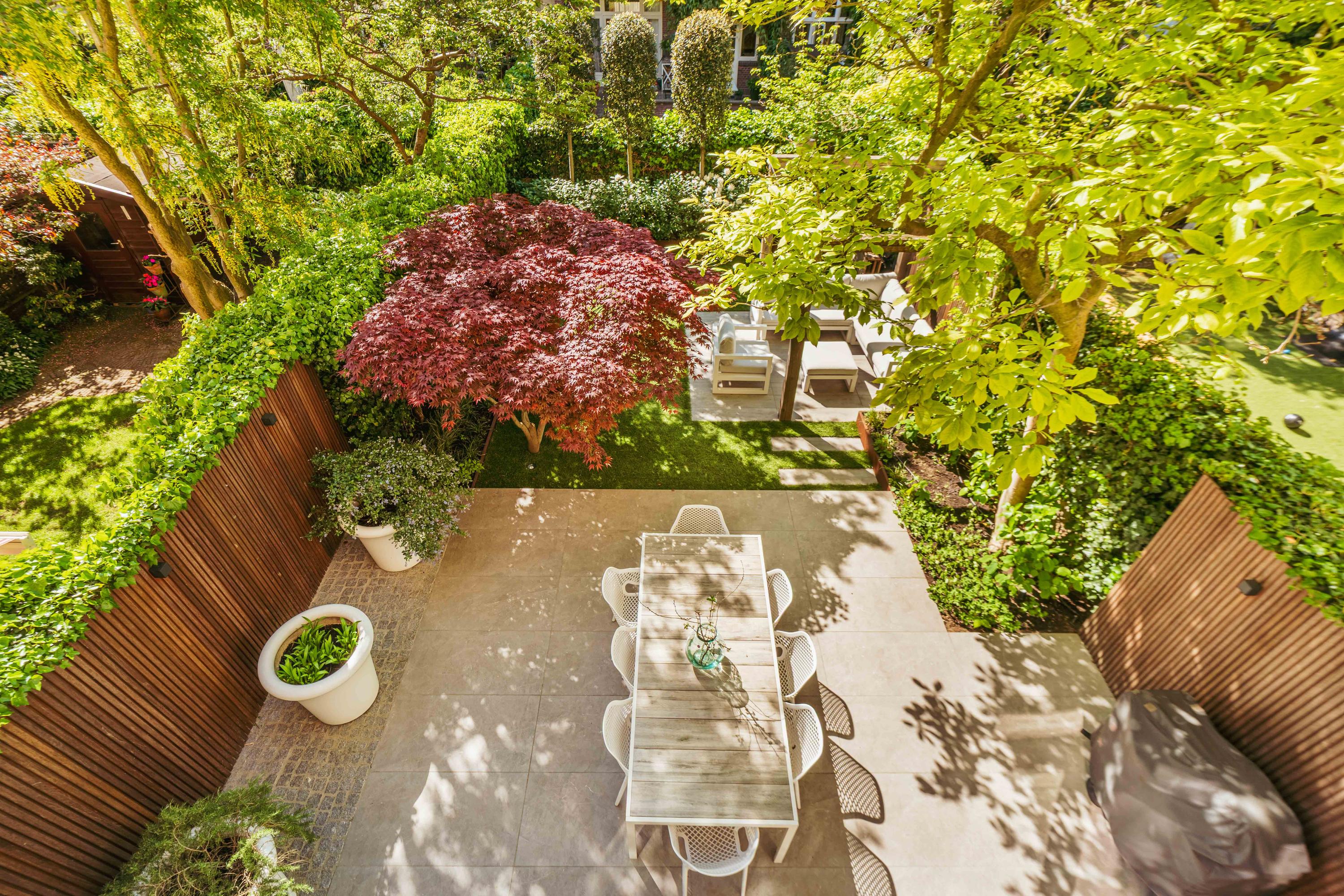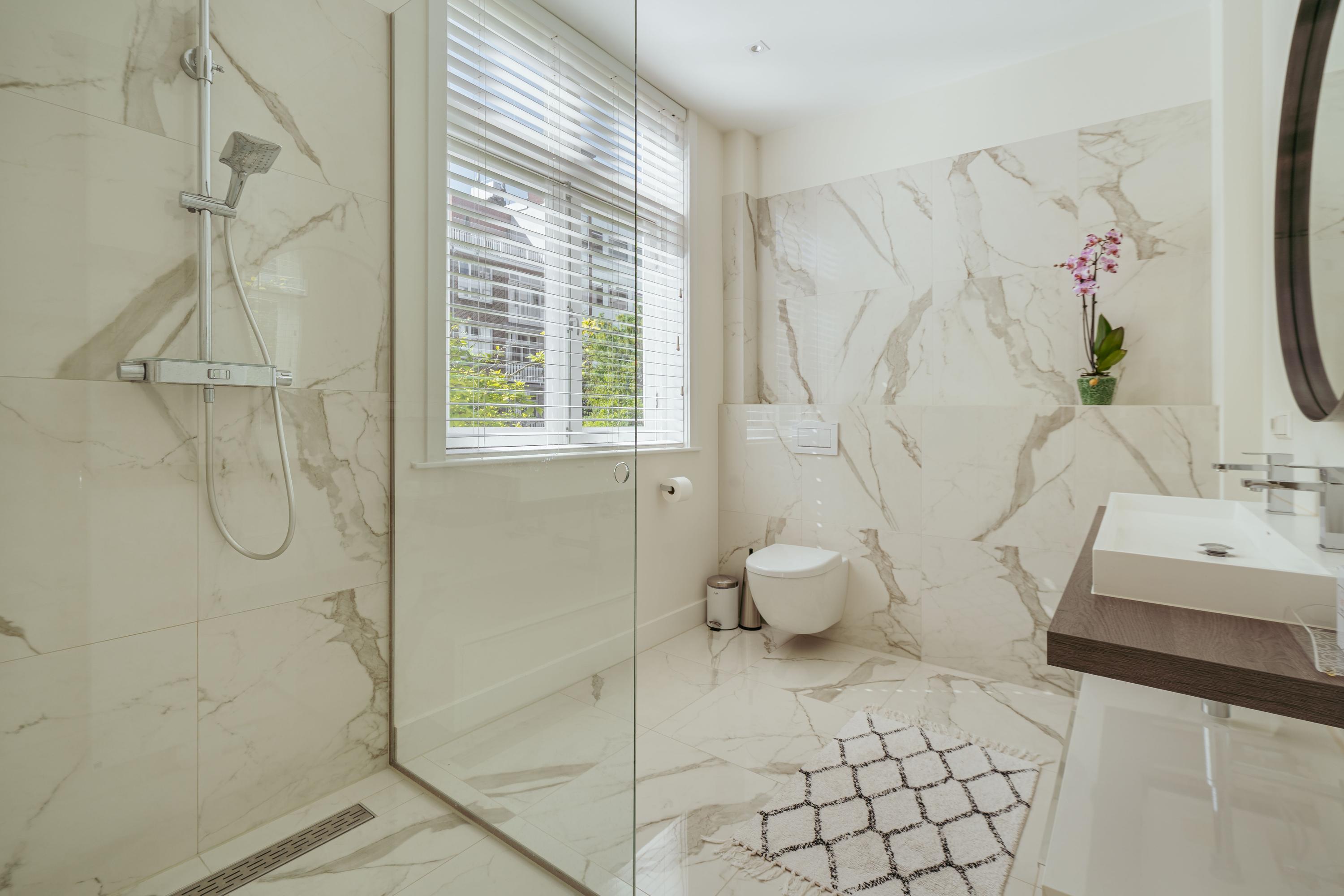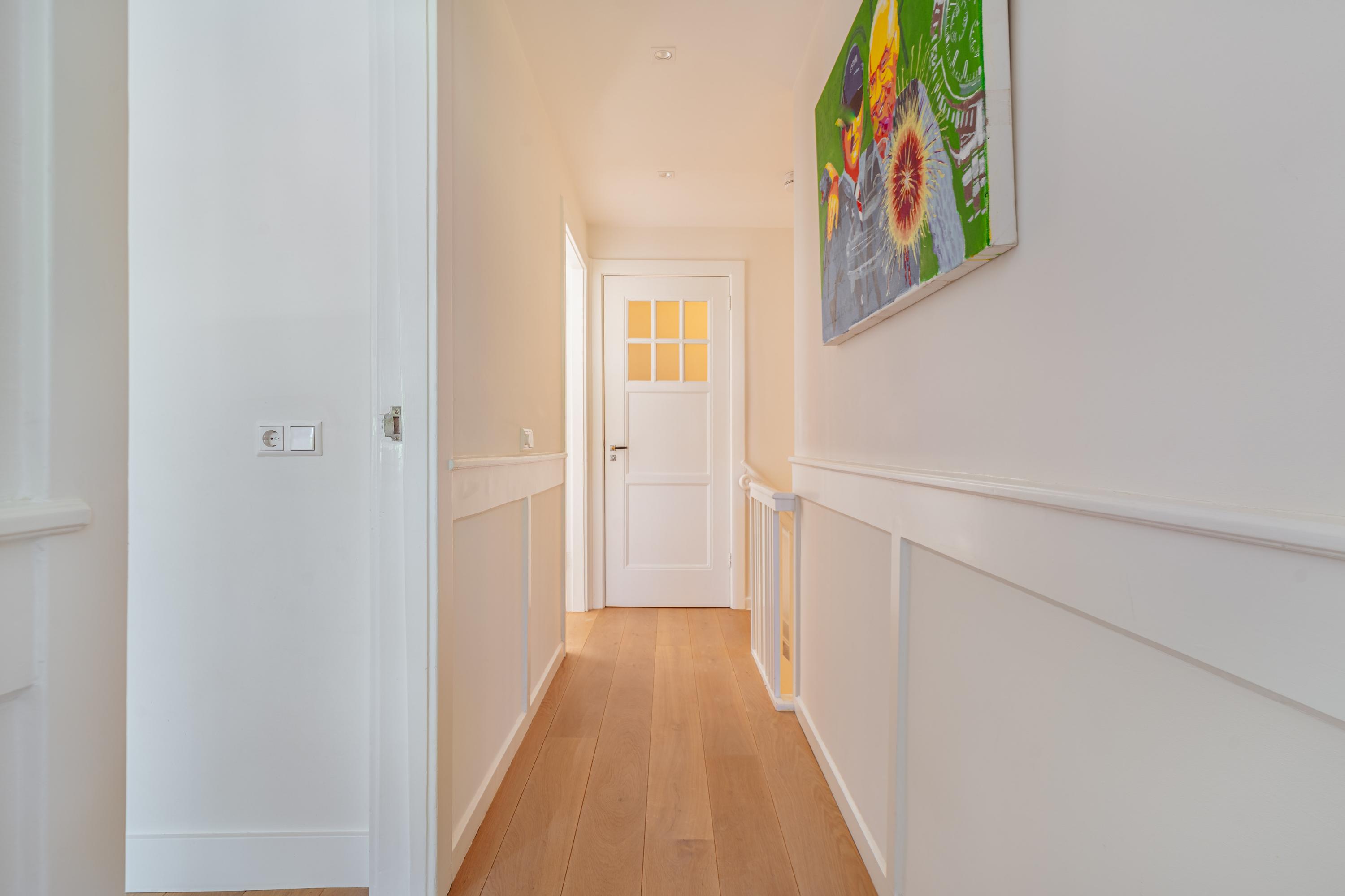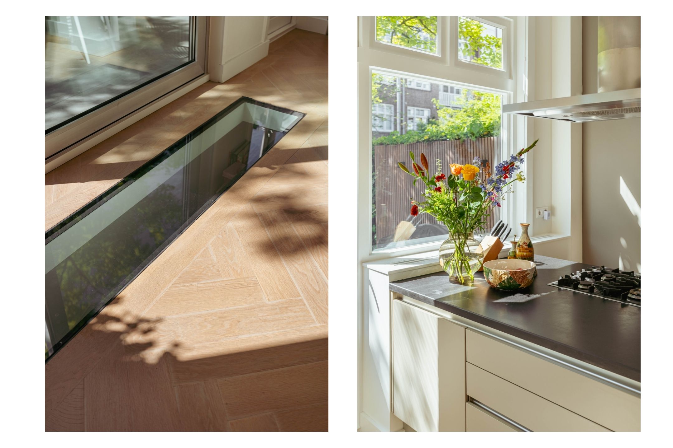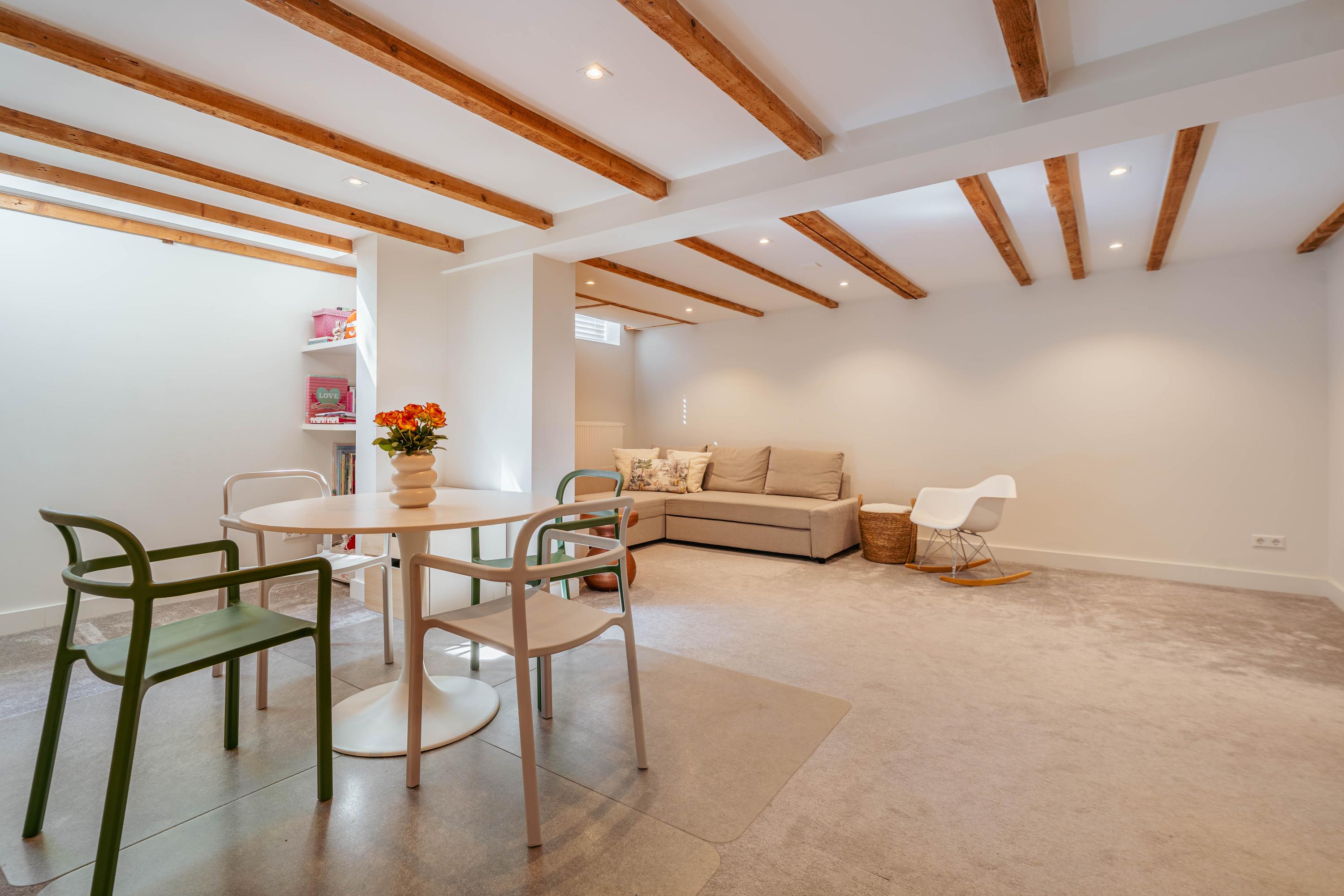 Via your private entrance, you enter this stylish home. Behind the vestibule with beautiful marble accents, you’ll find a spacious hallway, which includes a separate toilet. The expansive living room stretches the full depth of the home: at the front is a cozy sitting area, while at the rear you’ll find the dining area with an open kitchen. The modern kitchen is fully equipped and features a large island, a 5-burner gas stove, sink, freezer, refrigerator, and oven. Both the kitchen and dining area provide direct access to the beautiful west-facing rear garden. This landscaped garden offers plenty of sun well into the evening—an ideal spot for relaxing or outdoor dining.