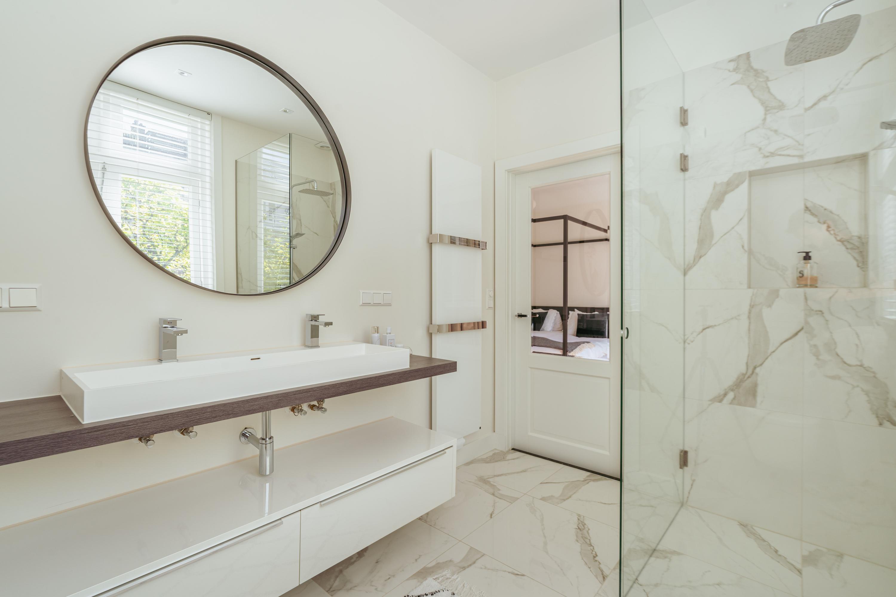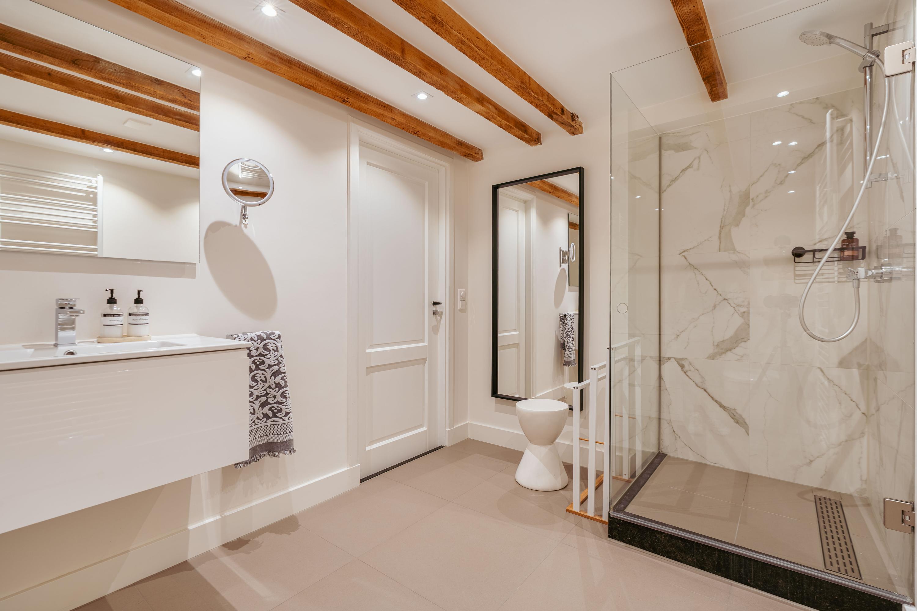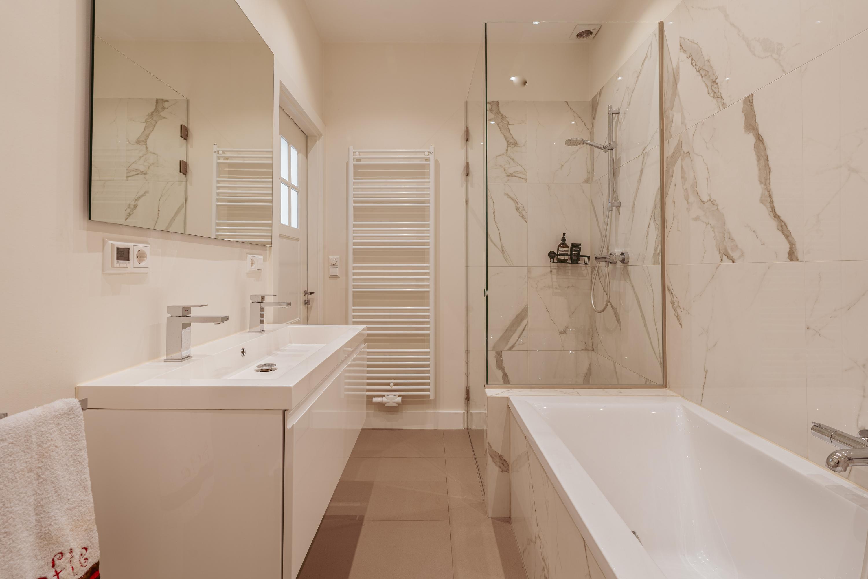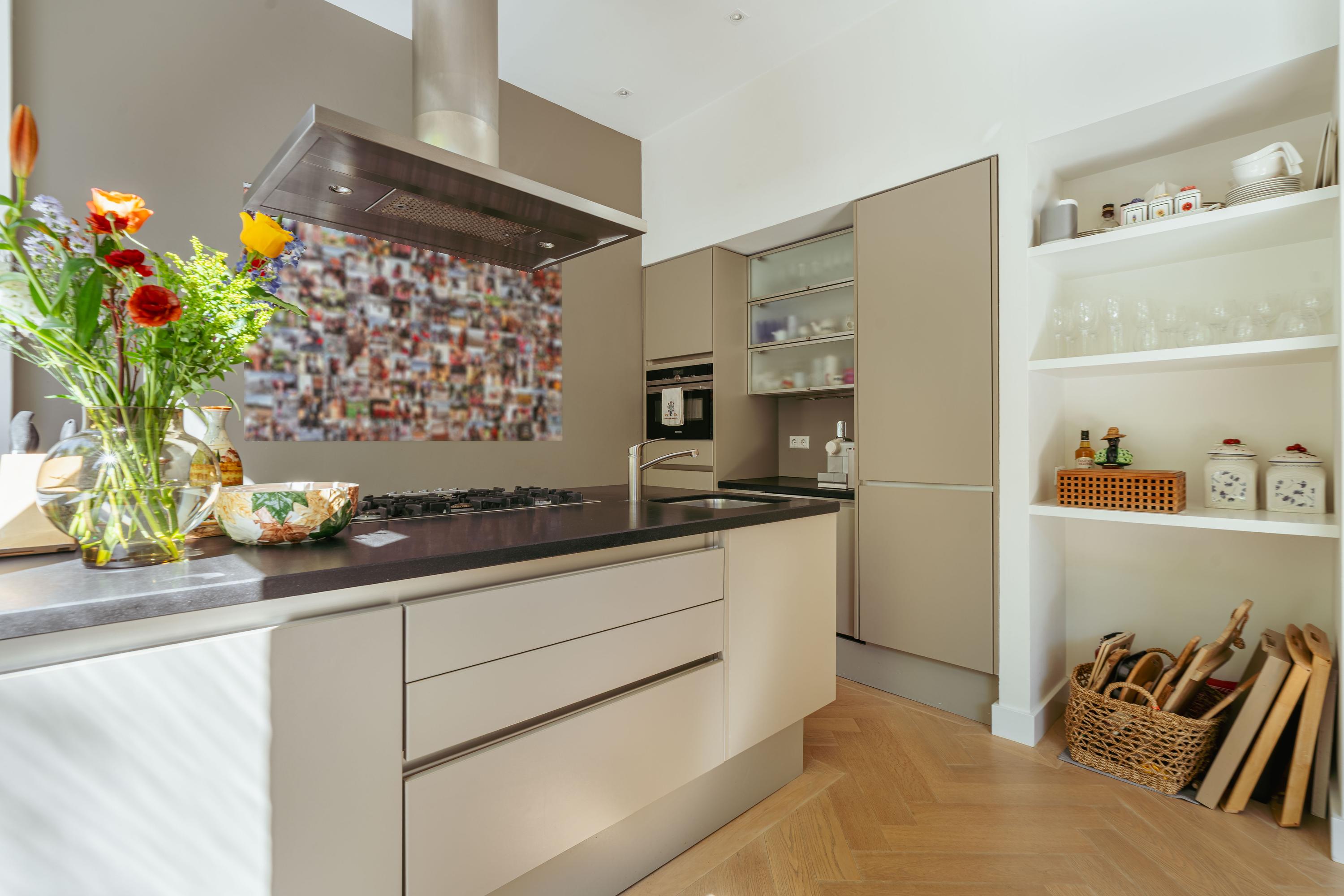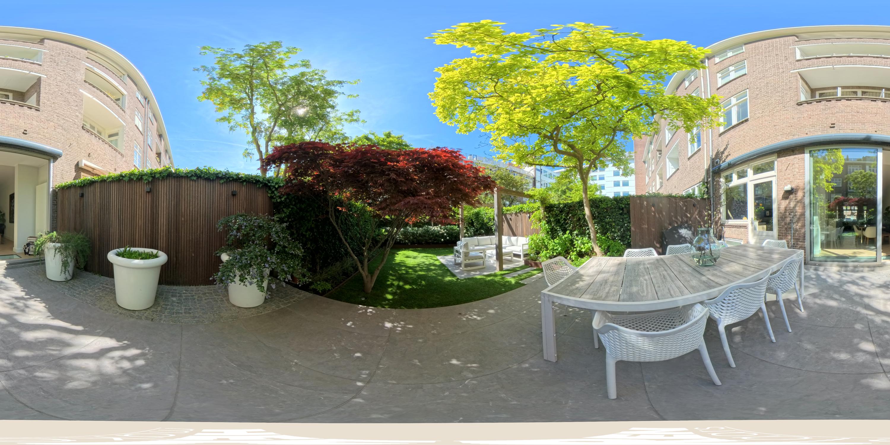 Via your private entrance, you enter this stylish home. Behind the vestibule with beautiful marble accents, you’ll find a spacious hallway, which includes a separate toilet. The expansive living room stretches the full depth of the home: at the front is a cozy sitting area, while at the rear you’ll find the dining area with an open kitchen. The modern kitchen is fully equipped and features a large island, a 5-burner gas stove, sink, freezer, refrigerator, and oven. Both the kitchen and dining area provide direct access to the beautiful west-facing rear garden. This landscaped garden offers plenty of sun well into the evening—an ideal spot for relaxing or outdoor dining.