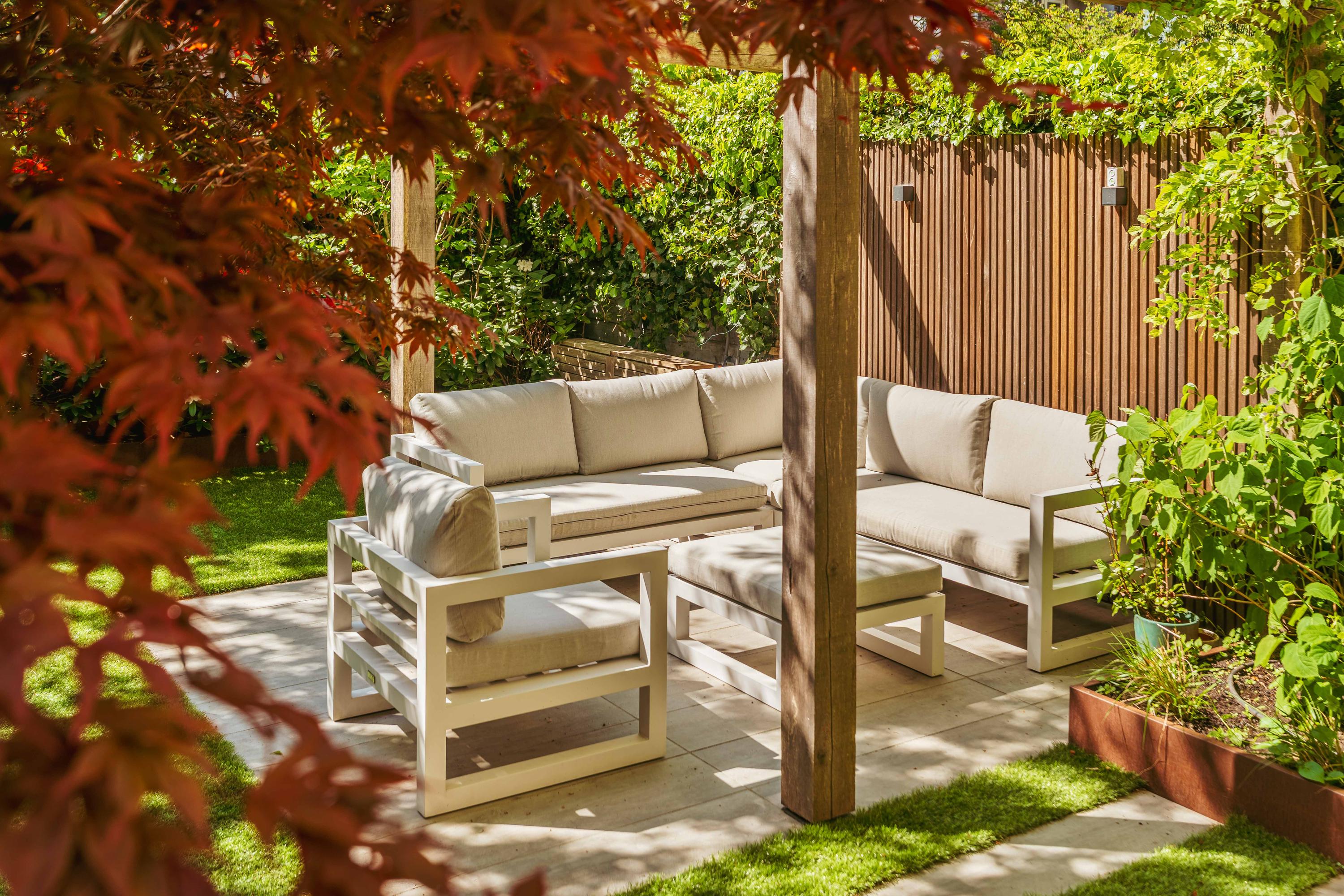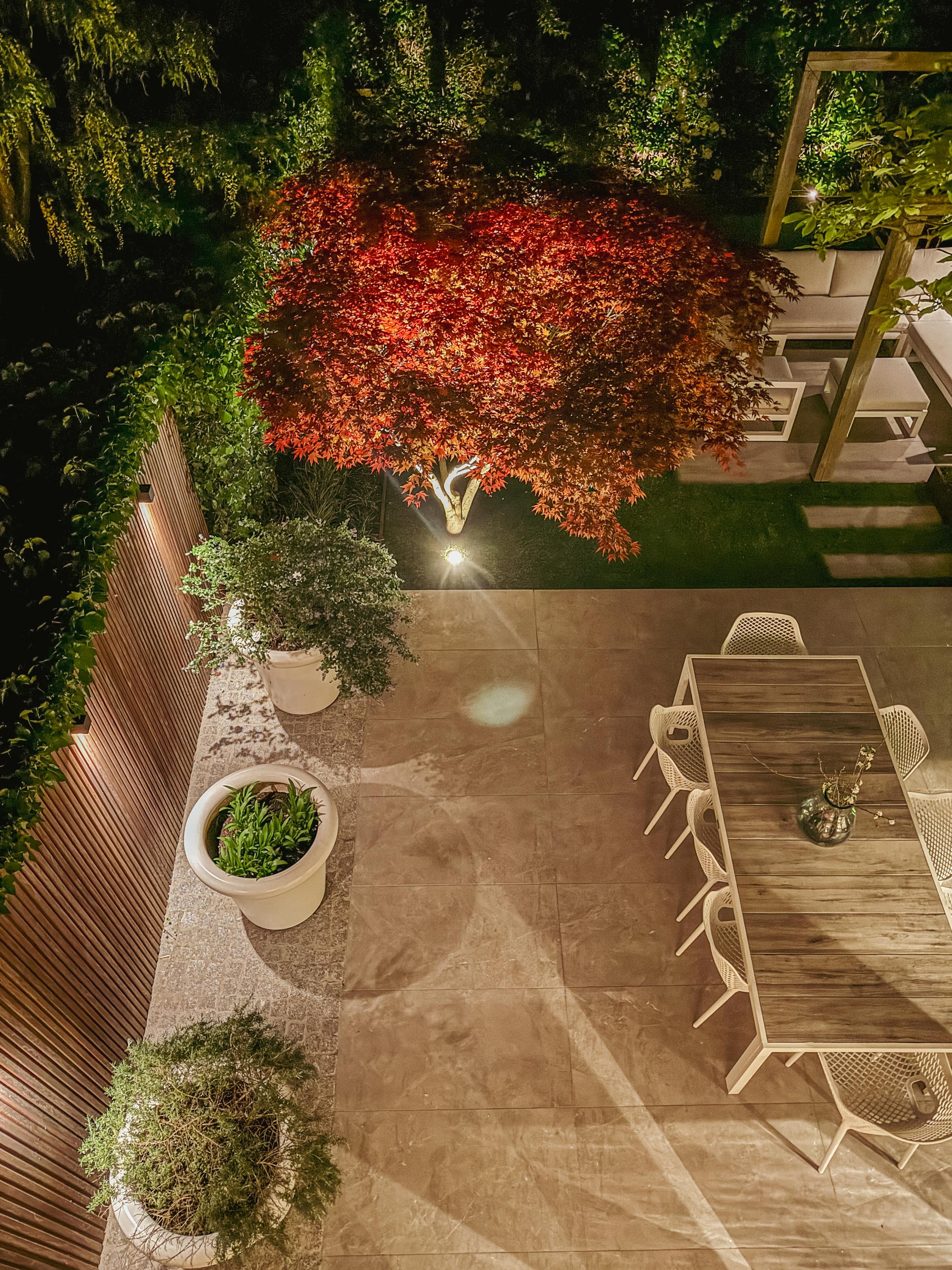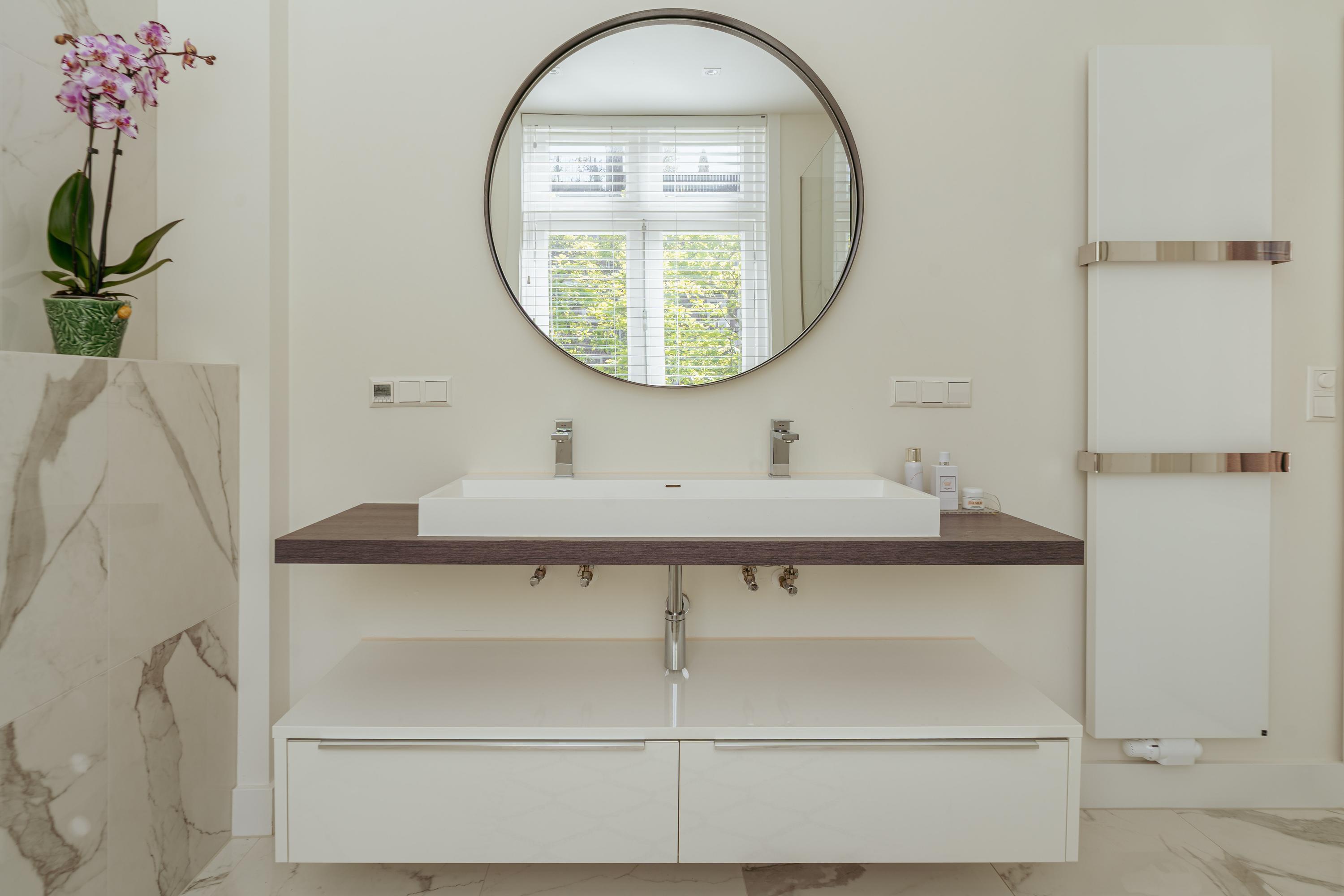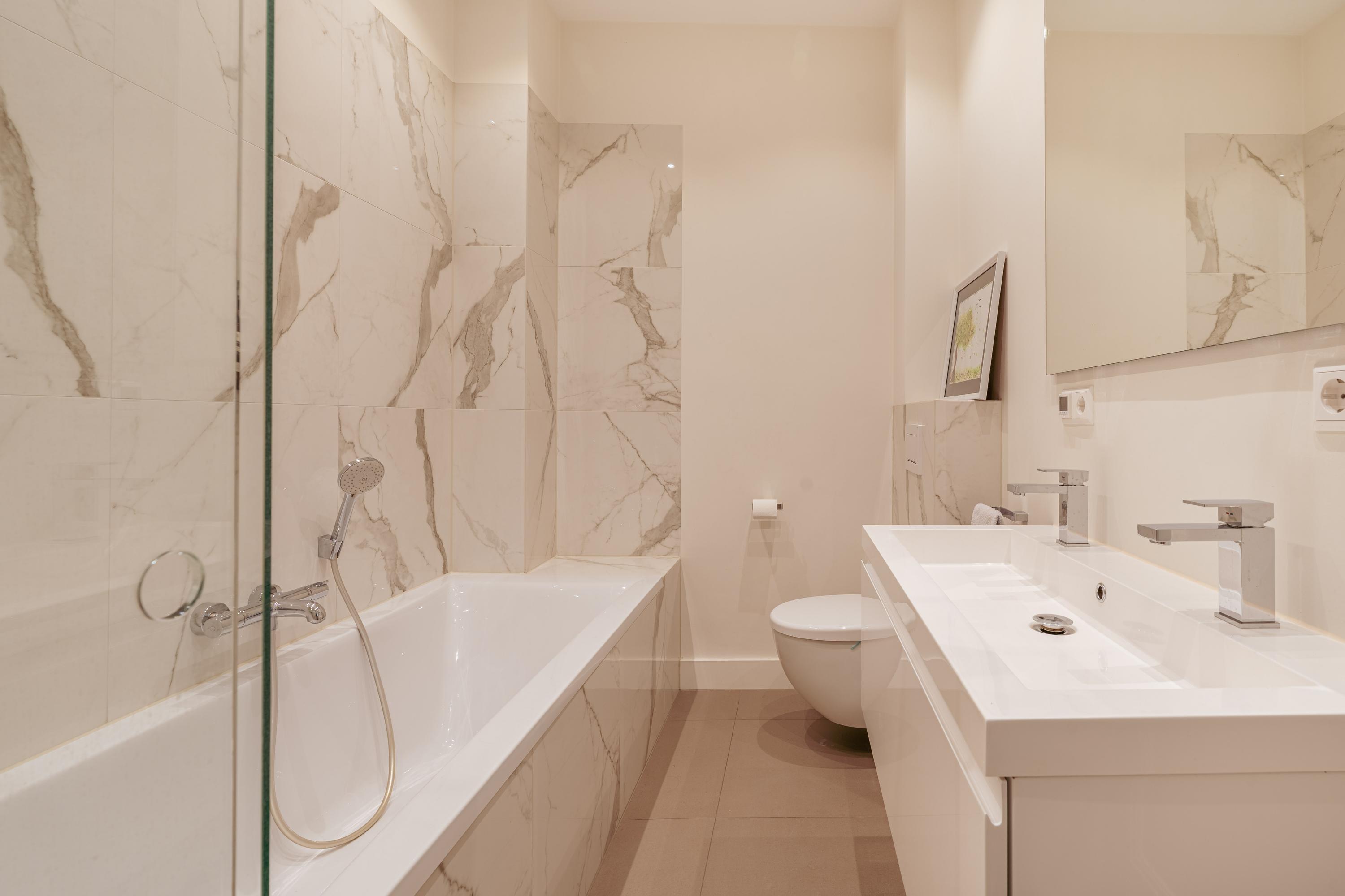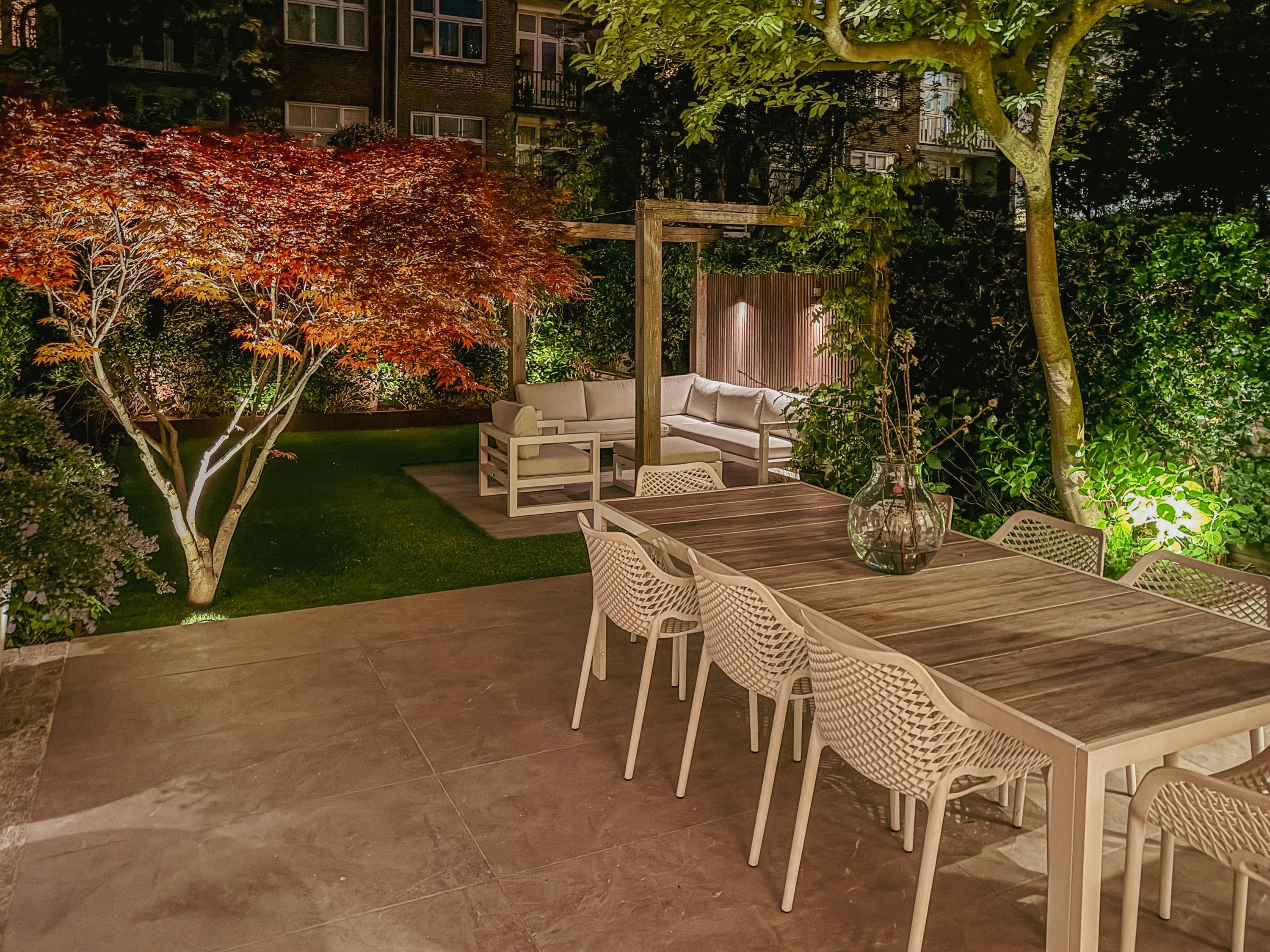 Via your private entrance, you enter this stylish home. Behind the vestibule with beautiful marble accents, you’ll find a spacious hallway, which includes a separate toilet. The expansive living room stretches the full depth of the home: at the front is a cozy sitting area, while at the rear you’ll find the dining area with an open kitchen. The modern kitchen is fully equipped and features a large island, a 5-burner gas stove, sink, freezer, refrigerator, and oven. Both the kitchen and dining area provide direct access to the beautiful west-facing rear garden. This landscaped garden offers plenty of sun well into the evening—an ideal spot for relaxing or outdoor dining.