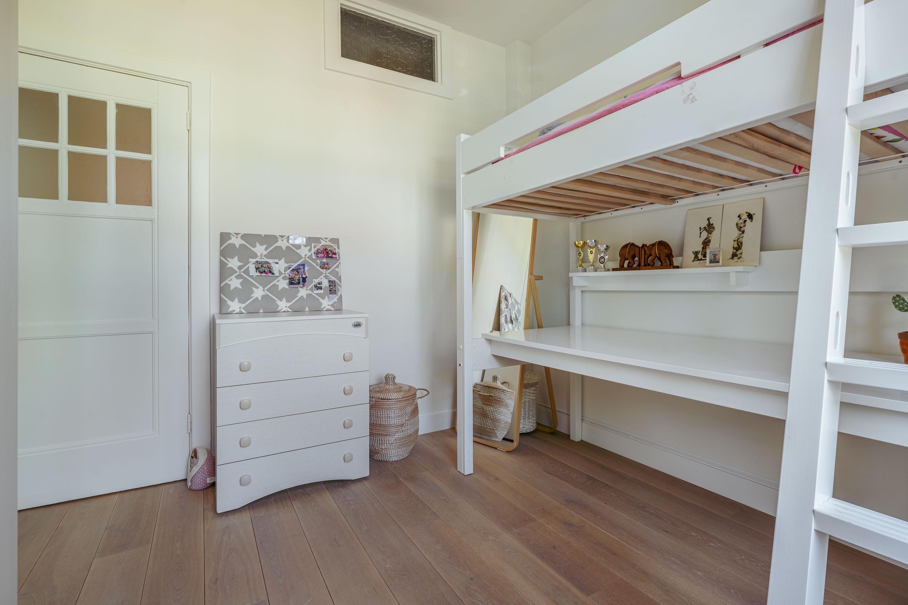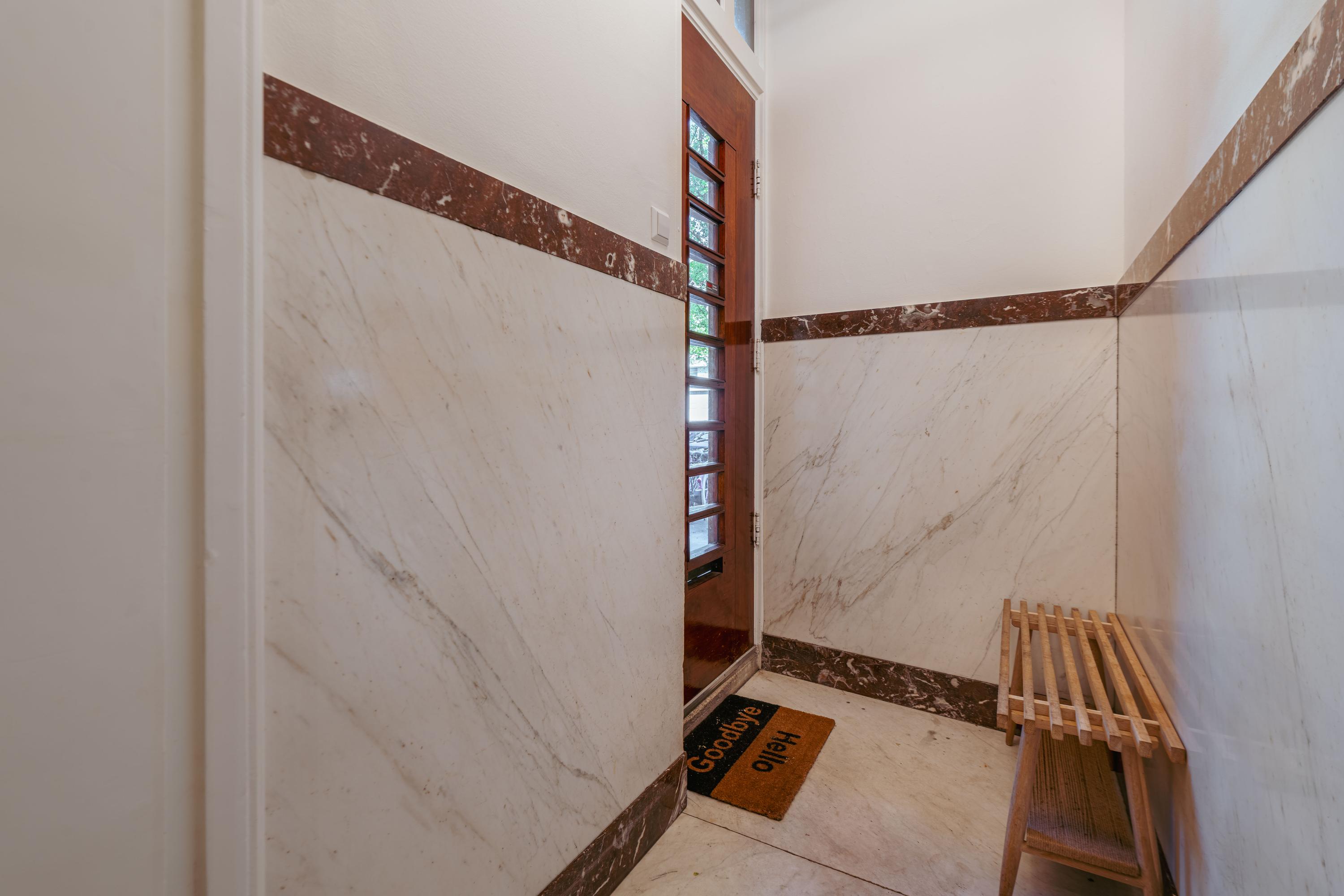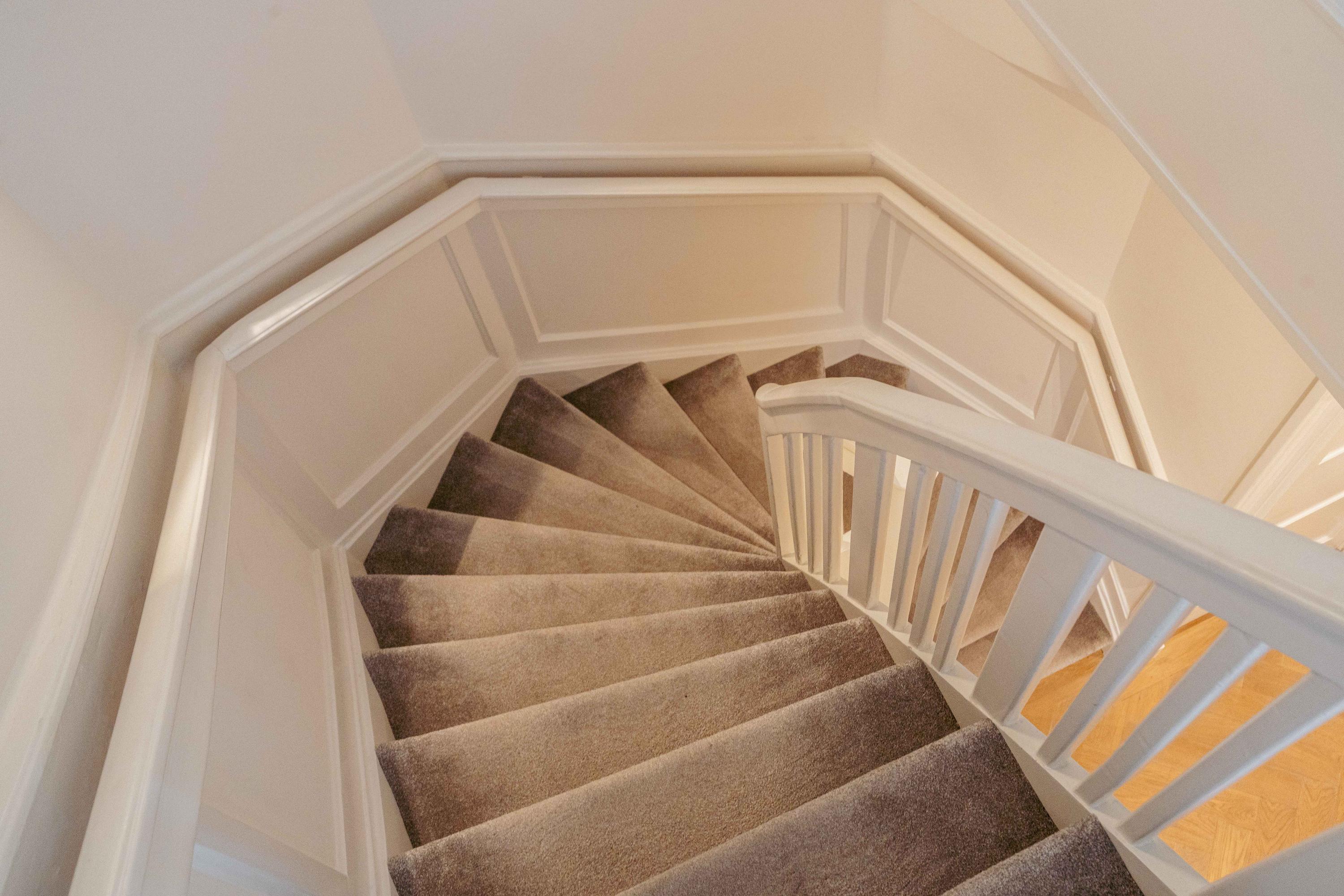 The landing on the first floor provides access to three bedrooms and two bathrooms. At the front are two generously sized bedrooms, one of which features a charming bay window. The master bedroom at the rear is complete with a spacious walk-in closet and luxurious en-suite bathroom, equipped with underfloor heating, double washbasins, a walk-in shower, and toilet. French doors open onto the west-facing balcony. There is also a second, equally luxurious bathroom accessible from the hallway, with a bathtub, underfloor heating, shower, toilet, and double washbasin.