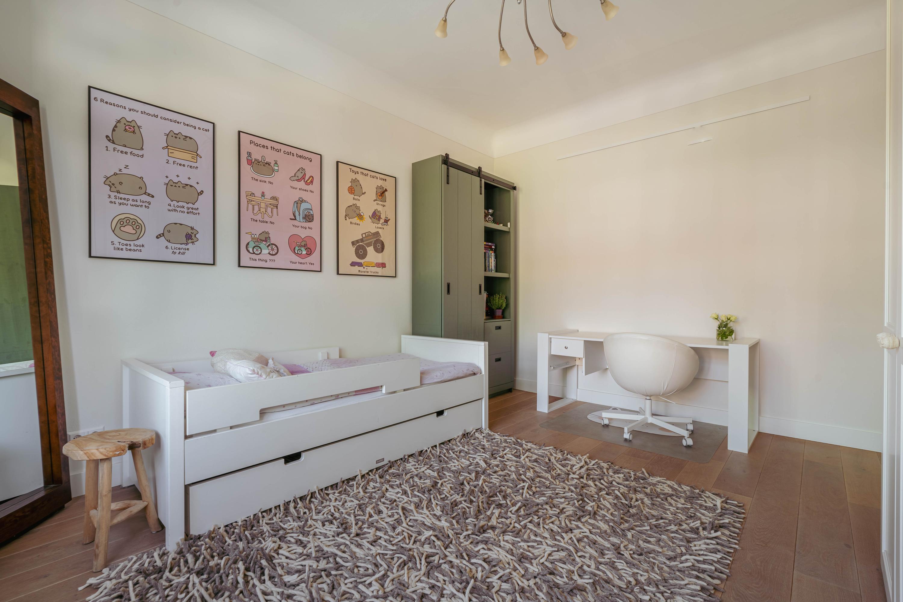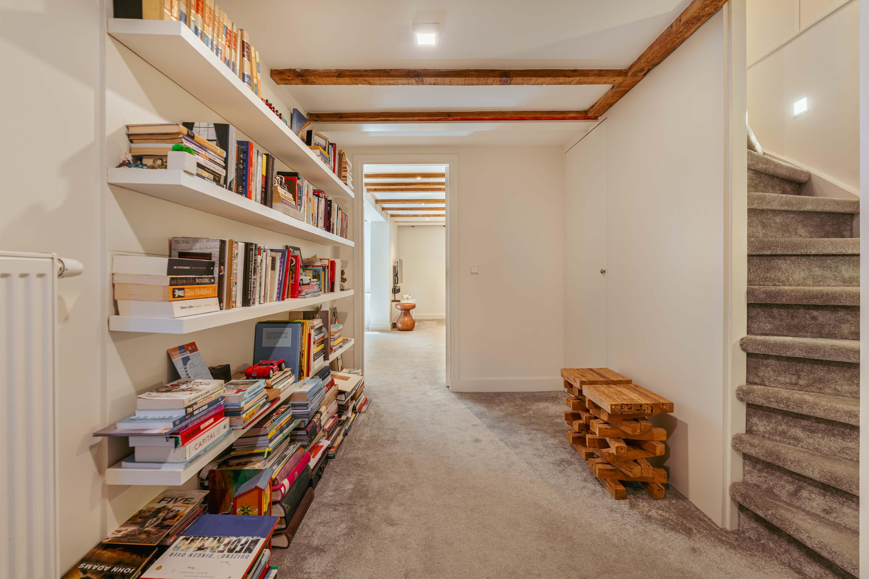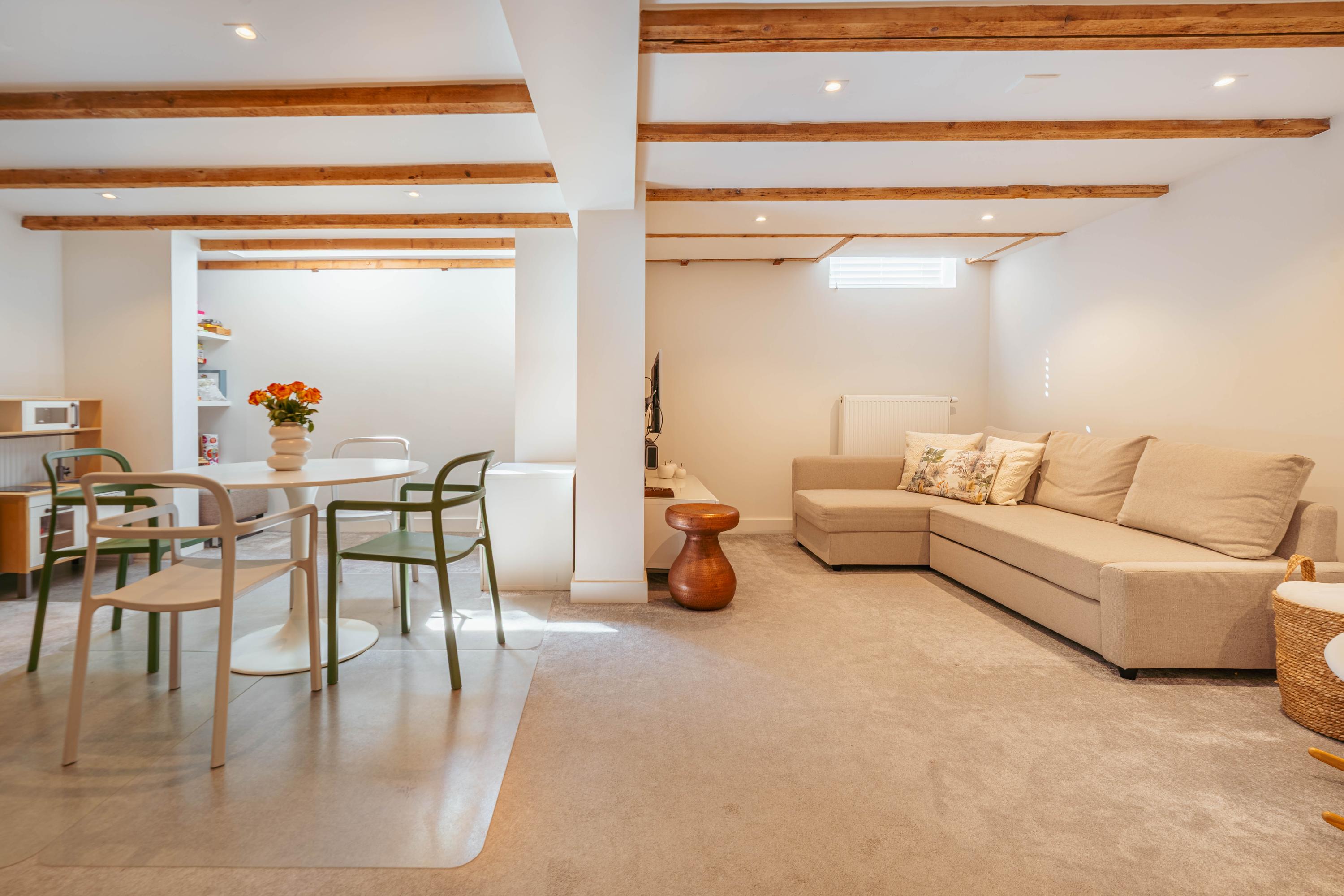 The staircase in the hallway leads to the basement level, which offers a surprising amount of space and character. The landing includes practical built-in cupboards and a separate storage room. At the rear is a spacious bedroom, currently used as a play and TV room. In the center of the basement is a well-maintained bathroom with a shower, toilet, and vanity. At the front is a large utility room with a sink, connections for a washing machine and dryer, and ample storage space. The attractive wooden ceiling beams lend this floor a distinctive charm.