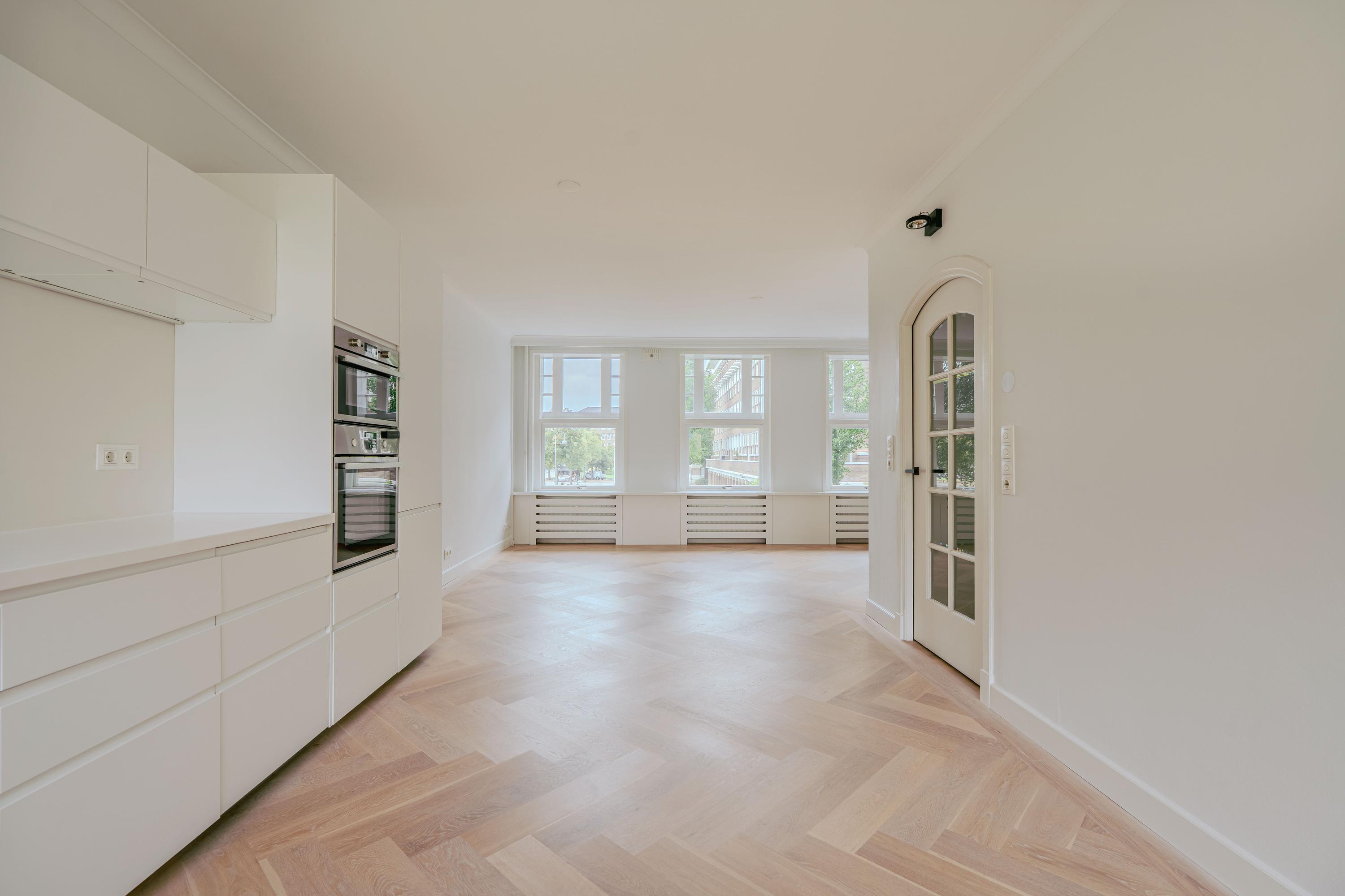 Via the well-maintained communal entrance with staircase and lift, you reach the apartment on the first floor. You enter into a spacious hallway from which all rooms are accessible. The living room is laid out in an L-shape and is particularly bright thanks to the many windows overlooking the beautiful Minervaplein. At the rear is the open kitchen, fitted with all necessary built-in appliances. The balcony is accessible from the kitchen and overlooks the beautifully landscaped garden of the Muzenhof.