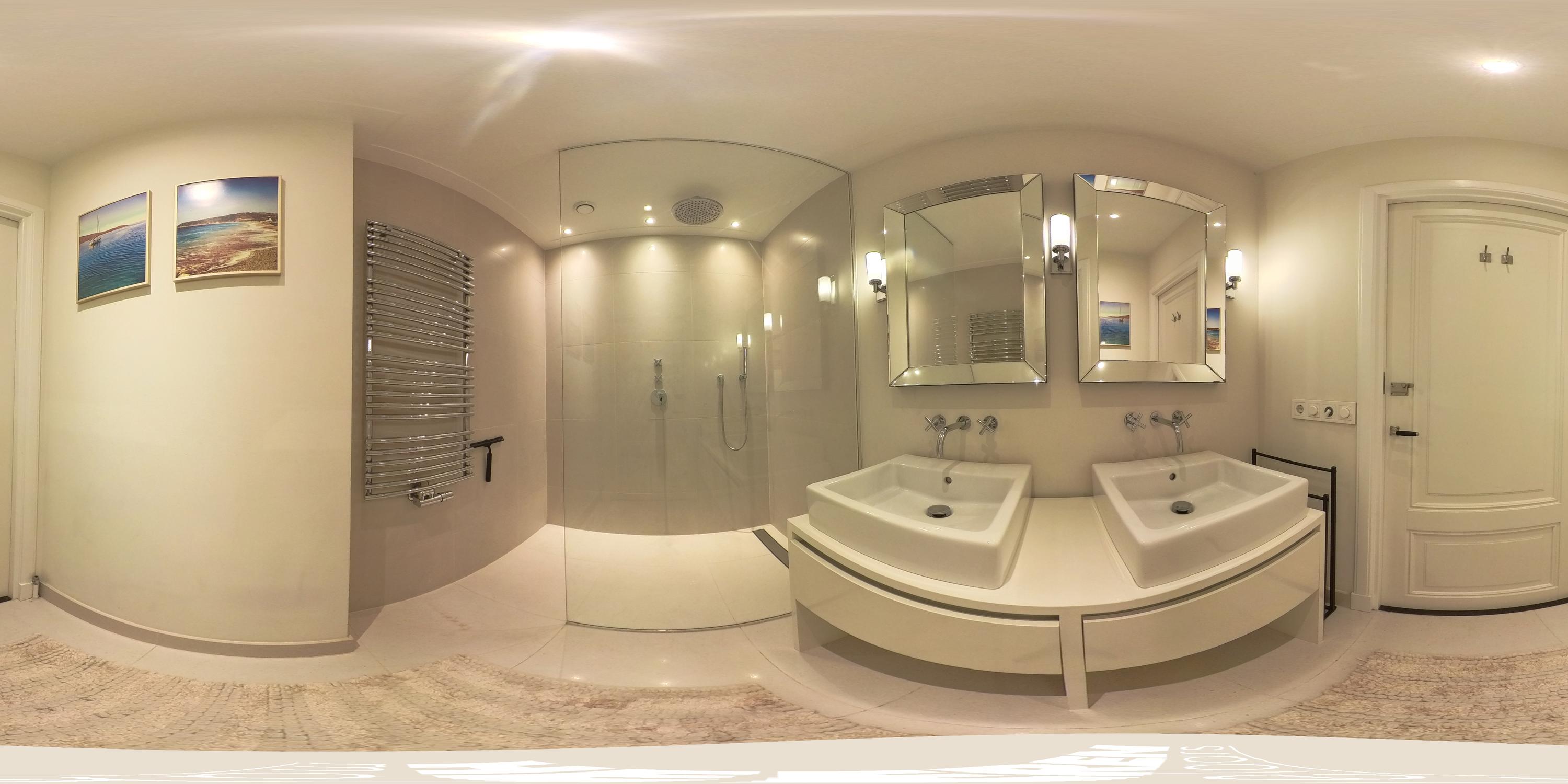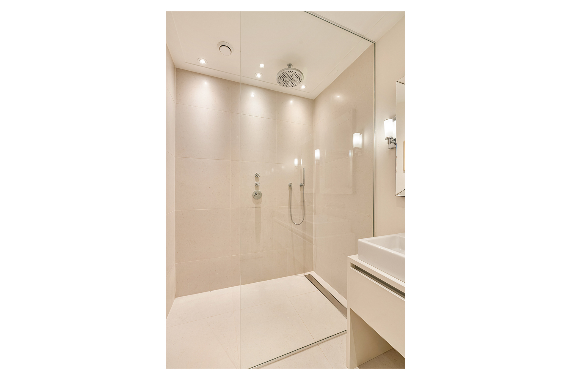 The well-appointed bathroom features a walk-in rain shower, double vanity unit, and underfloor heating.