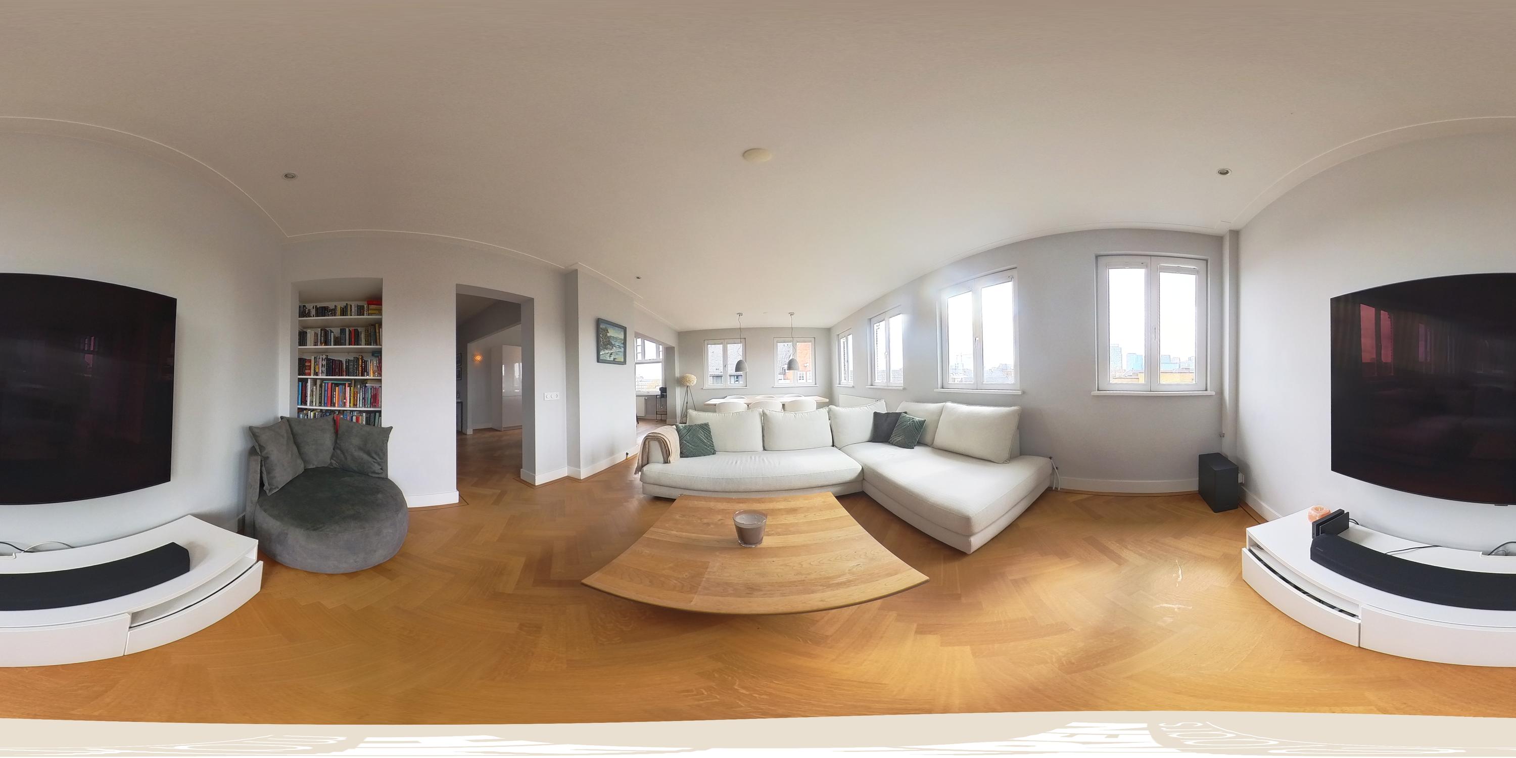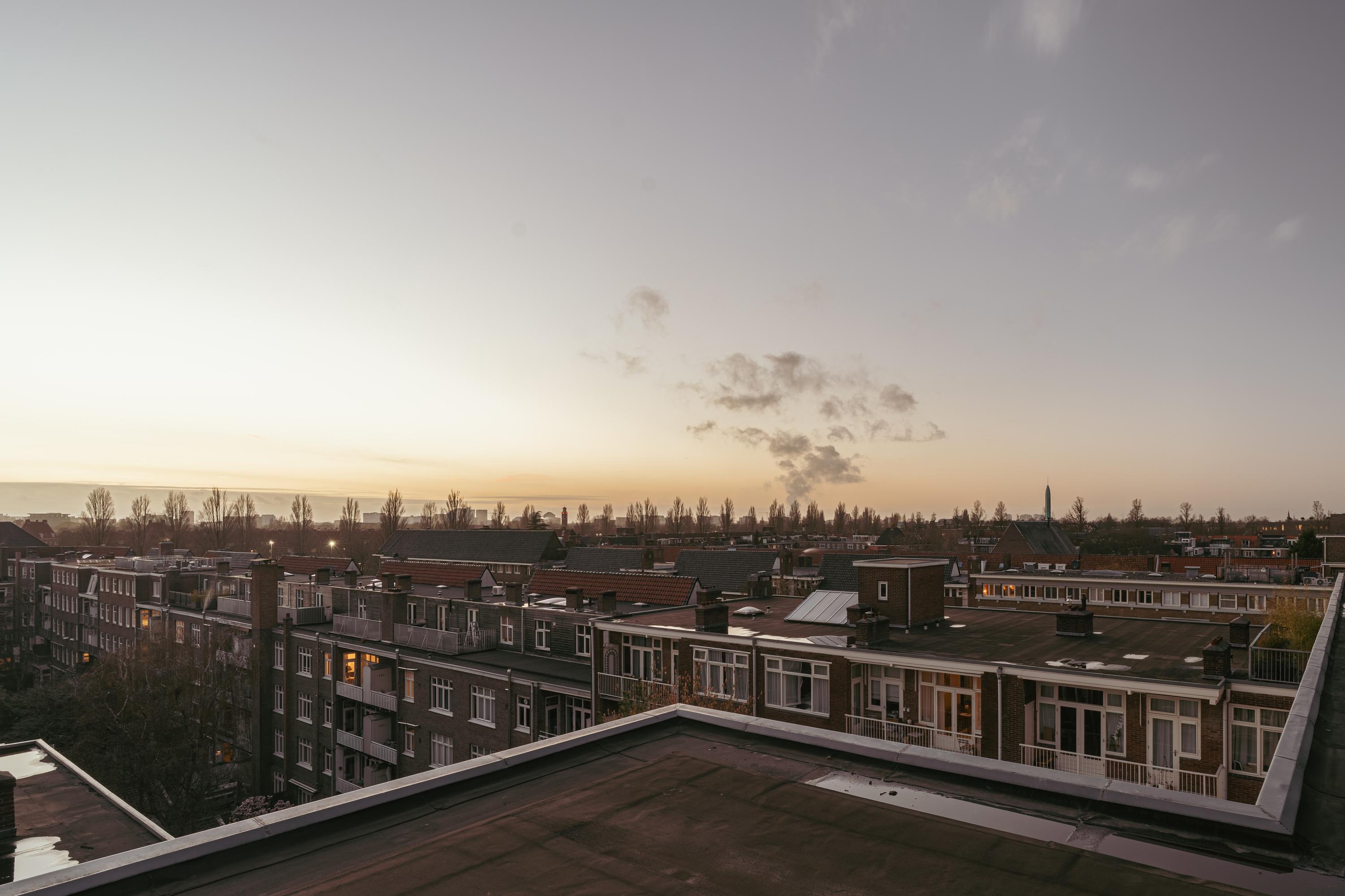 The adjacent living room fully benefits from its corner position and is exceptionally bright thanks to no fewer than eight windows. The unobstructed views over Minervaplein, Michelangelostraat, and the Zuidas skyline are impressive—especially atmospheric in the evening.