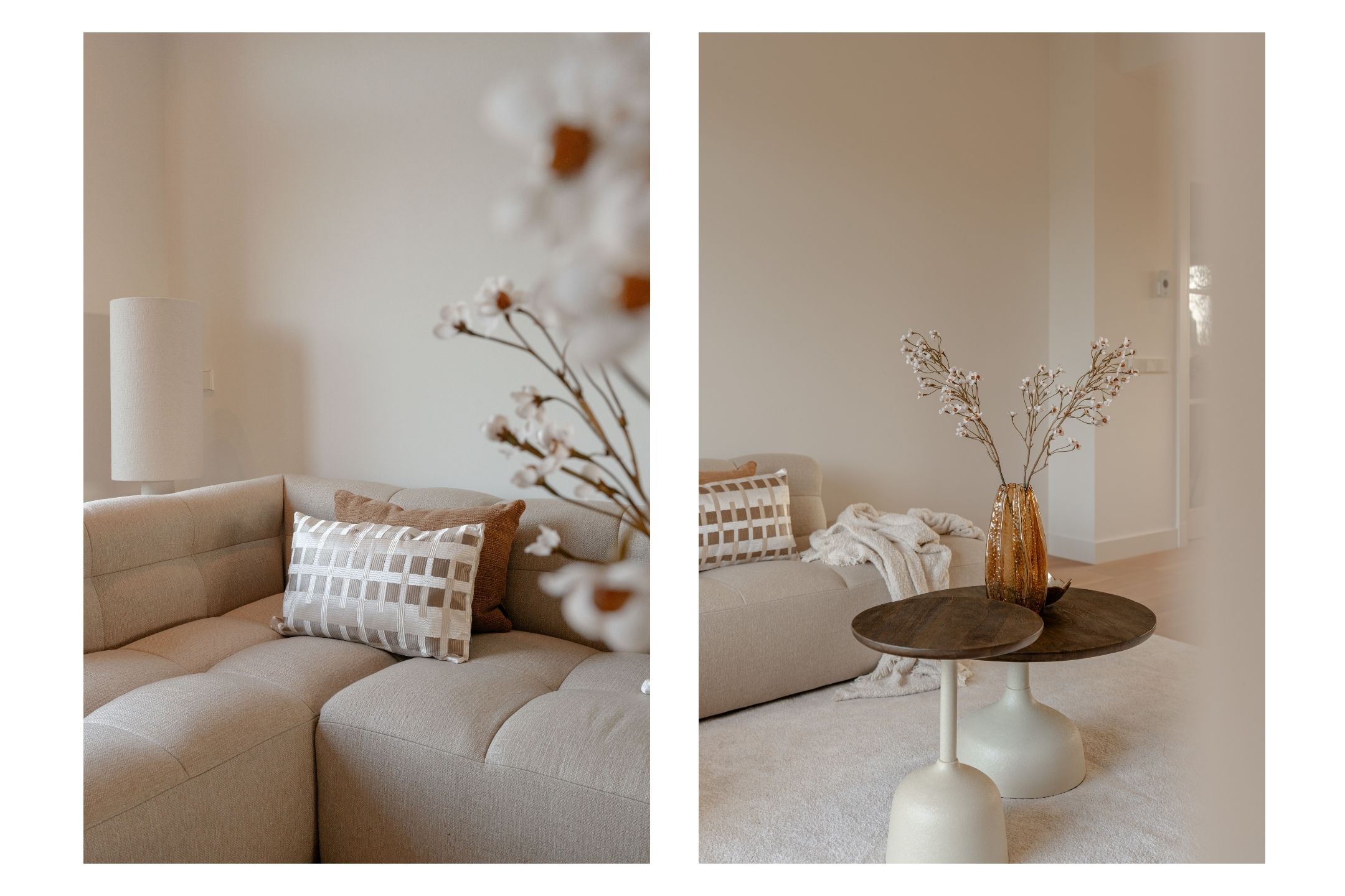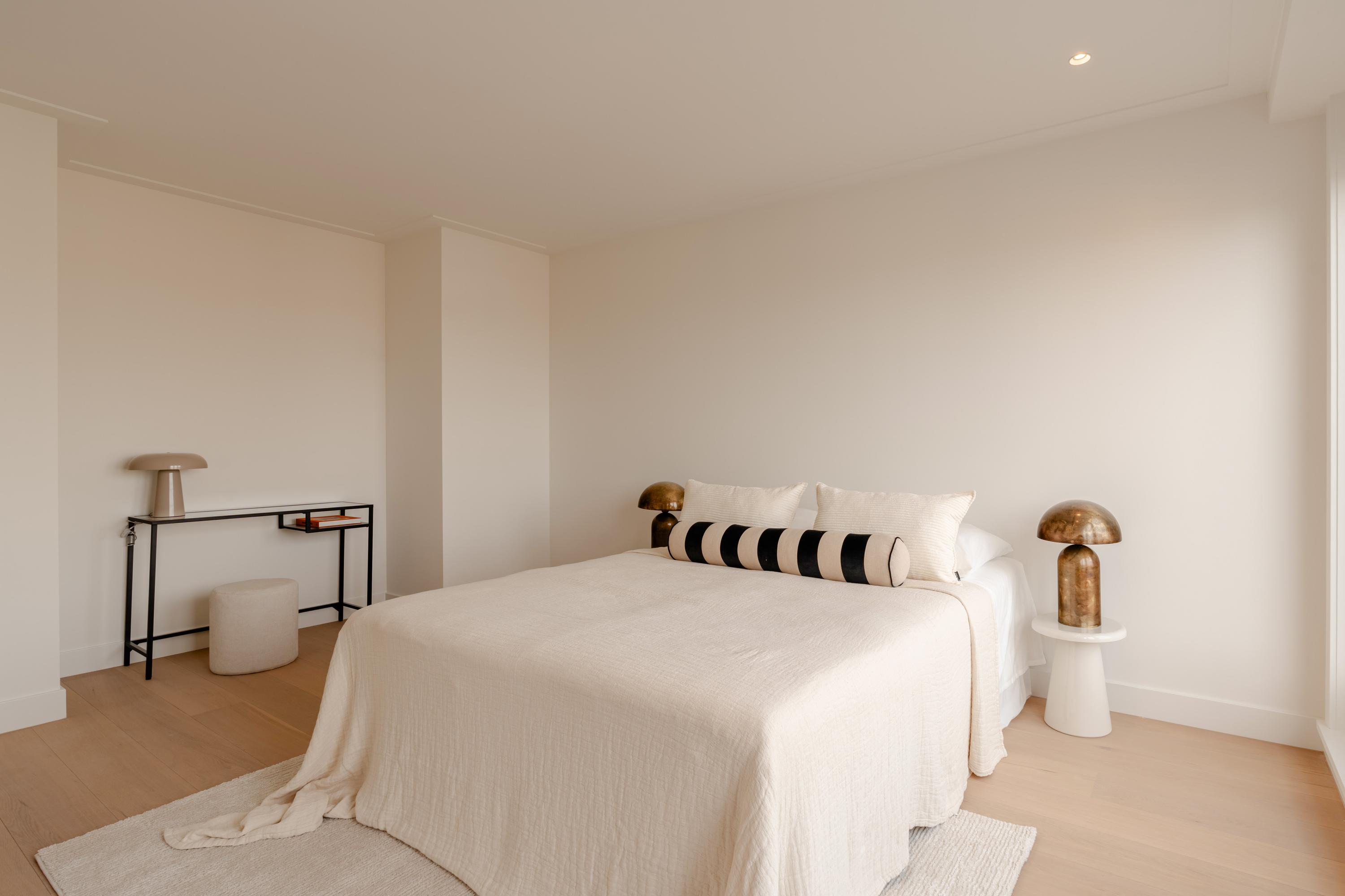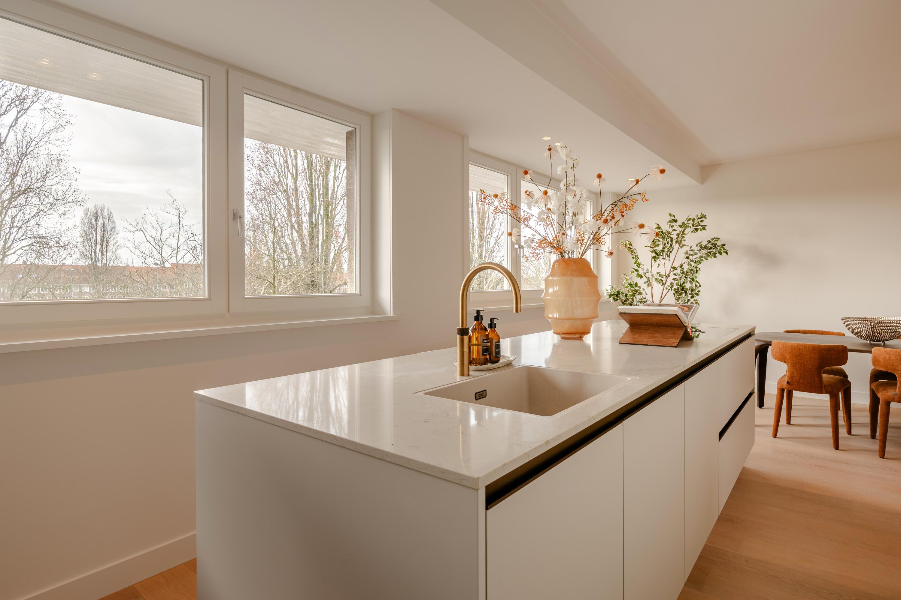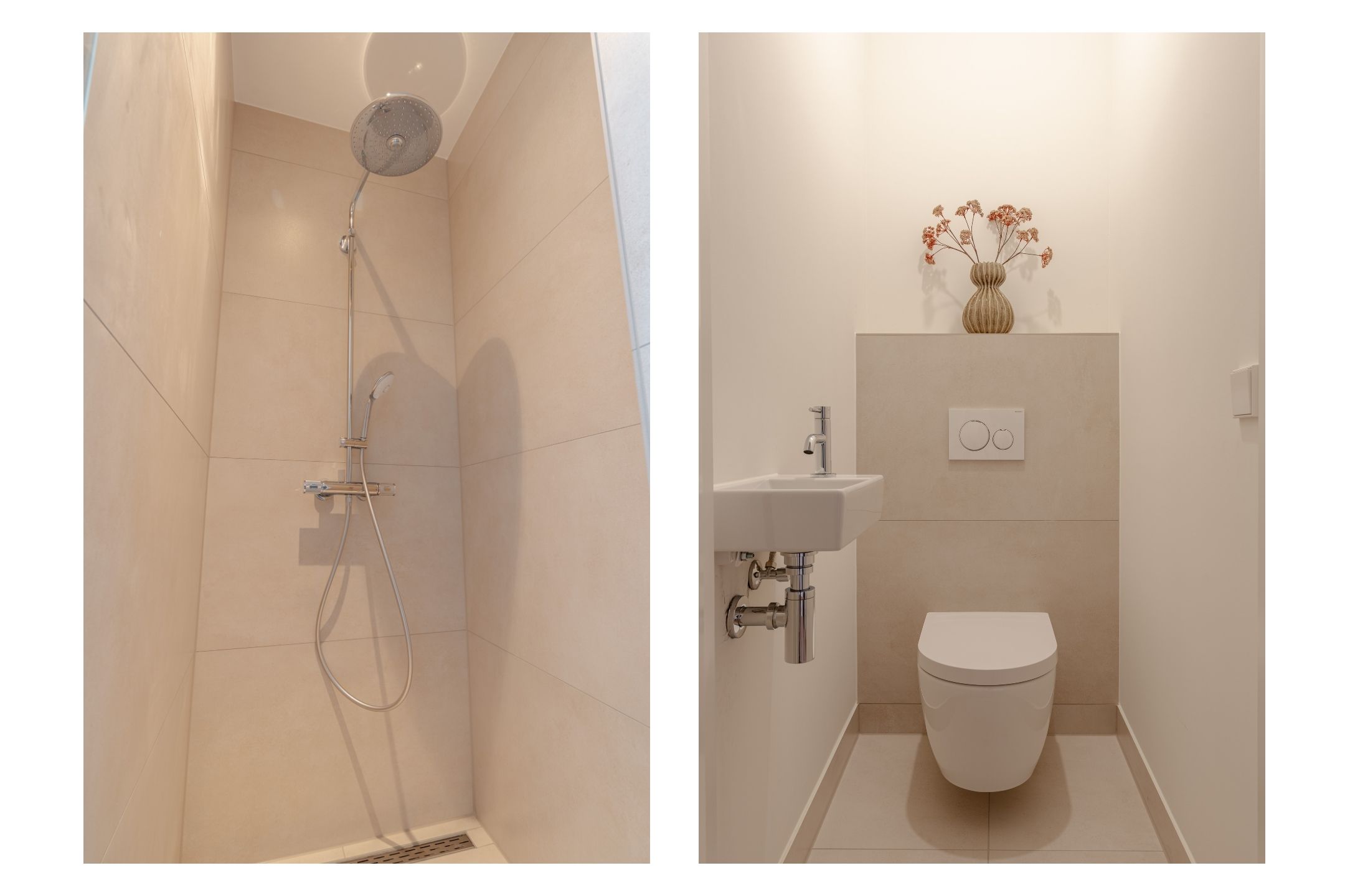 The open-plan kitchen is a true eye-catcher, fitted with high-quality built-in appliances: an induction hob with integrated extractor, dishwasher, combi-oven and Quooker tap. The combination of sleek handleless cabinetry and warm wooden accents gives this floor a modern yet inviting feel. From the living room you have access to a sunny southeast-facing balcony, perfect for a morning coffee or an afternoon drink in the sun.