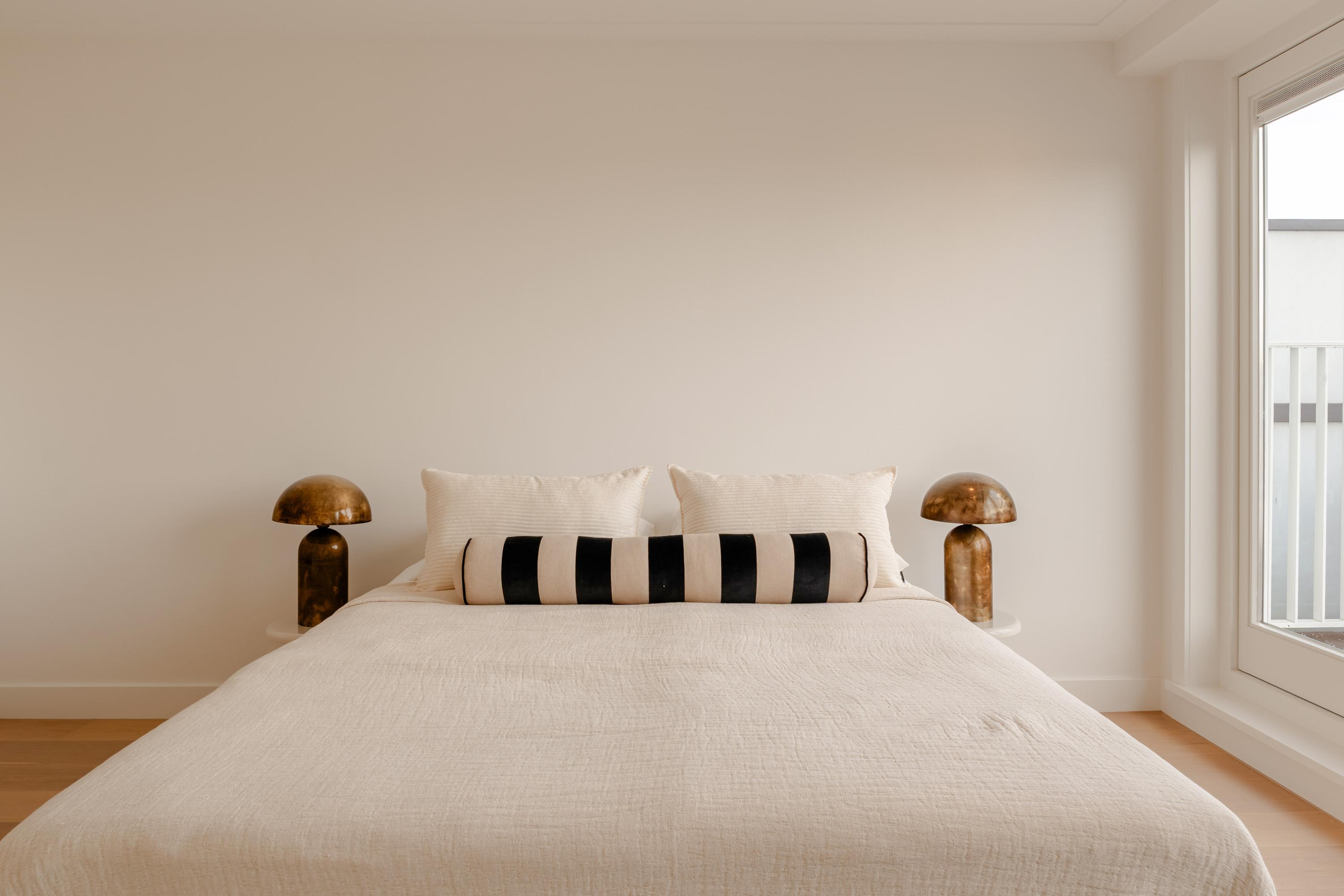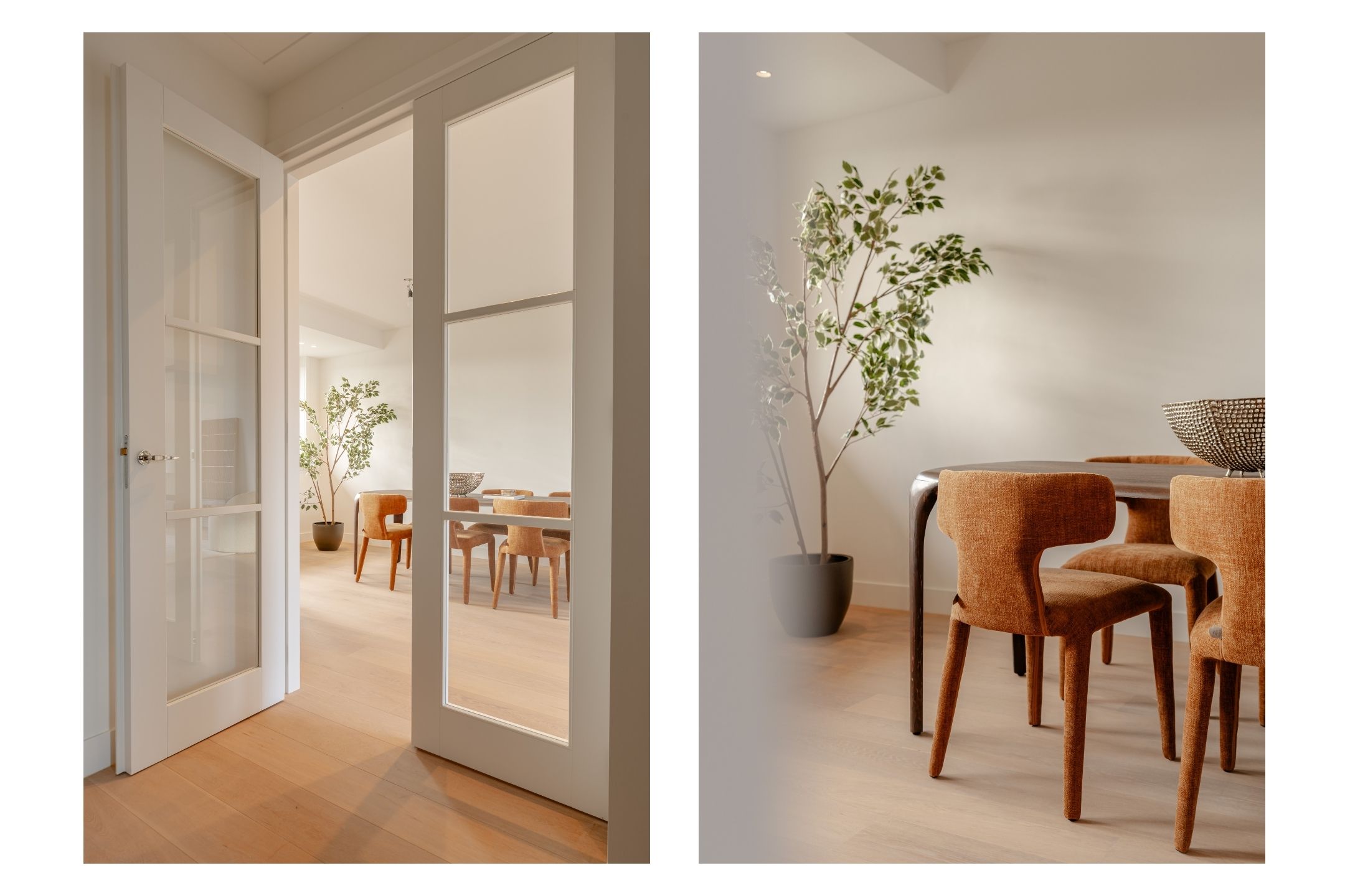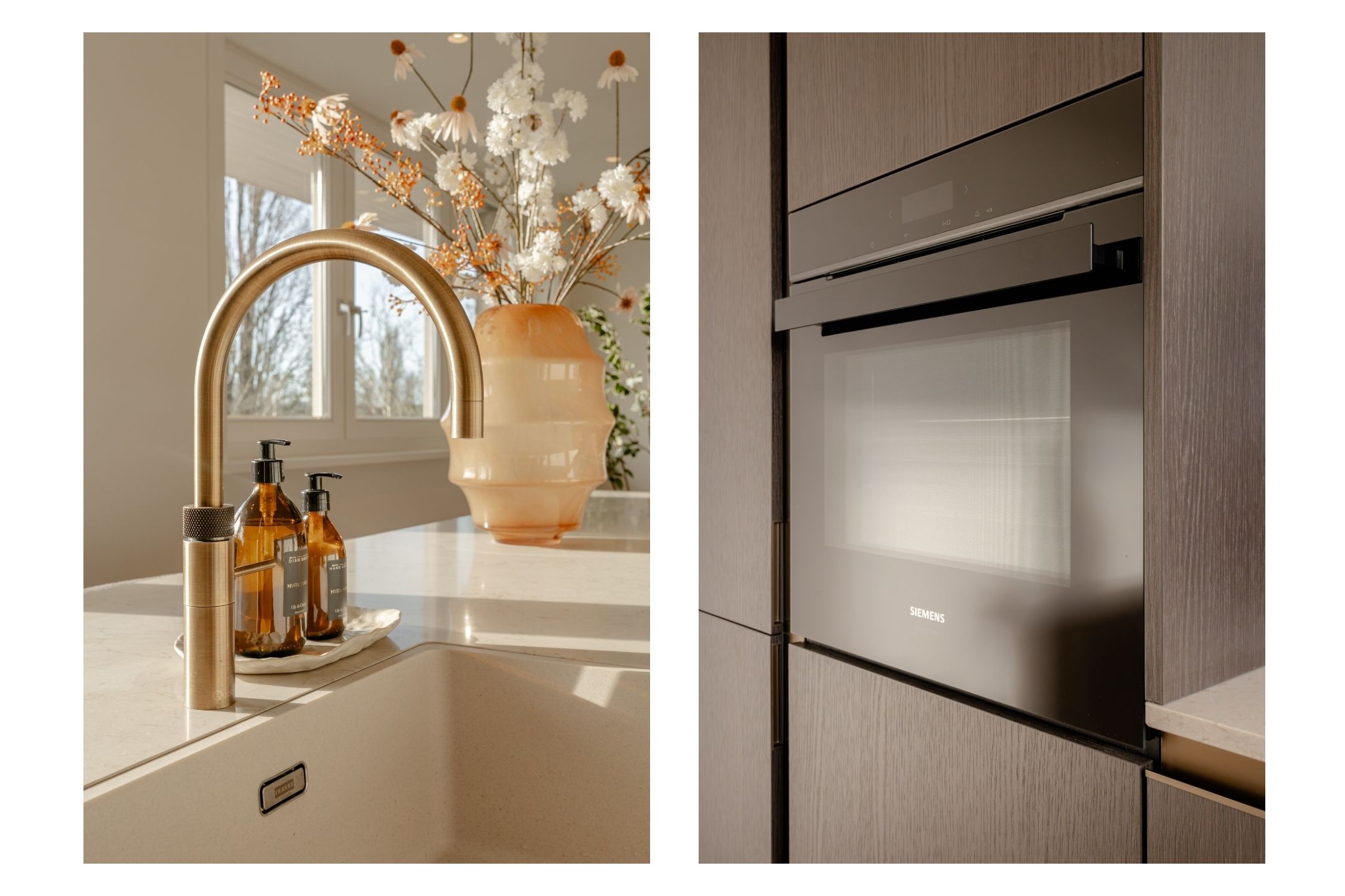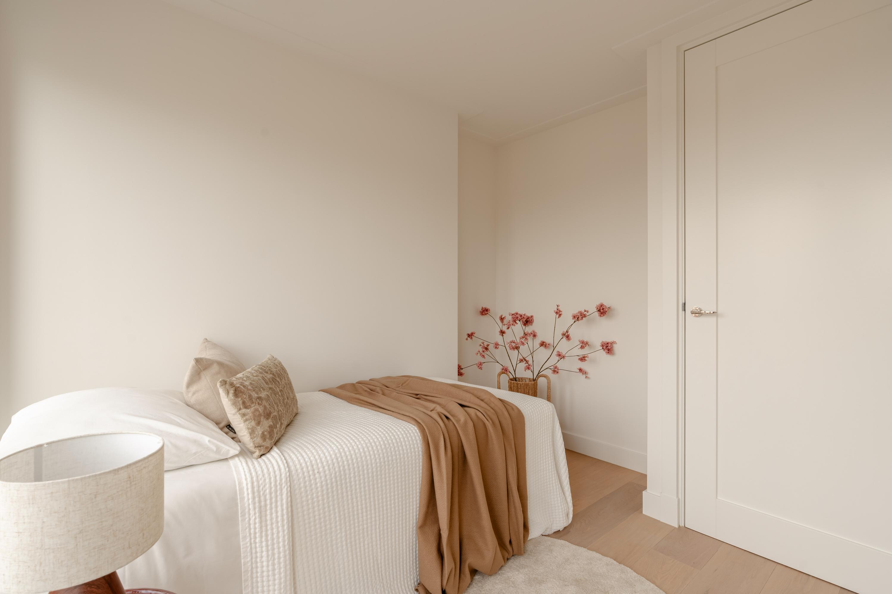 The open-plan kitchen is a true eye-catcher, fitted with high-quality built-in appliances: an induction hob with integrated extractor, dishwasher, combi-oven and Quooker tap. The combination of sleek handleless cabinetry and warm wooden accents gives this floor a modern yet inviting feel. From the living room you have access to a sunny southeast-facing balcony, perfect for a morning coffee or an afternoon drink in the sun.