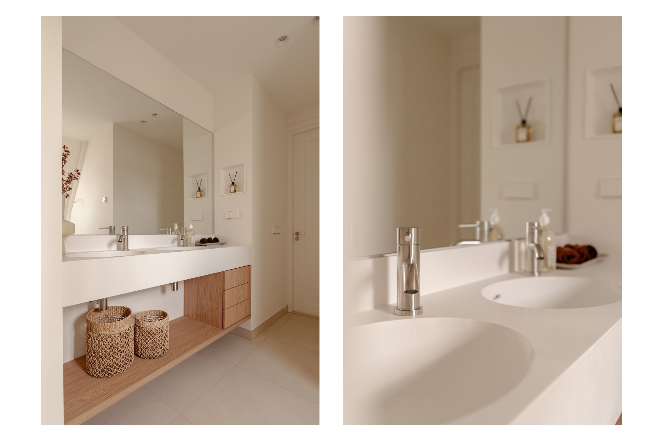 The fourth floor accommodates the master bedroom, which has French doors opening onto a delightful terrace running the full width of the property—an ideal spot to enjoy the sun and the view in peace. At the rear you’ll find a second bedroom, also with access to the terrace. The modern bathroom is fully equipped with a bathtub, shower and double washbasin. On this floor you will also find a separate WC, a practical laundry room for washing machine and dryer, and additional storage space.