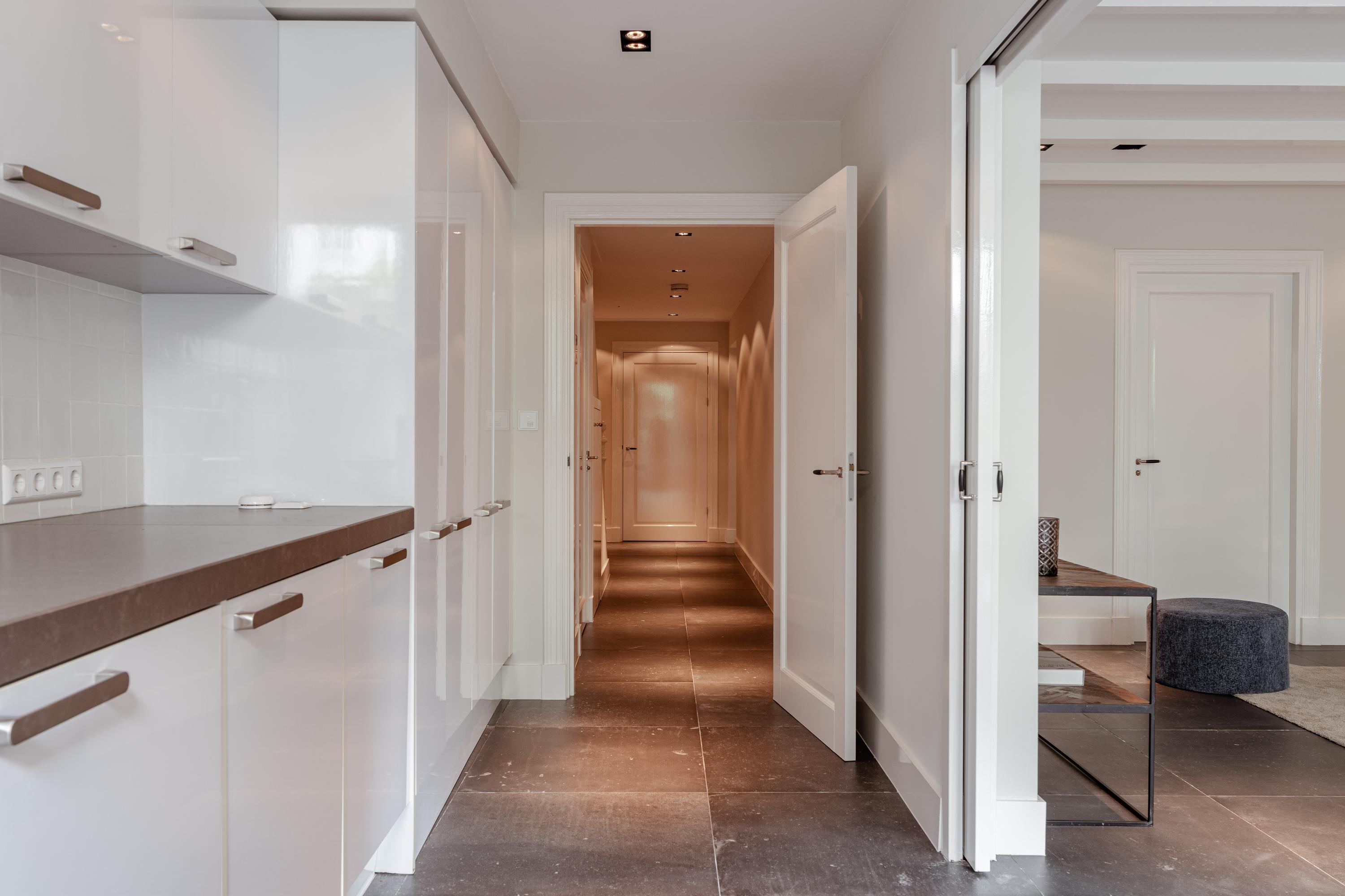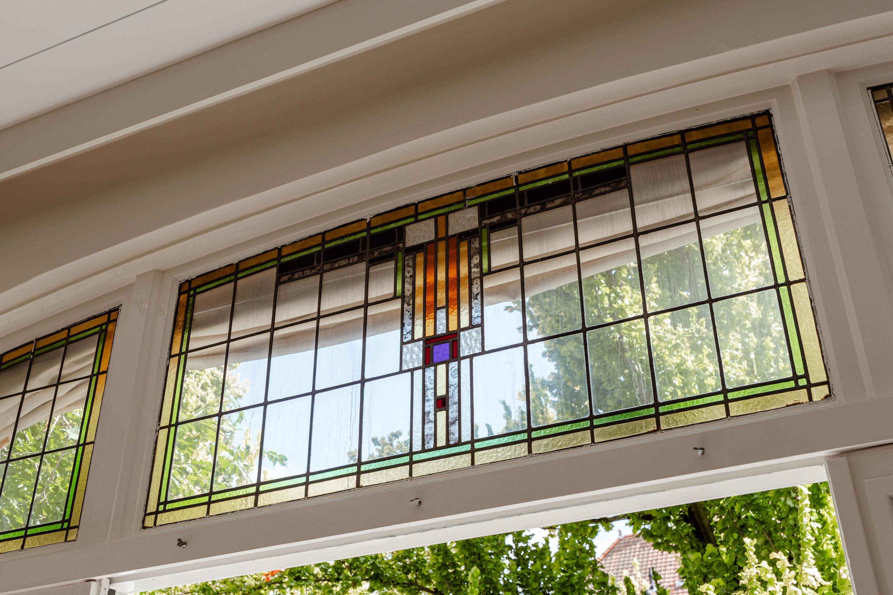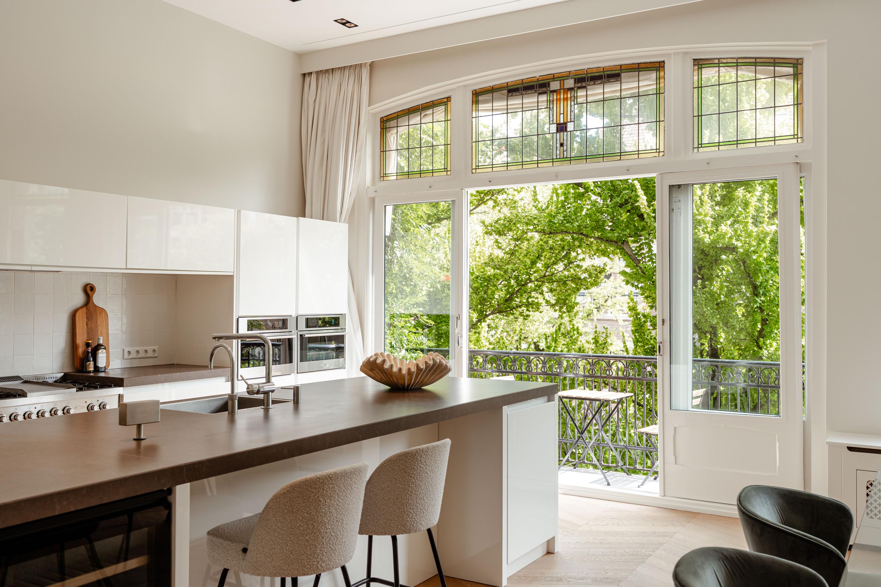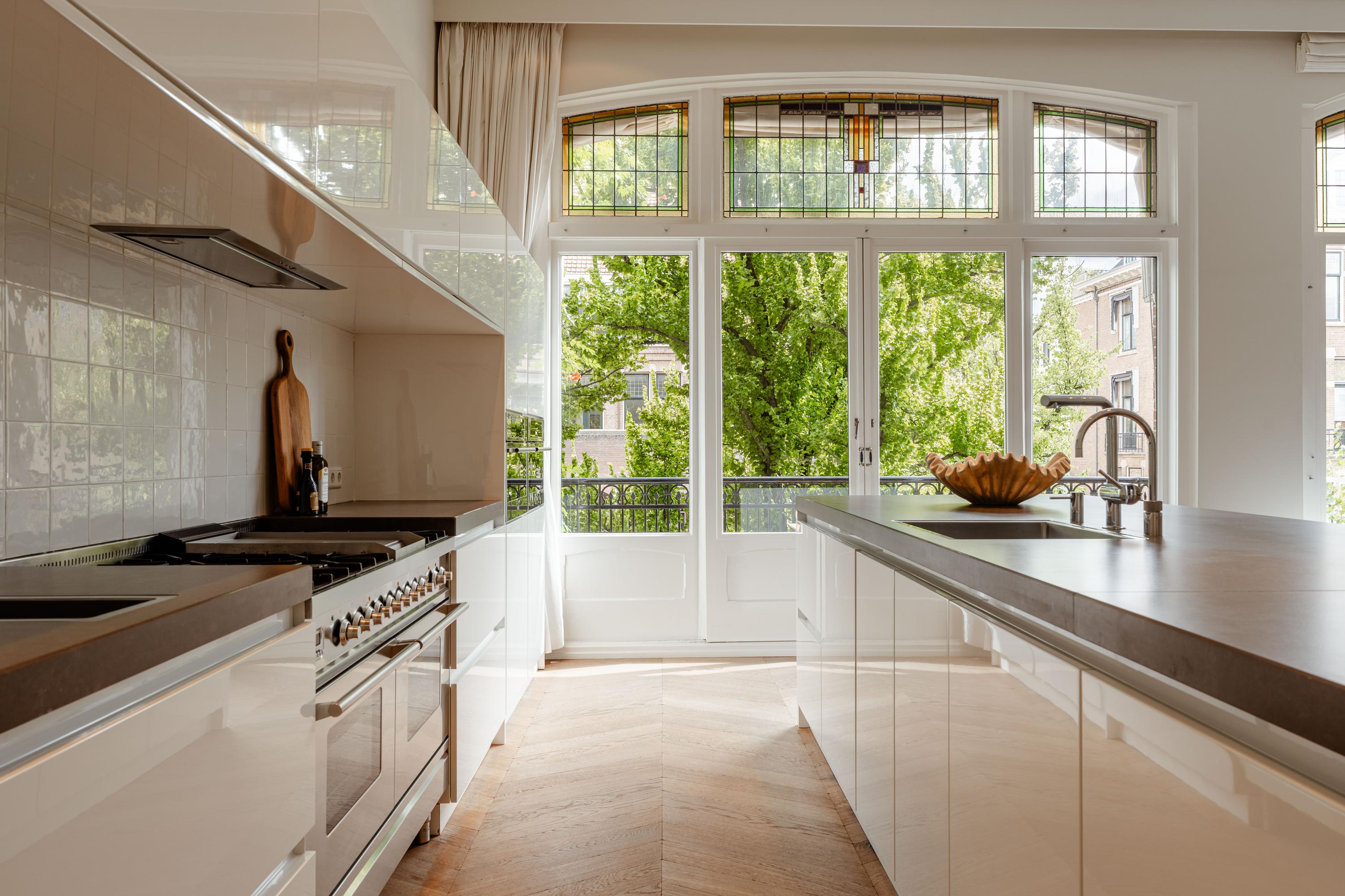 Accessible via the elevator or through the private entrance on the first floor, you are welcomed into the impressive main living level. The spacious living room immediately stands out, featuring large windows that flood the space with natural light and create an elegant atmosphere. At the front lies the luxurious open kitchen, a true eye-catcher, complete with a generous cooking island with wine climate cabinet, double sink with Quooker, and top-quality built-in appliances: two ovens, a full-size refrigerator, and a separate freezer. Designed to meet the needs of the culinary enthusiast, this kitchen forms the vibrant heart of the home. From here, you have access to the balcony adorned with original stained-glass windows – the perfect spot for a relaxed breakfast in the morning sun. This floor also offers a cloakroom and a separate guest toilet.