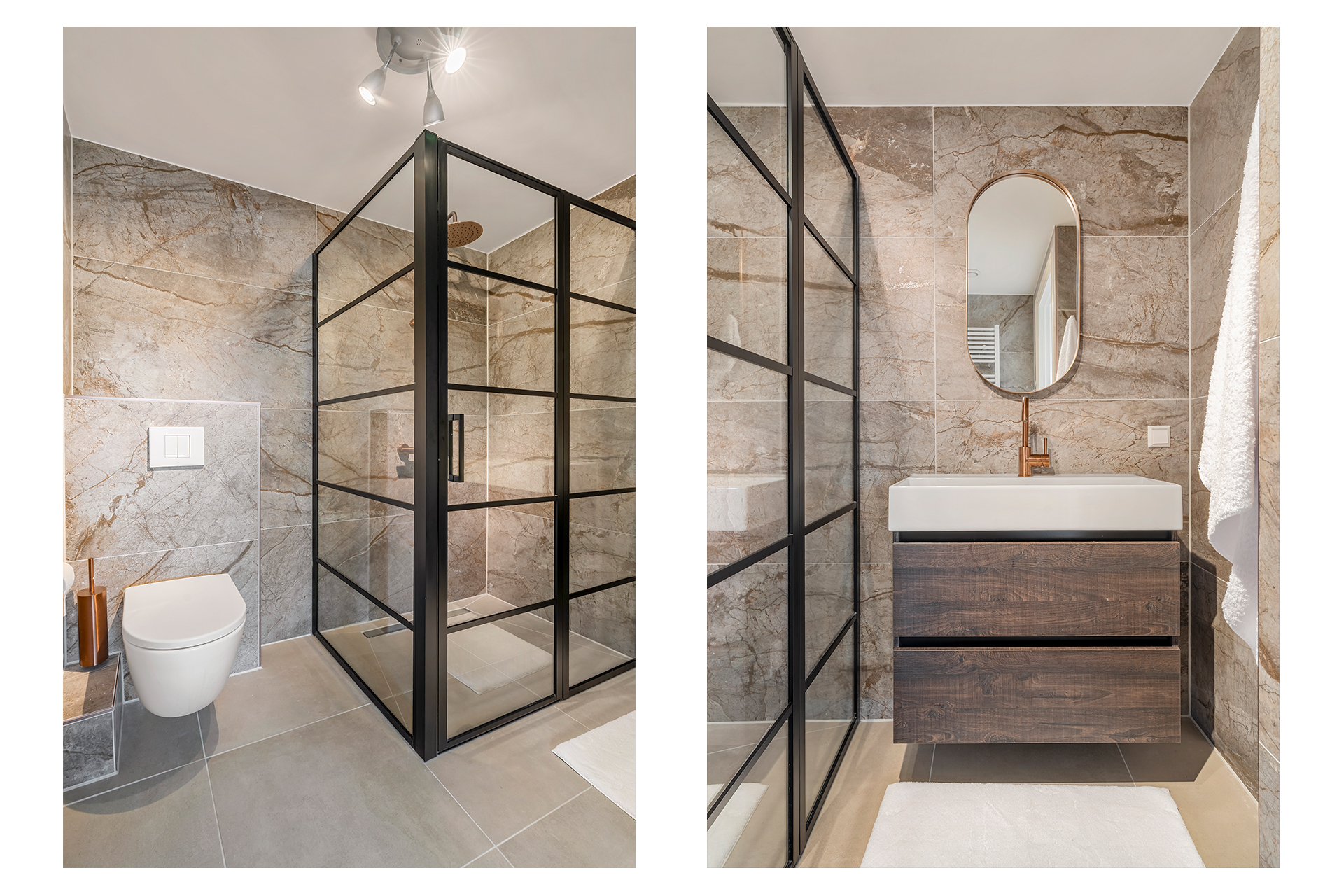 The centrally located bathroom is fitted with a shower, toilet and washbasin. In addition, there is a separate utility room with space for a washing machine and dryer. From here, there is access to the communal area with the storage units of the other apartments.