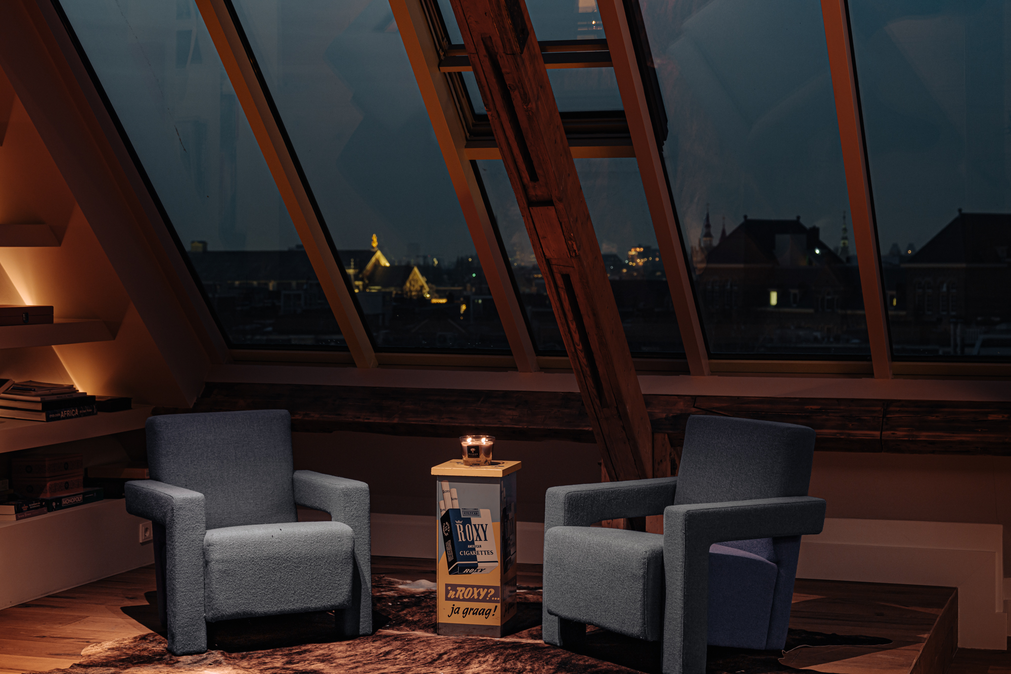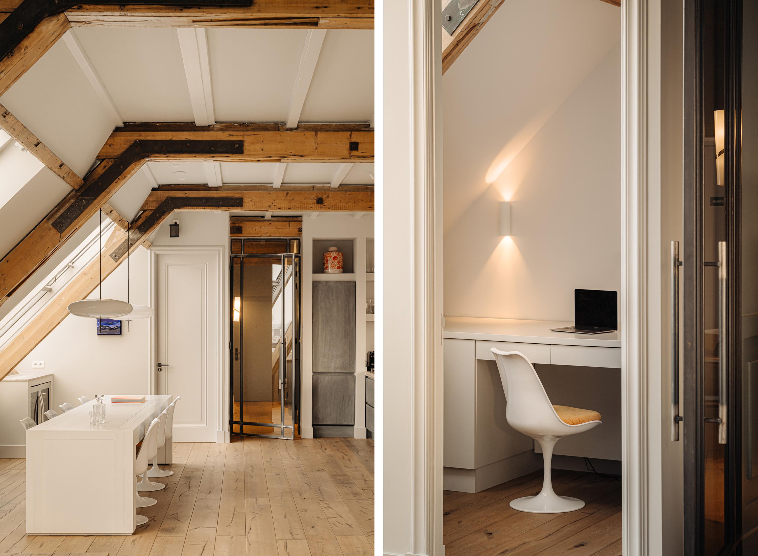 Upon entering, you immediately notice the spacious and light-filled design of the apartment. The living room features a charming south-facing balcony and large windows on both sides, allowing plenty of natural light and offering a panoramic view of the city. The visible wooden beams add character, while the elevated seating area creates a cosy space to relax. An air conditioning unit is installed above the kitchen, which boasts a large cooking island with a natural stone worktop and high-end built-in appliances, including a four-burner induction hob with extractor, a dishwasher, a fridge-freezer combination, a Quooker, and a built-in wine climate cabinet. A stylish raised bar area is integrated into the kitchen island. The dining area comfortably accommodates a large table, benefiting from ample natural daylight through the expansive windows.