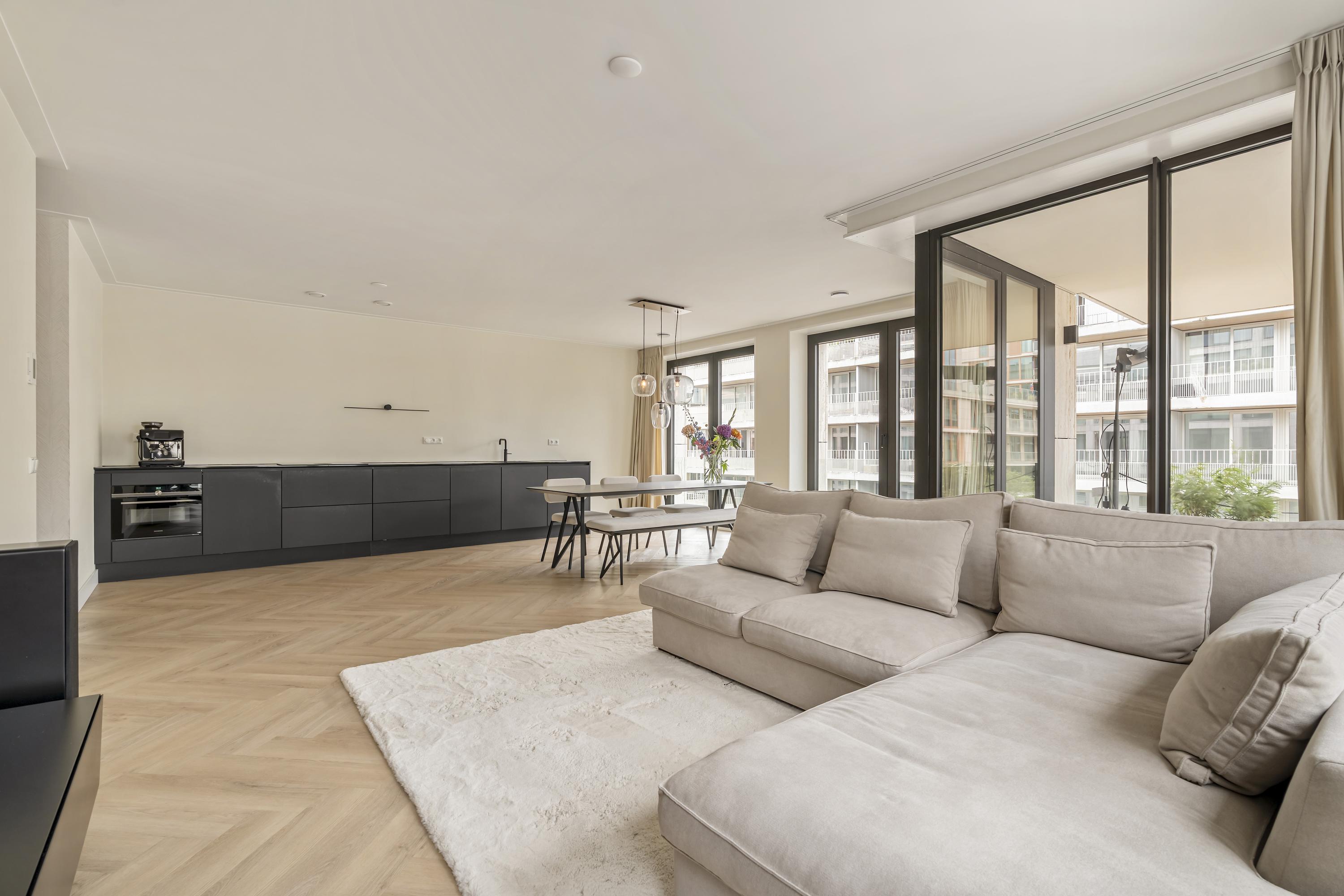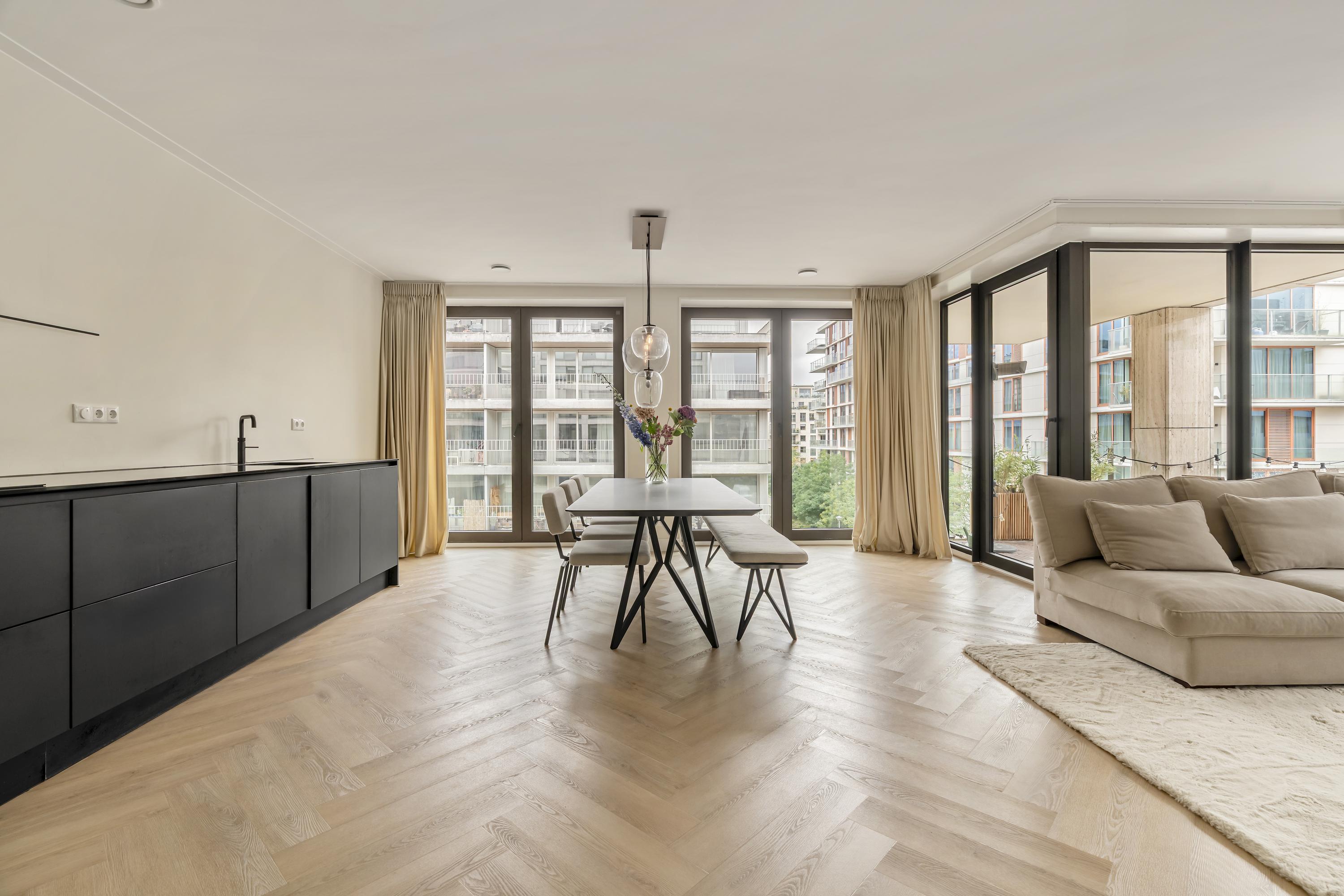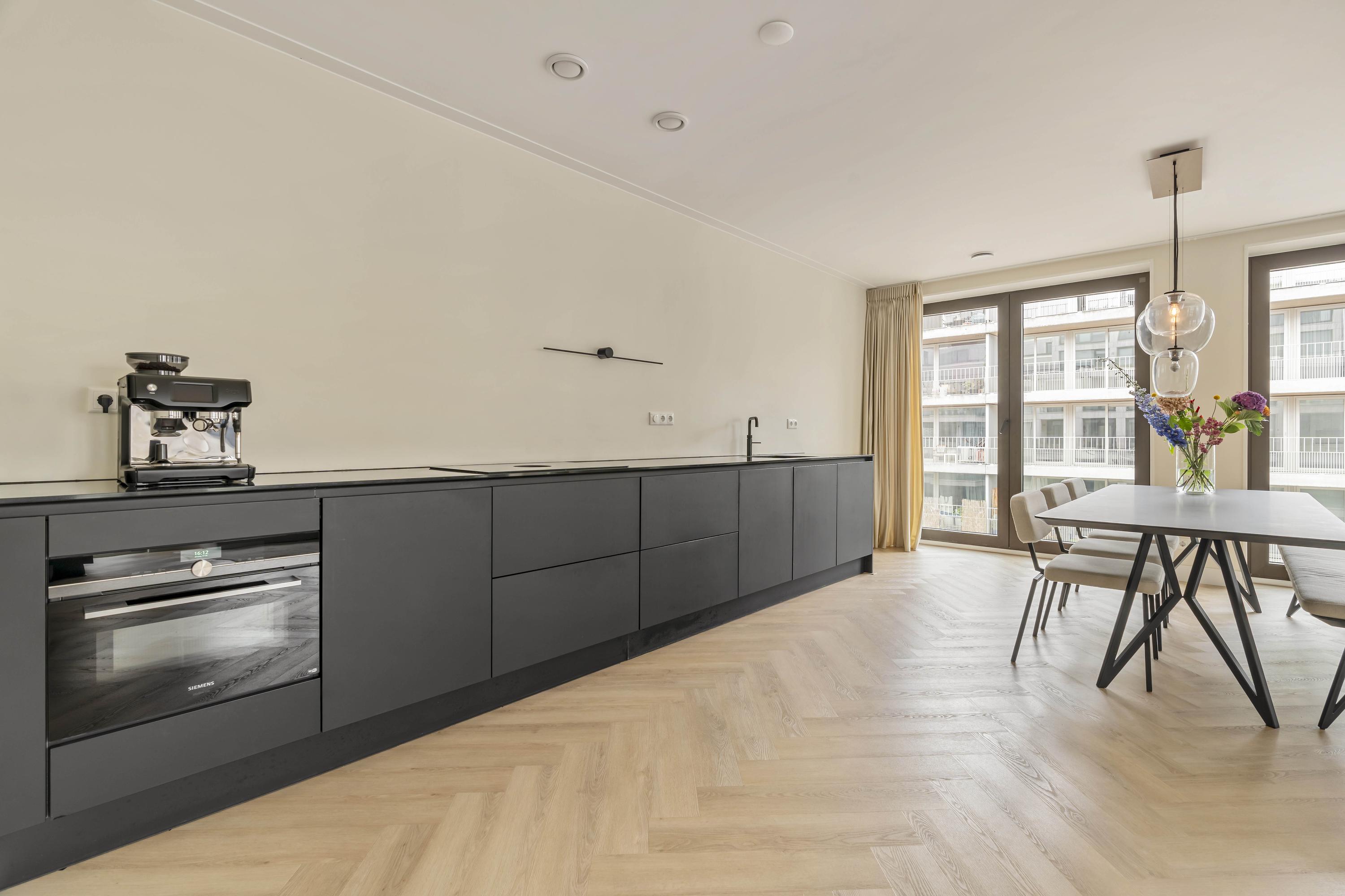 The kitchen is finished in a matte black design and fitted with all modern built-in appliances, including an induction hob, combi oven, dishwasher, and Quooker. There is ample storage space throughout. From the living room, you have access to the spacious southwest-facing balcony, where you can enjoy the afternoon and evening sun and a beautiful view over the green square below.