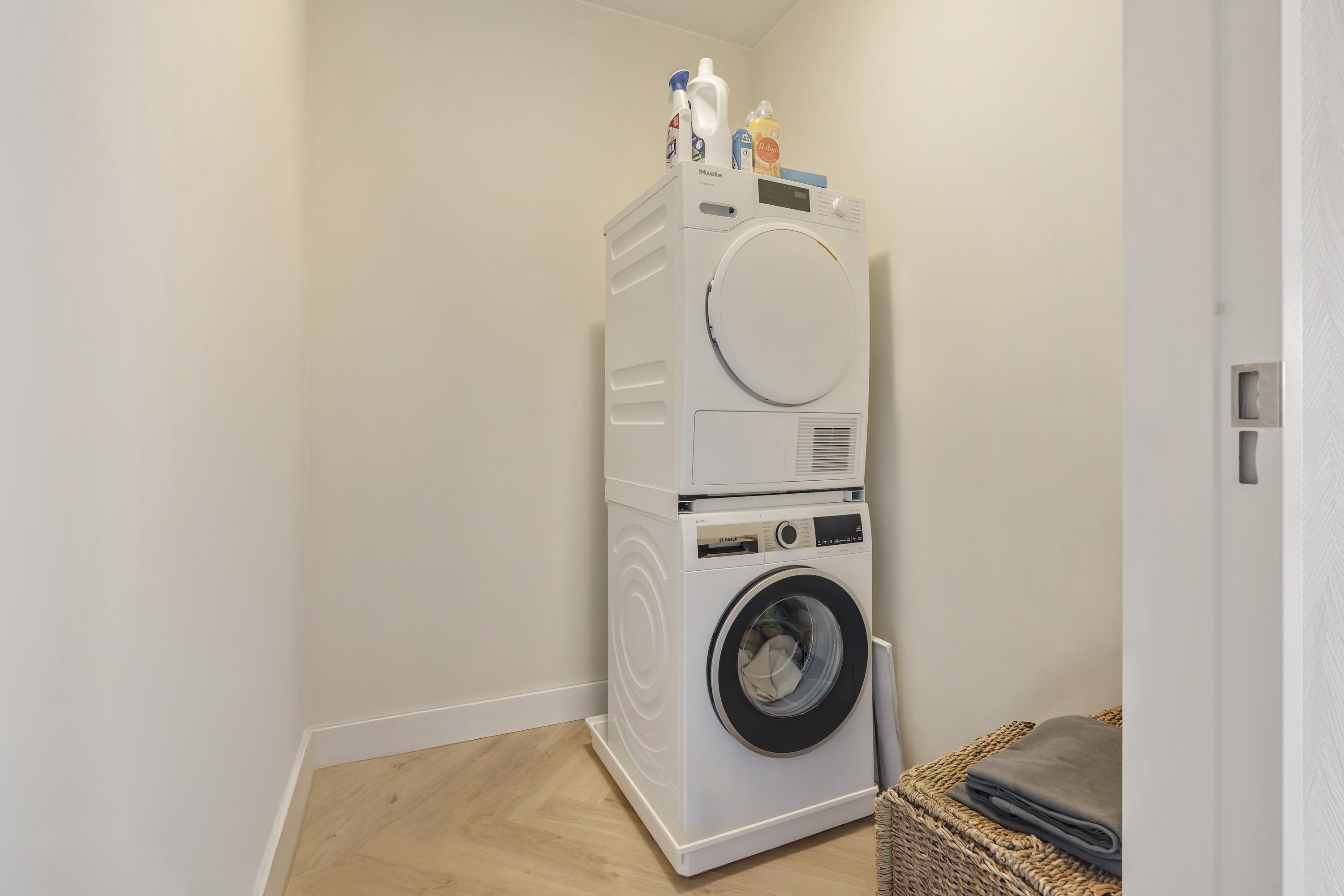 Upon entering the spacious hallway, the refined finish immediately stands out: a light herringbone floor, soft tones, and subtle wall lighting create a calm and modern atmosphere. The hallway provides access to all rooms and includes a large storage room, a separate laundry area with connections for a washing machine and dryer, and a separate toilet with wash basin.