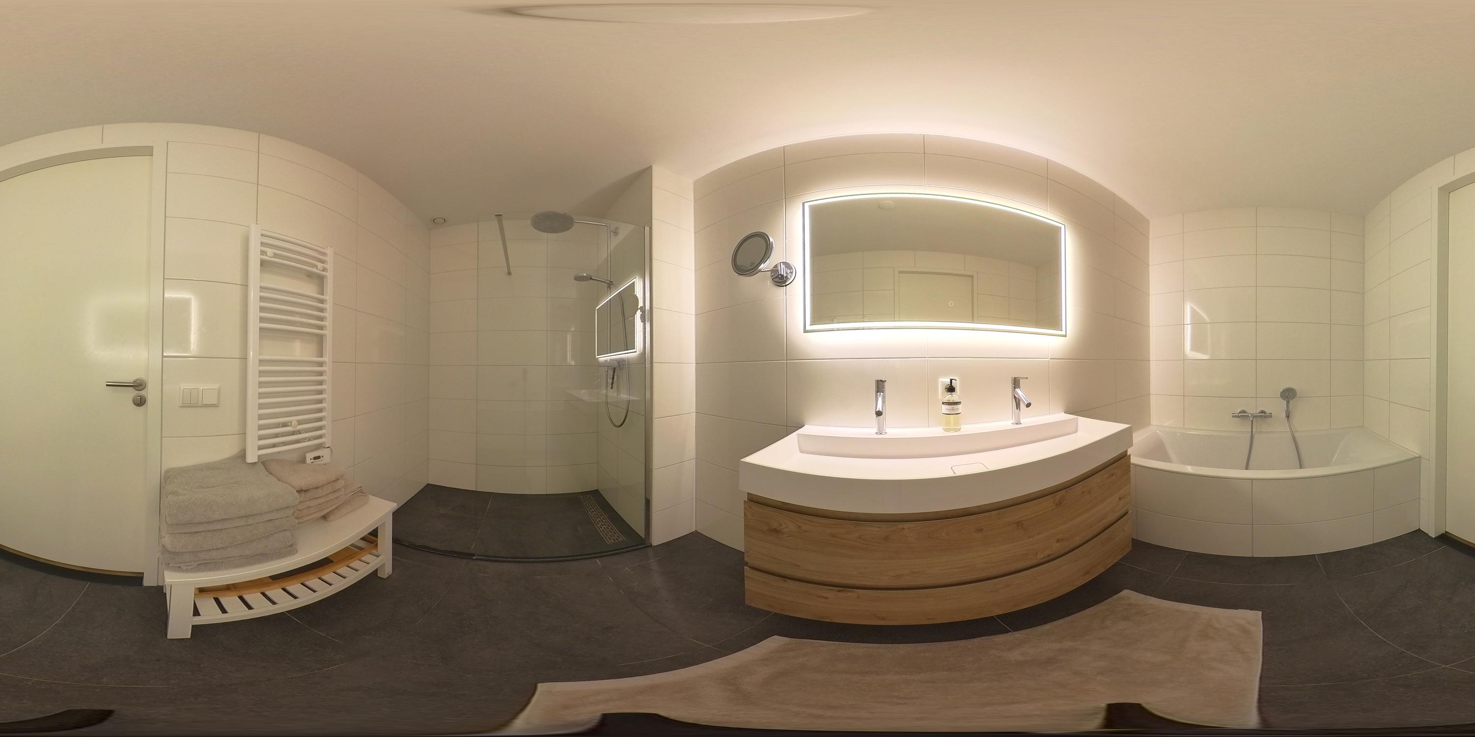 The bathroom is modern and comfortable, equipped with a walk-in shower, bathtub, double washbasin unit, and a large mirror with integrated lighting and heating. At the end of the hallway is the bright living room, surrounded by large windows — a welcoming space with lovely views of the surrounding area and greenery. The living room and open kitchen flow seamlessly together, creating a pleasant and open layout.