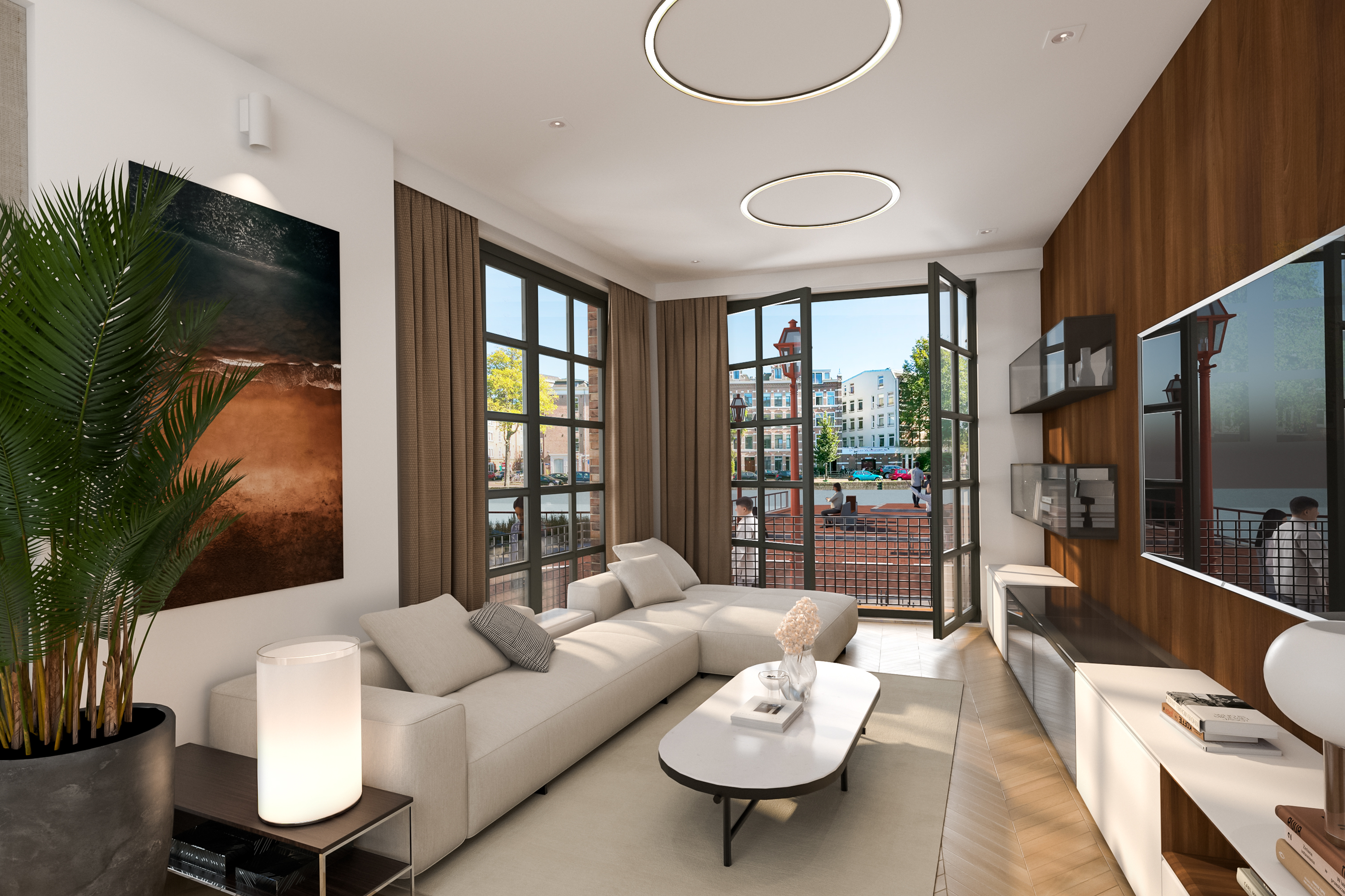 The elevated main level bathes in natural light through expansive canal-facing windows, with ceiling heights reaching nearly 2.90 metres. French balcony doors and a clever fold-down bench connect you quietly to the Westerkanaal. Downstairs, a full-height basement offers two bedrooms, a study area, utility room, and a spacious bathroom, all finished with a harmonious technical foundation and mechanical ventilation. Interiors are delivered in shell, offering the freedom to embody your own aesthetic, complemented by a consultation from Co van der Horst.