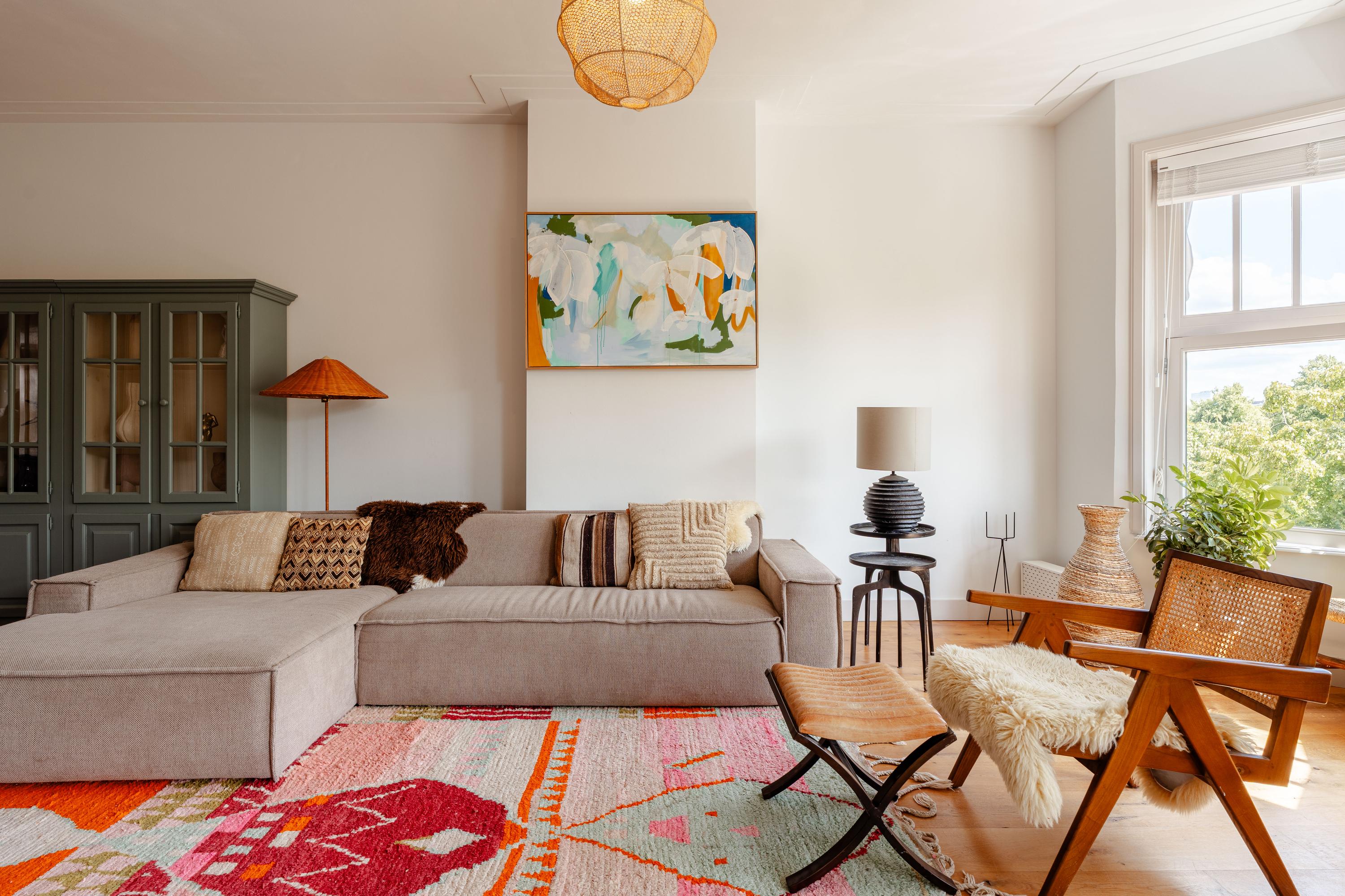 Spacious entrance with ample storage and access to the bathroom, fully renovated in 2025. The bathroom features a double sink, bathtub with shower, and a generous walk-in shower. The toilet is separate. From the entrance, a hallway leads to all rooms. Glass double doors open into the large L-shaped living room at the front of the apartment. This bright and inviting space includes a charming bay window and built-in cabinets on both sides. Original en-suite doors provide access to the dining room and the newly renovated kitchen (2025). This stylish open-plan kitchen features a central island, dishwasher, oven, microwave, and induction hob, with abundant storage throughout. French doors from the dining area open onto a spacious north-facing balcony, which can also be accessed from the master bedroom. The master bedroom, located at the rear, includes a walk-in closet, built-in storage, and large doors letting in plenty of natural light.