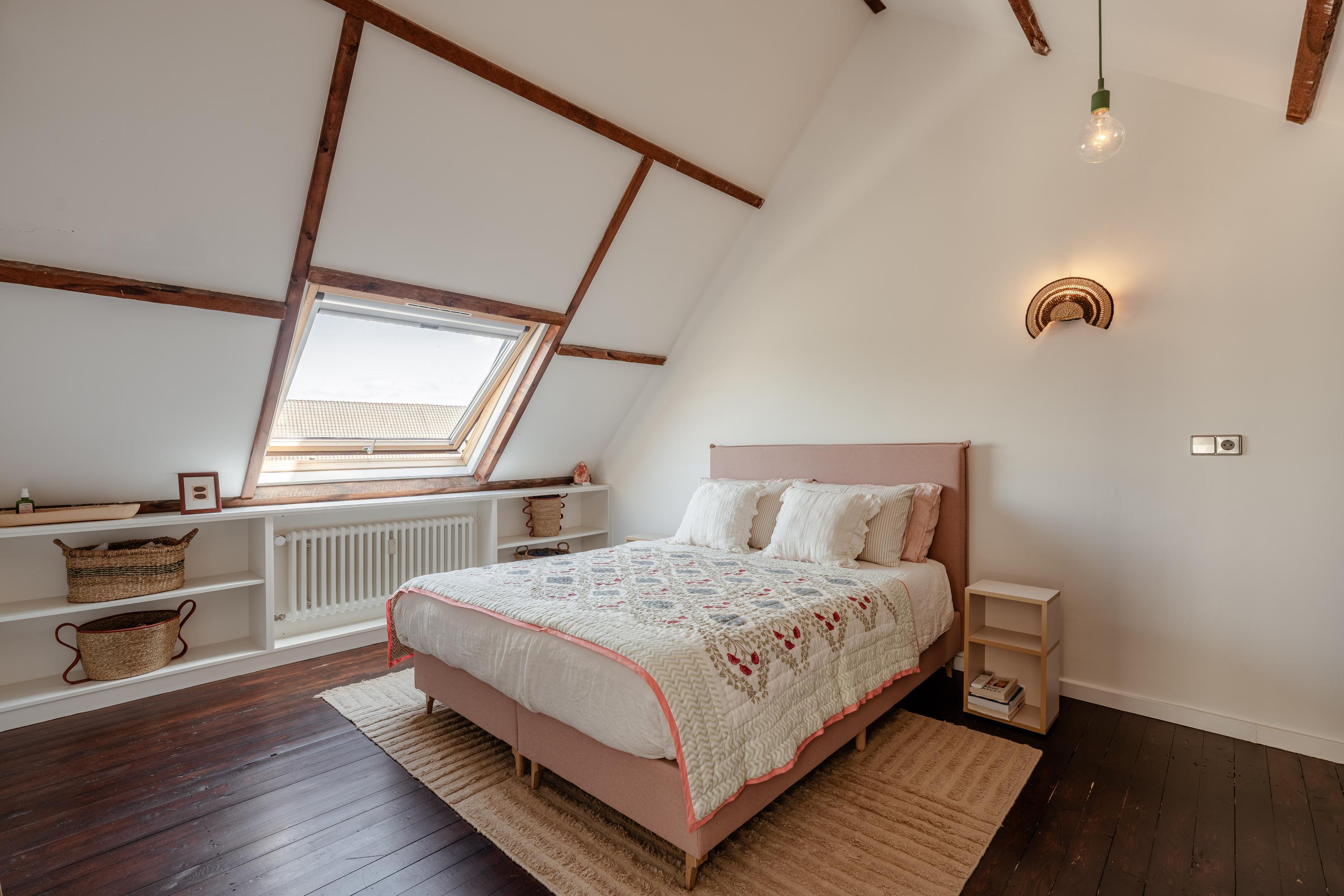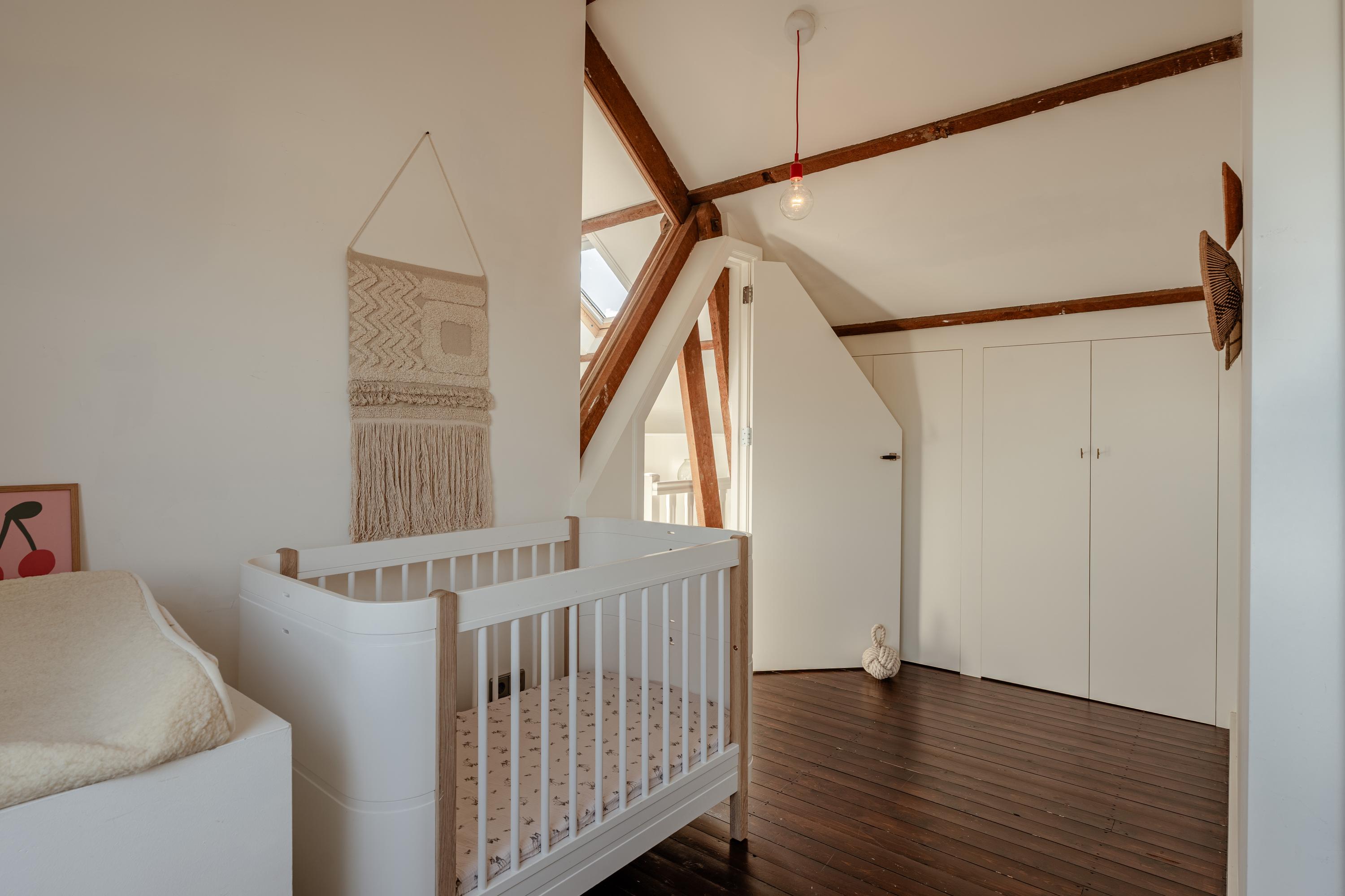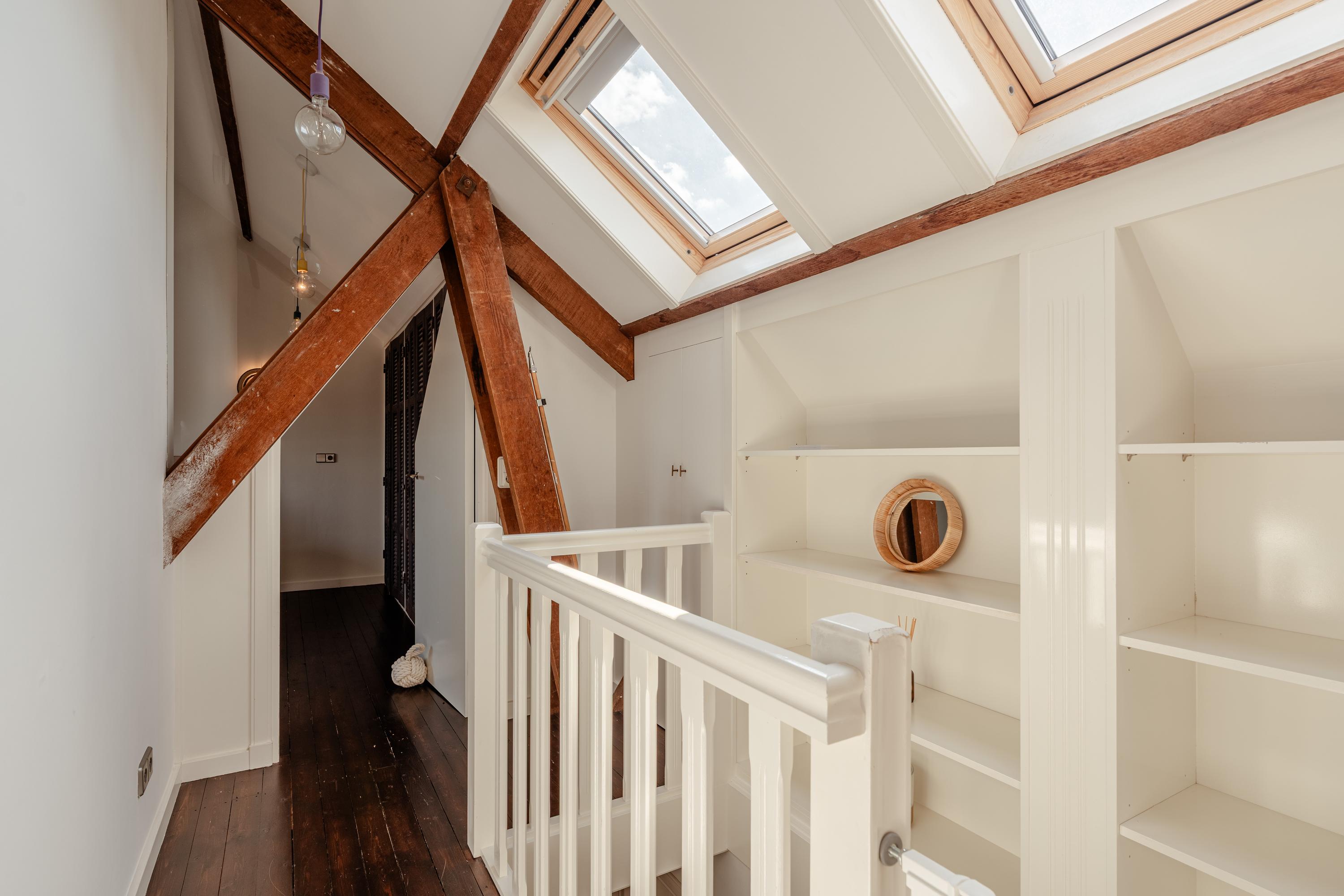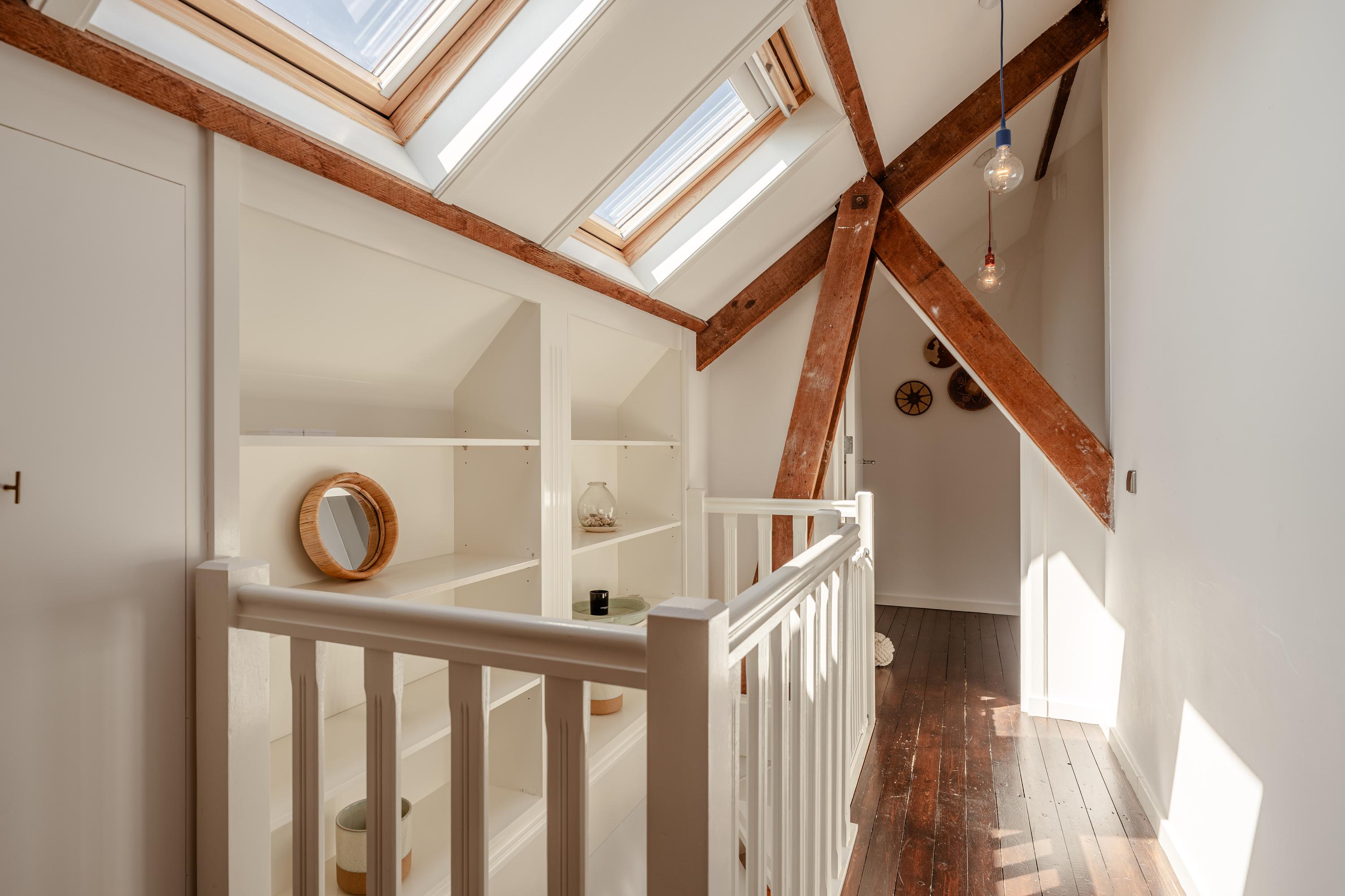 Landing with access to two additional rooms. A generous bedroom with built-in wardrobes and a washbasin with marble countertop and vanity unit. There is also an additional (bed)room with built-in storage. Multiple skylights and exposed wooden beams add character and warmth to this top floor. A spacious storage room, concealed behind a sliding panel in the wardrobe wall, is one of the many practical features of this home.