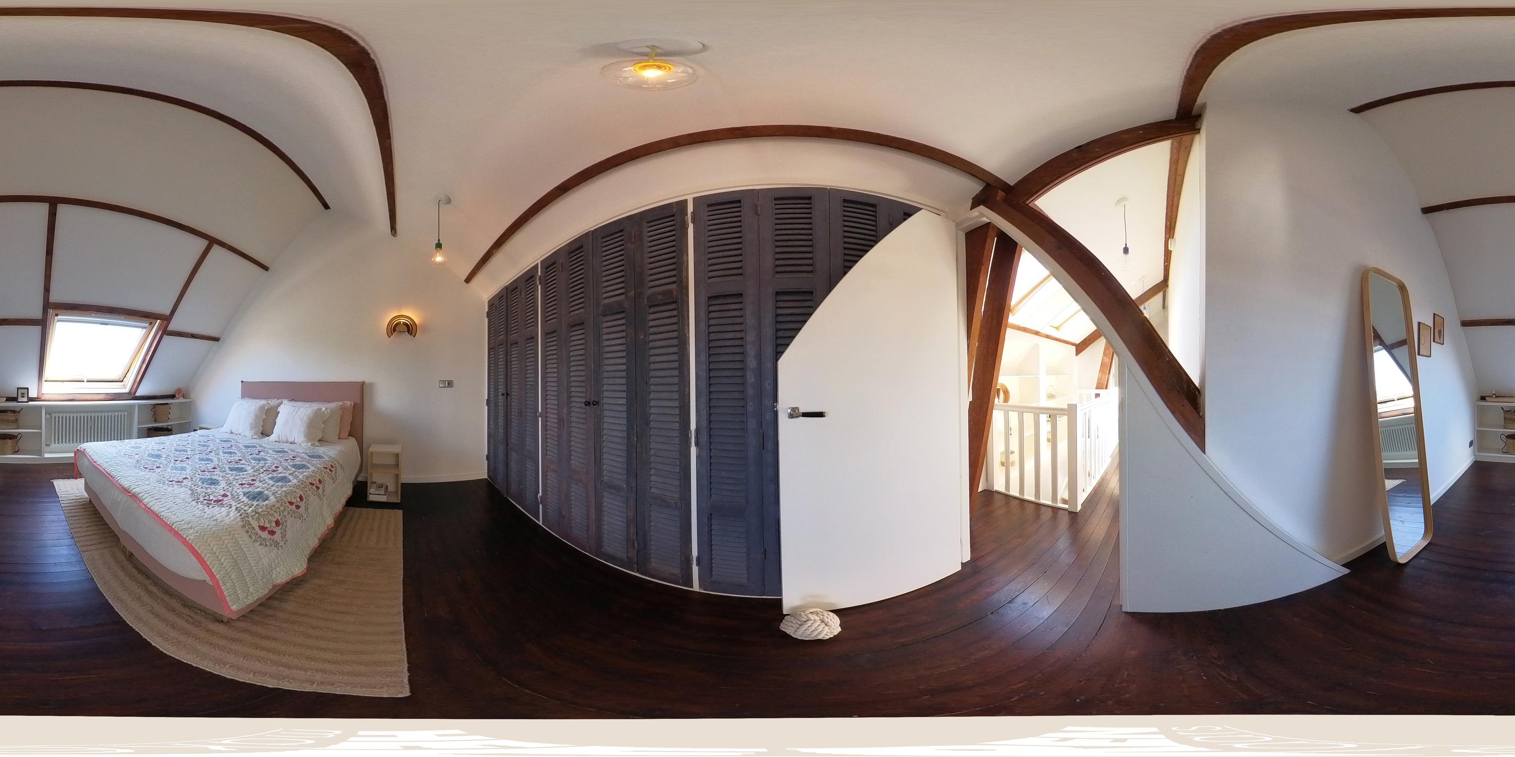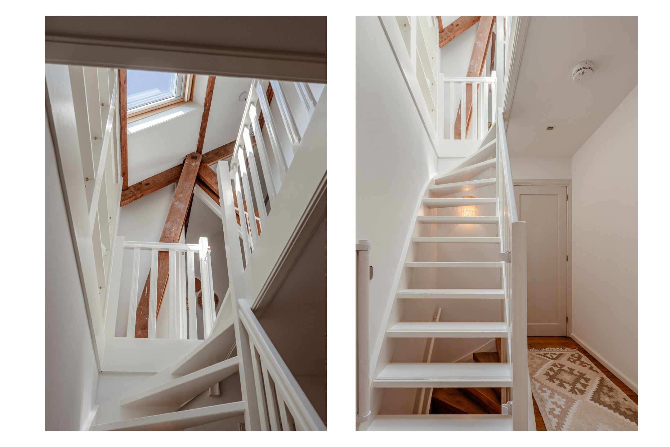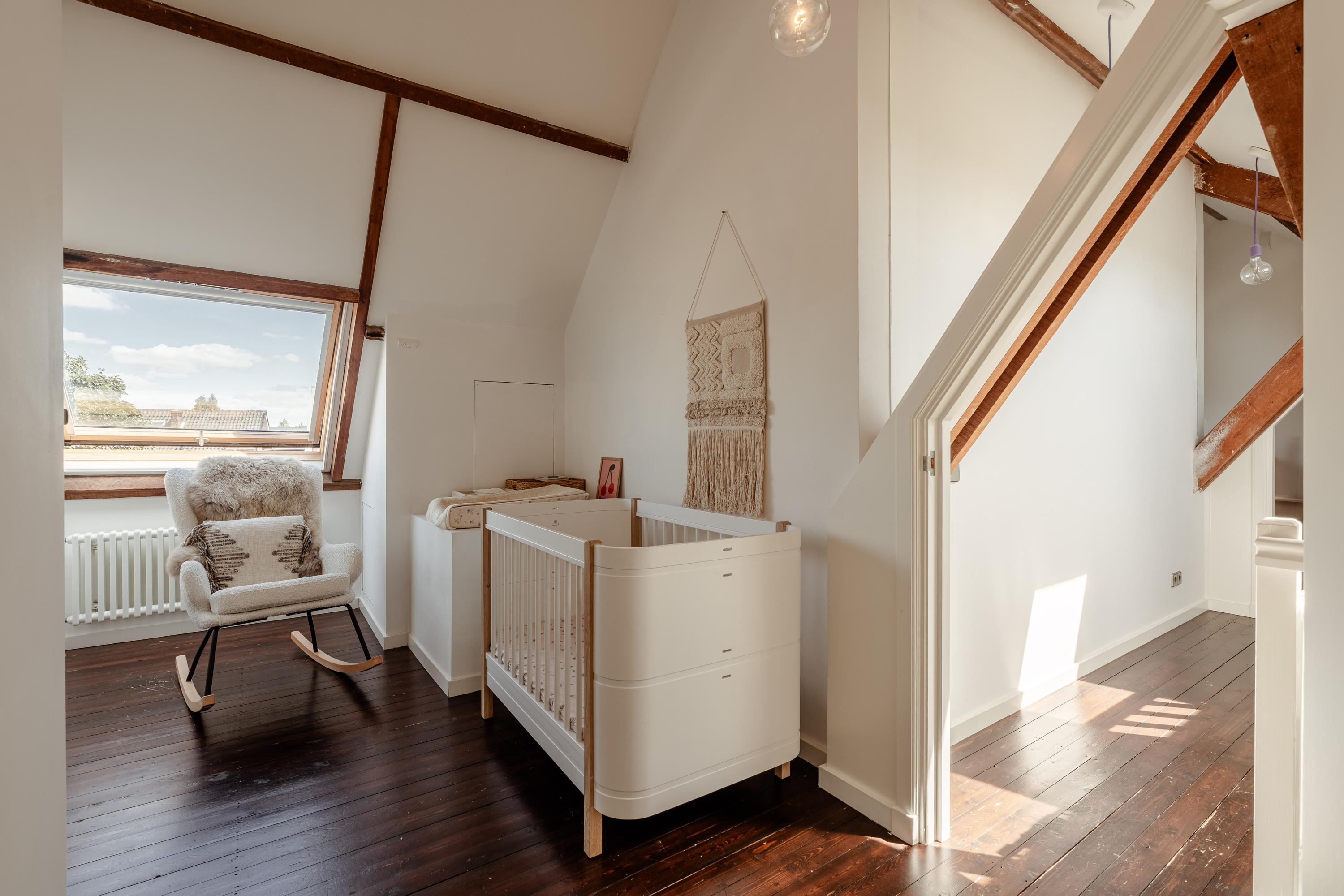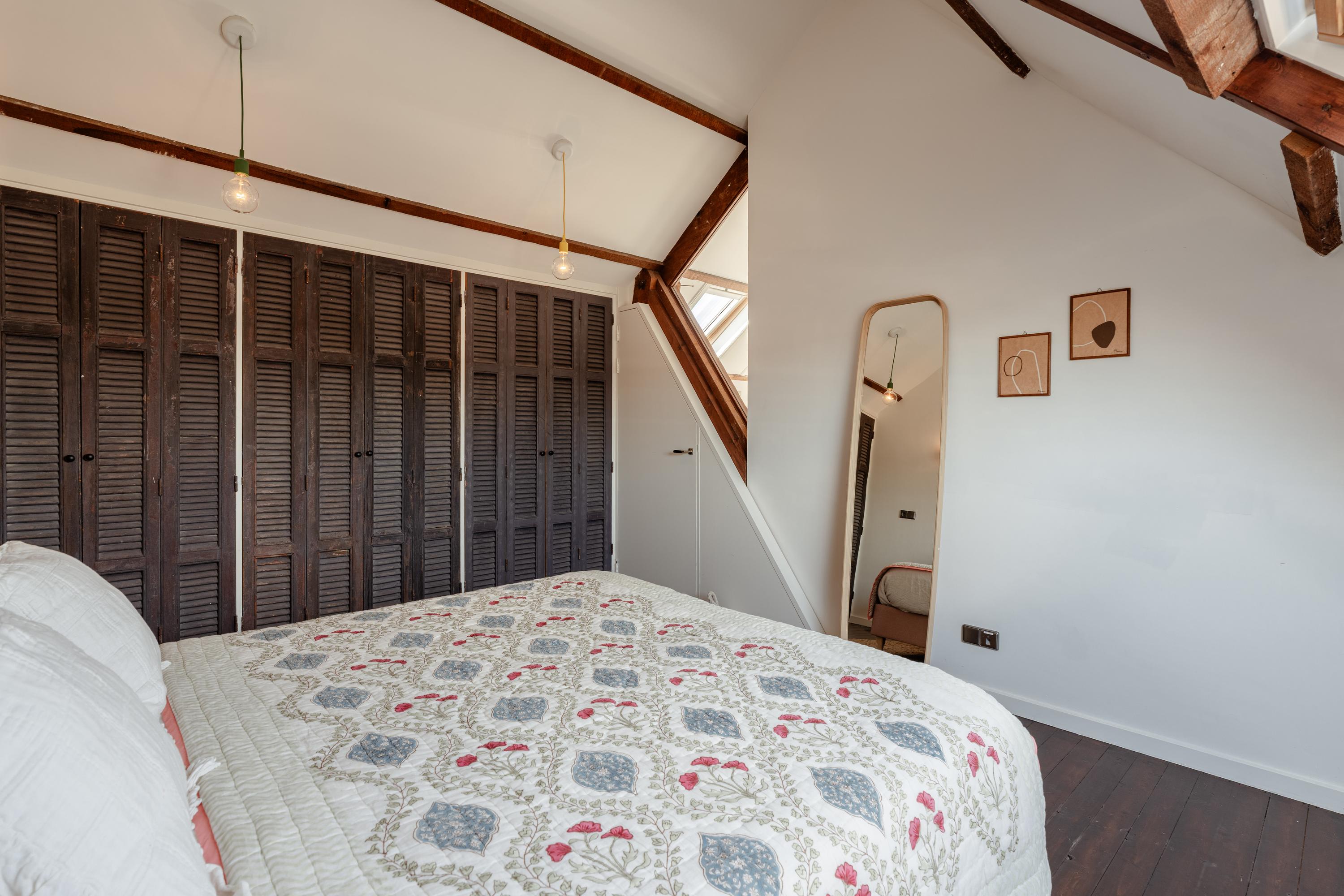 Landing with access to two additional rooms. A generous bedroom with built-in wardrobes and a washbasin with marble countertop and vanity unit. There is also an additional (bed)room with built-in storage. Multiple skylights and exposed wooden beams add character and warmth to this top floor. A spacious storage room, concealed behind a sliding panel in the wardrobe wall, is one of the many practical features of this home.