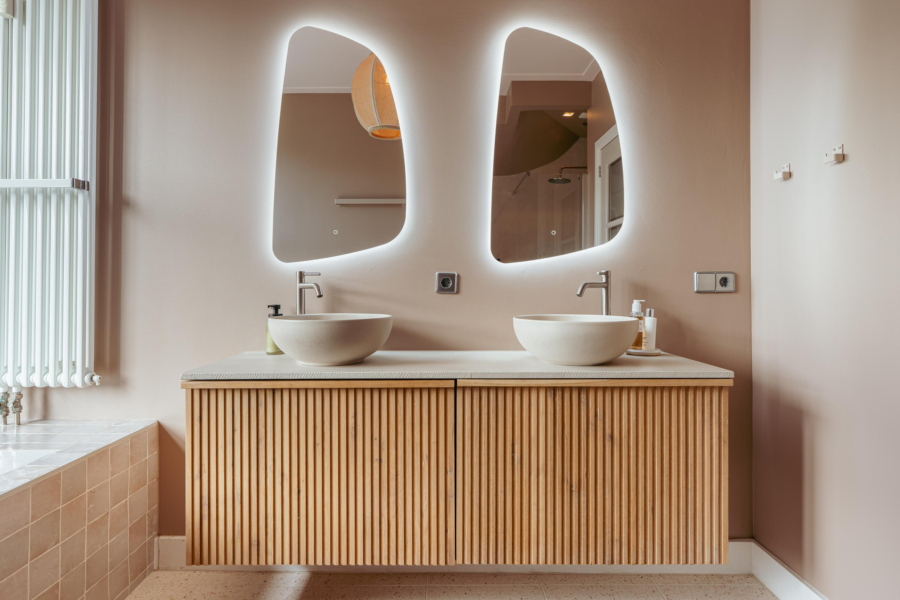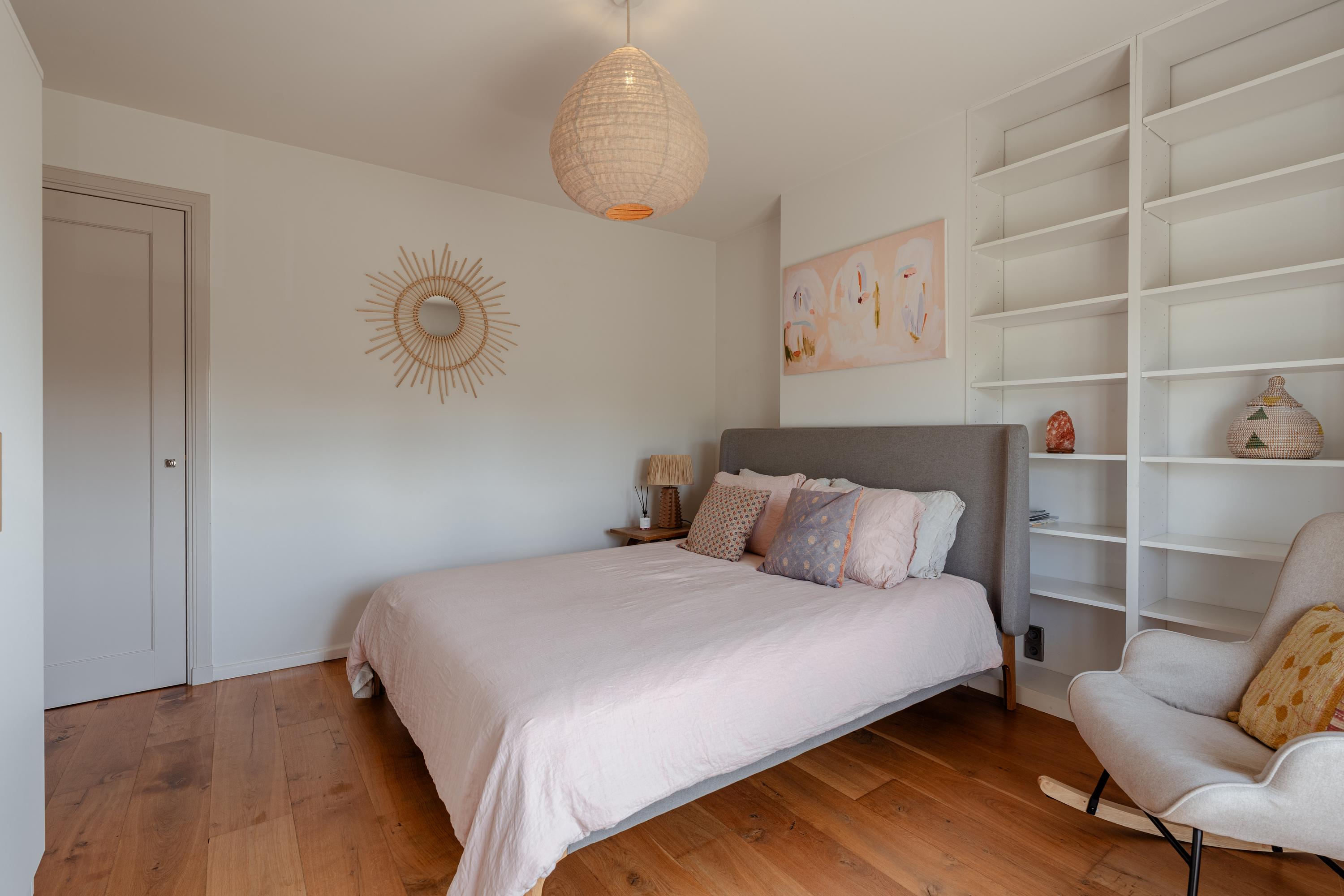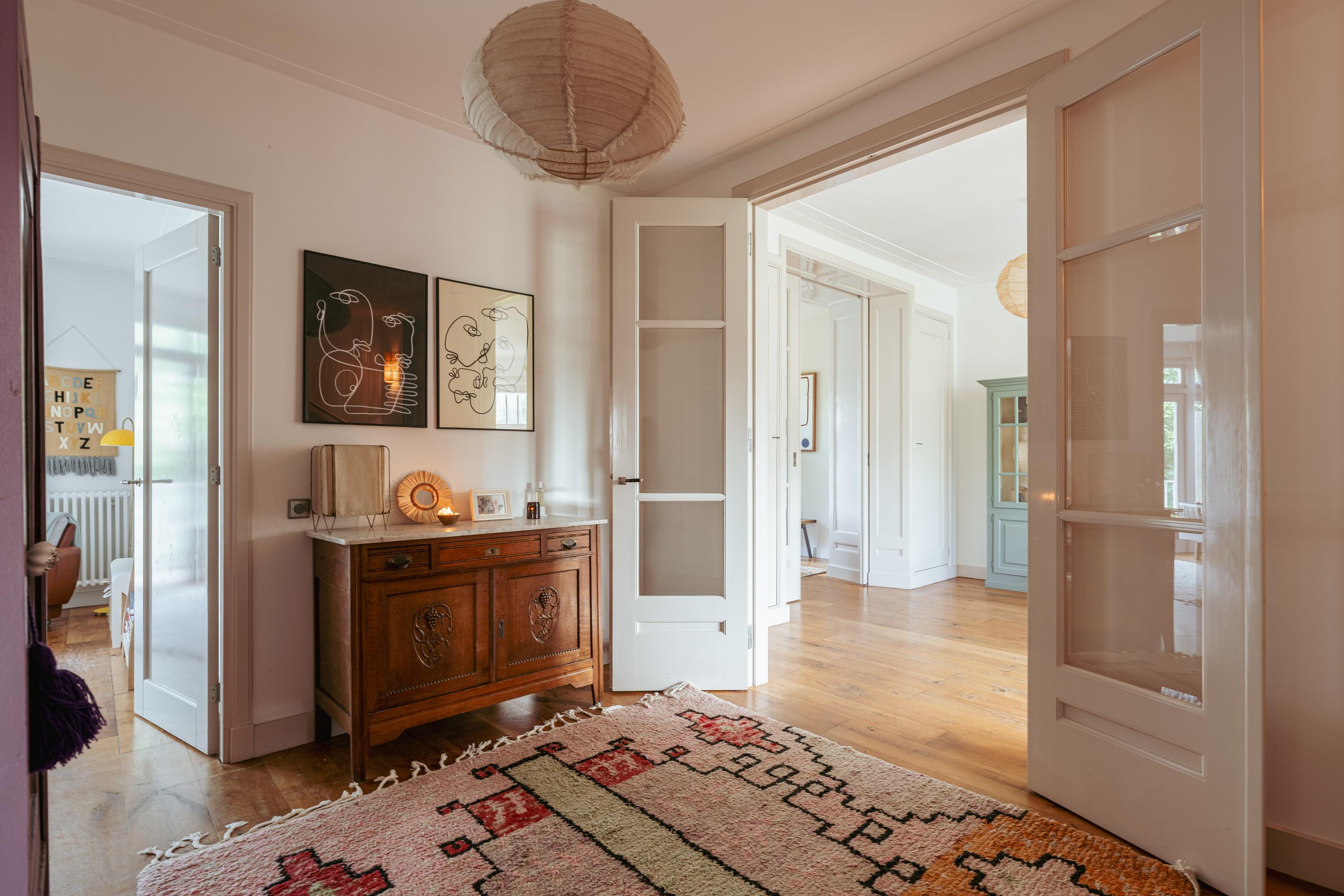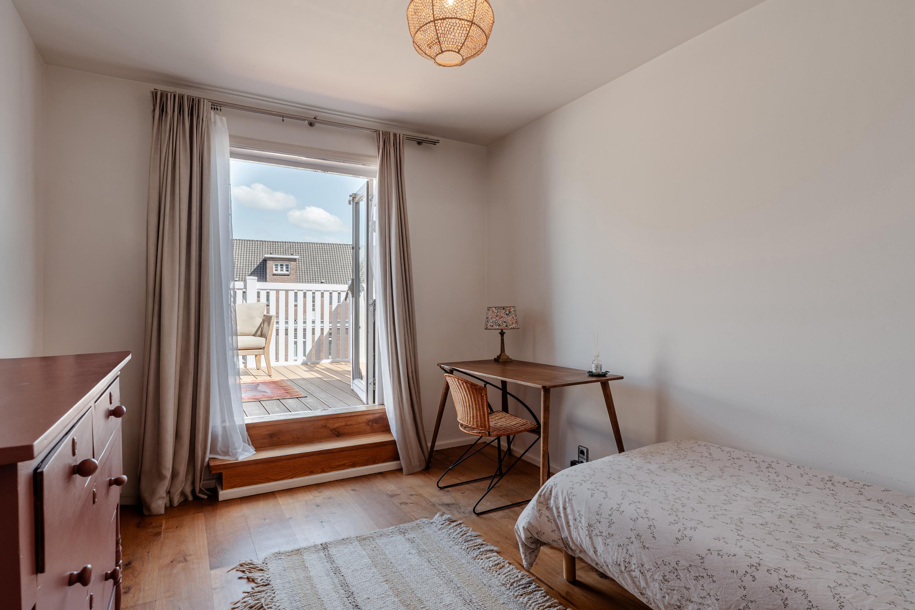 Landing with access to two additional rooms. A generous bedroom with built-in wardrobes and a washbasin with marble countertop and vanity unit. There is also an additional (bed)room with built-in storage. Multiple skylights and exposed wooden beams add character and warmth to this top floor. A spacious storage room, concealed behind a sliding panel in the wardrobe wall, is one of the many practical features of this home.