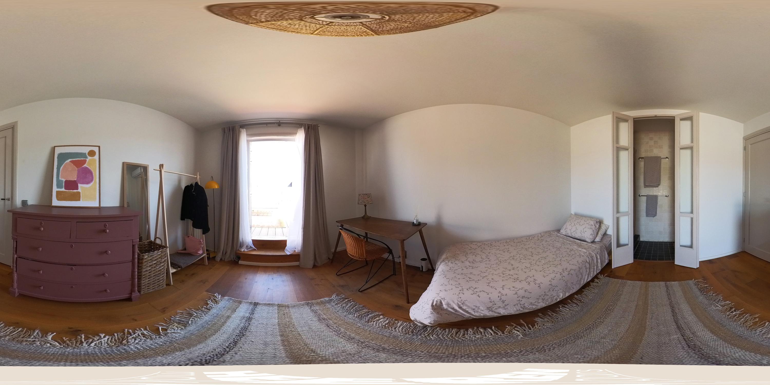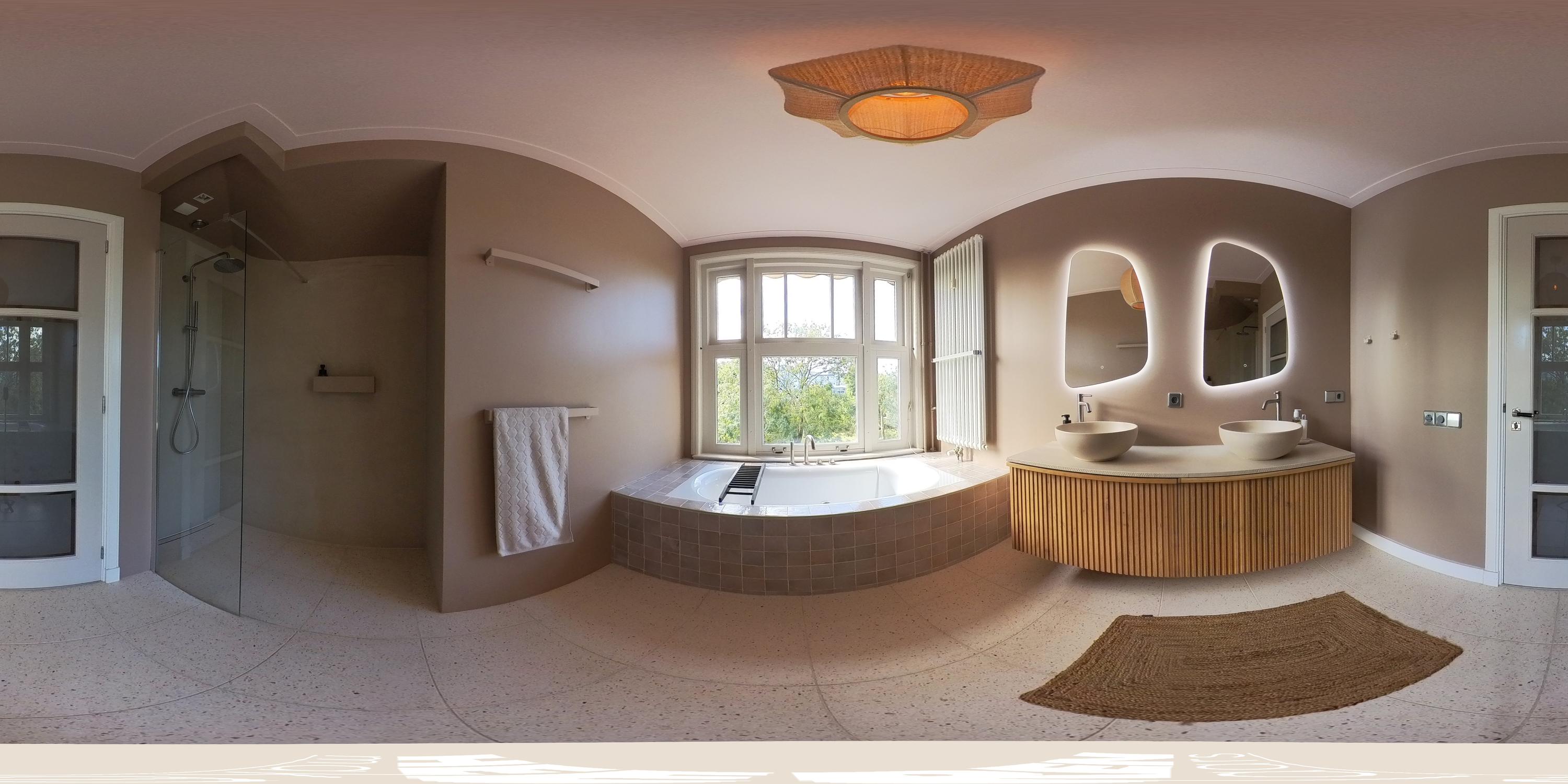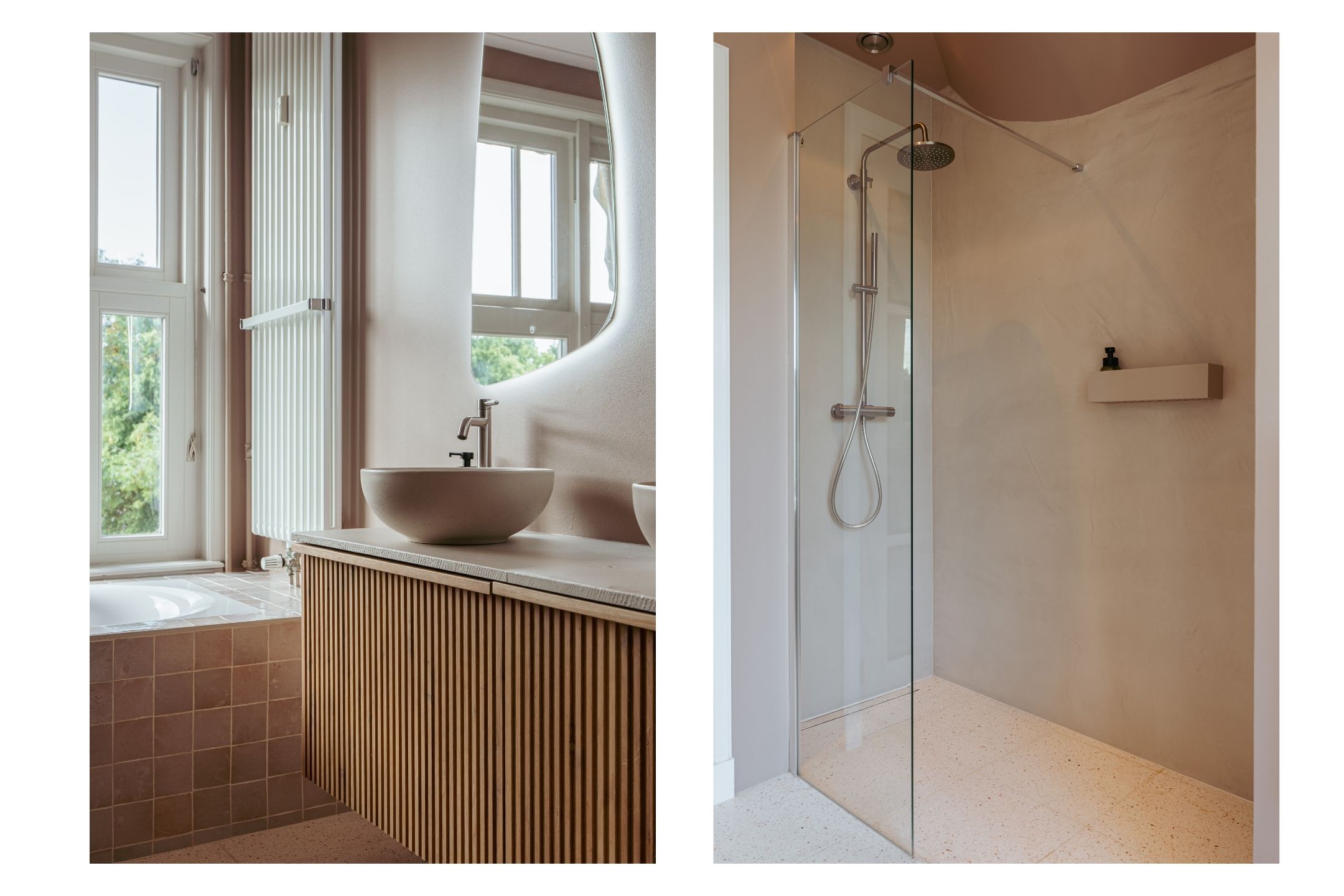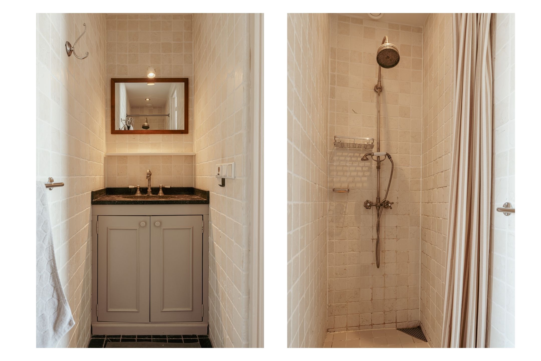 Landing with access to two additional rooms. A generous bedroom with built-in wardrobes and a washbasin with marble countertop and vanity unit. There is also an additional (bed)room with built-in storage. Multiple skylights and exposed wooden beams add character and warmth to this top floor. A spacious storage room, concealed behind a sliding panel in the wardrobe wall, is one of the many practical features of this home.