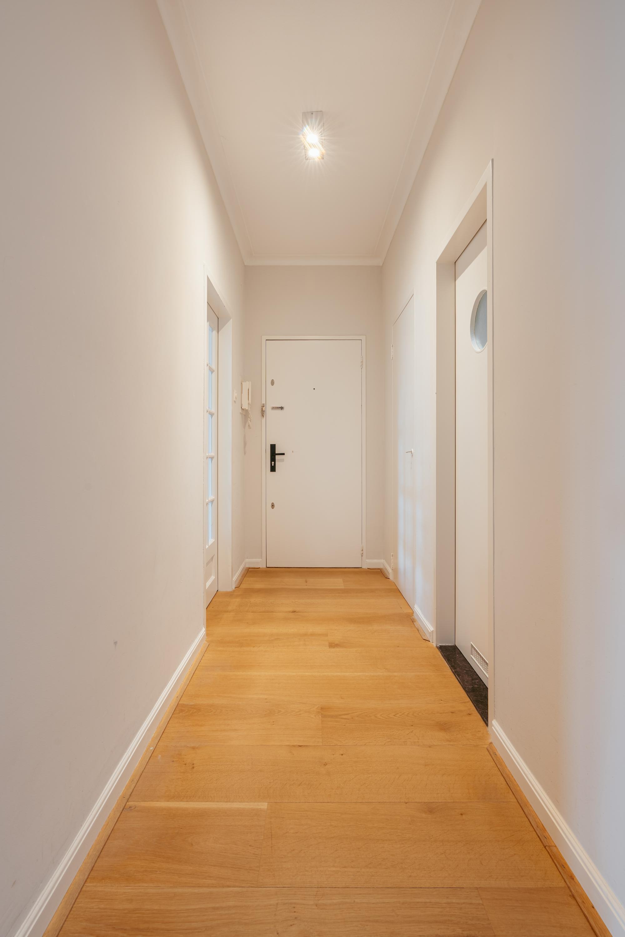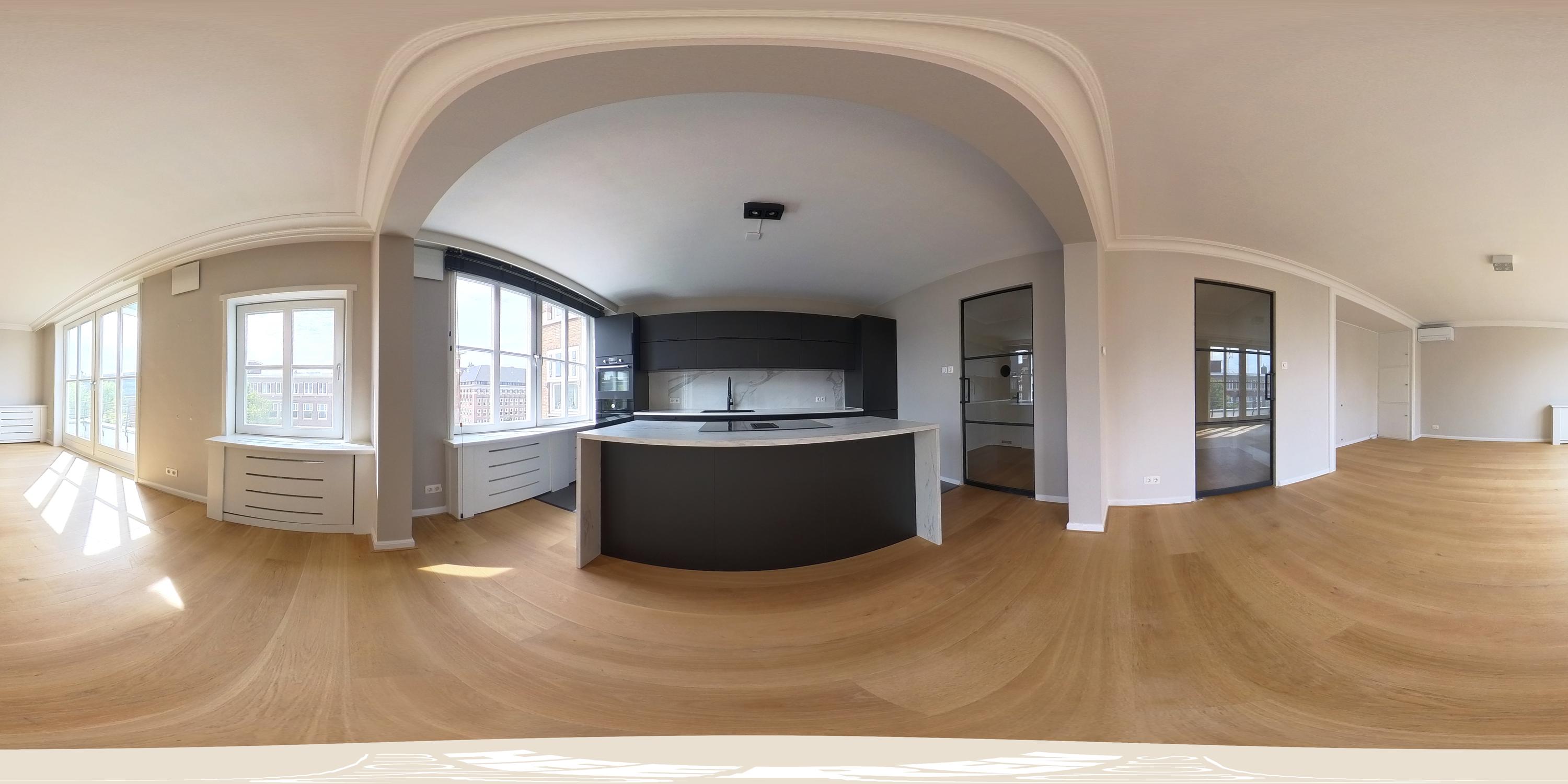 The entrance opens into a spacious hallway providing access to all rooms. At the front is the bright and spacious living area with an inviting open-plan kitchen. This living and cooking space features built-in cupboards, air conditioning, and French doors opening onto a charming south-facing balcony. The modern open kitchen is equipped with various high-quality built-in appliances and a central cooking island with a cosy breakfast bar. Here you will find an induction hob with integrated extraction system, a combi oven, dishwasher, fridge, and freezer.