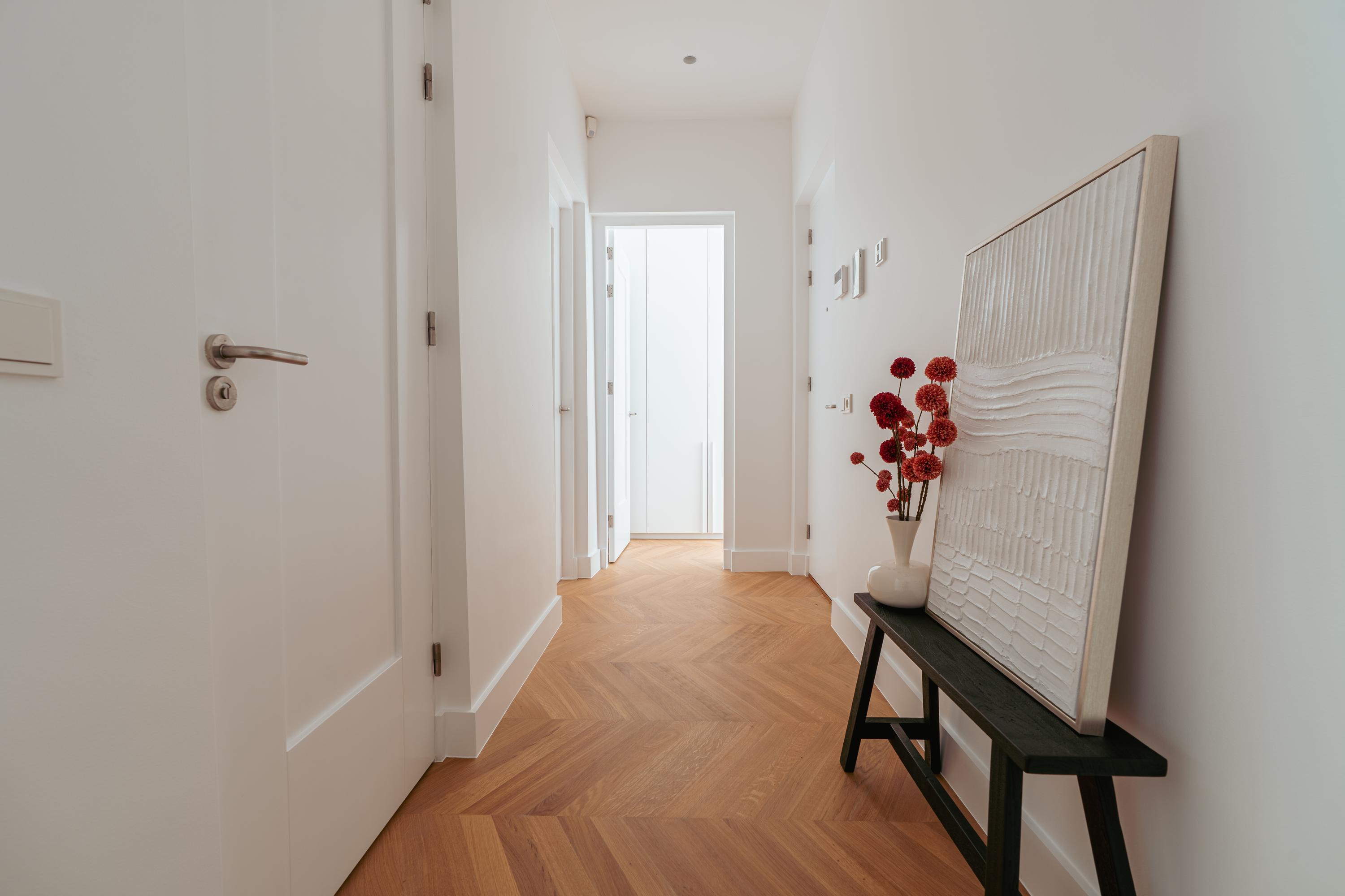The apartment on the second floor is accessible via a well-maintained communal staircase or the lift. The spacious central hallway provides access to all rooms. The expansive living room is a true eye-catcher with its over 3-meter-high ceilings, elegant bay windows, and stylish fireplace. Adjacent is the modern semi-open kitchen with a bar counter and high-quality built-in appliances, including a 4-burner gas stove with extractor hood, a fridge-freezer combination, a combi oven, and a dishwasher.