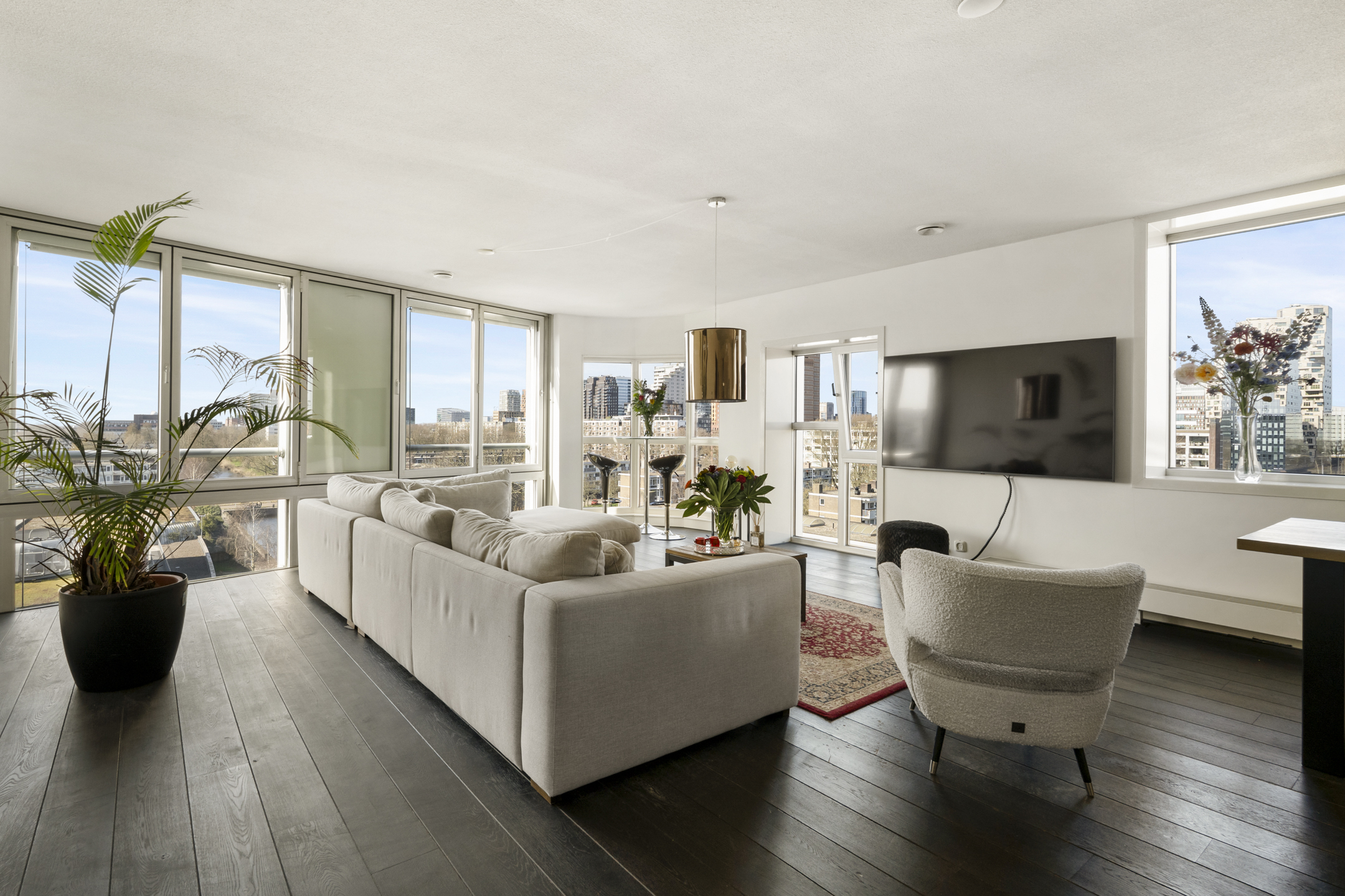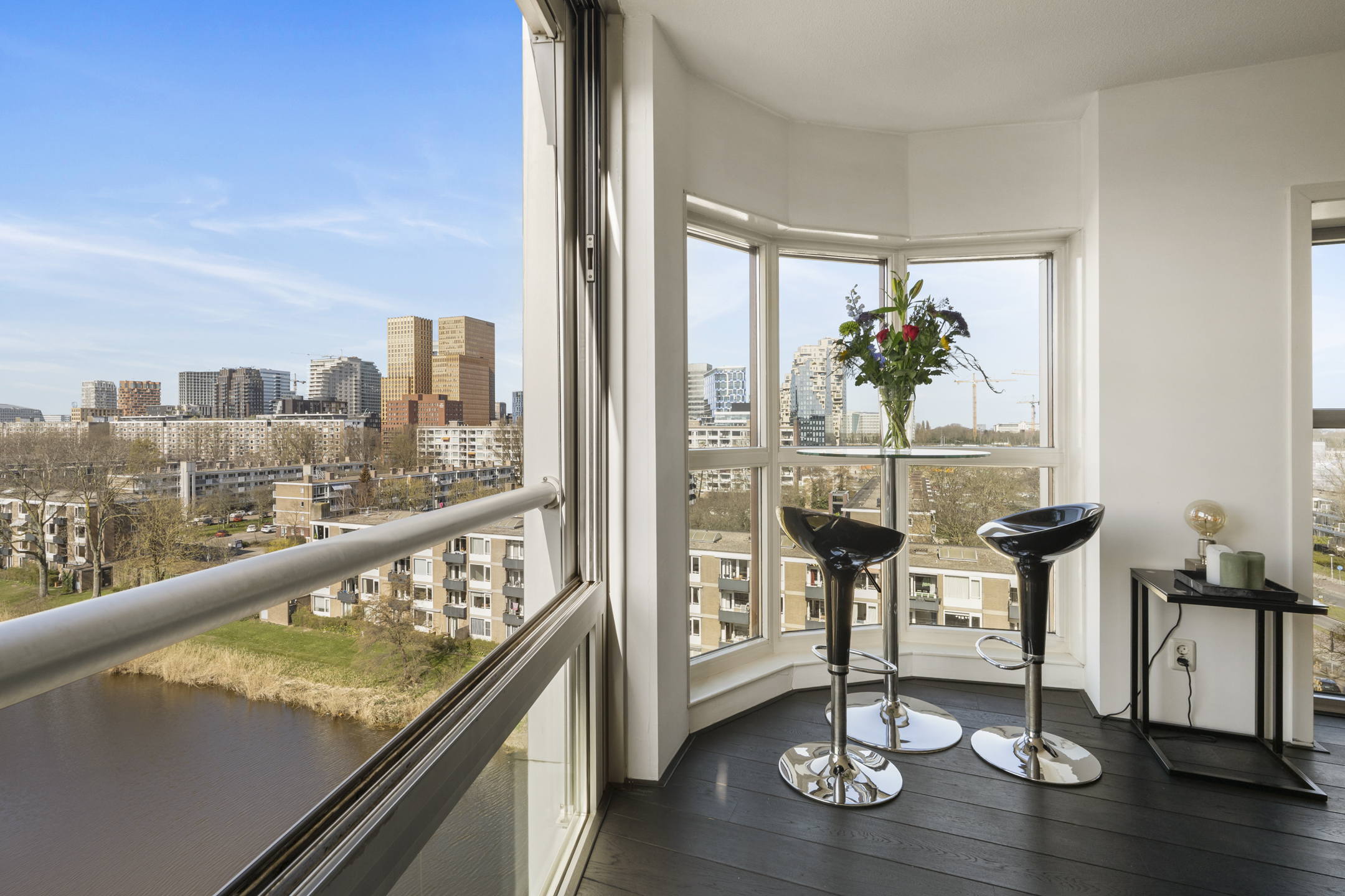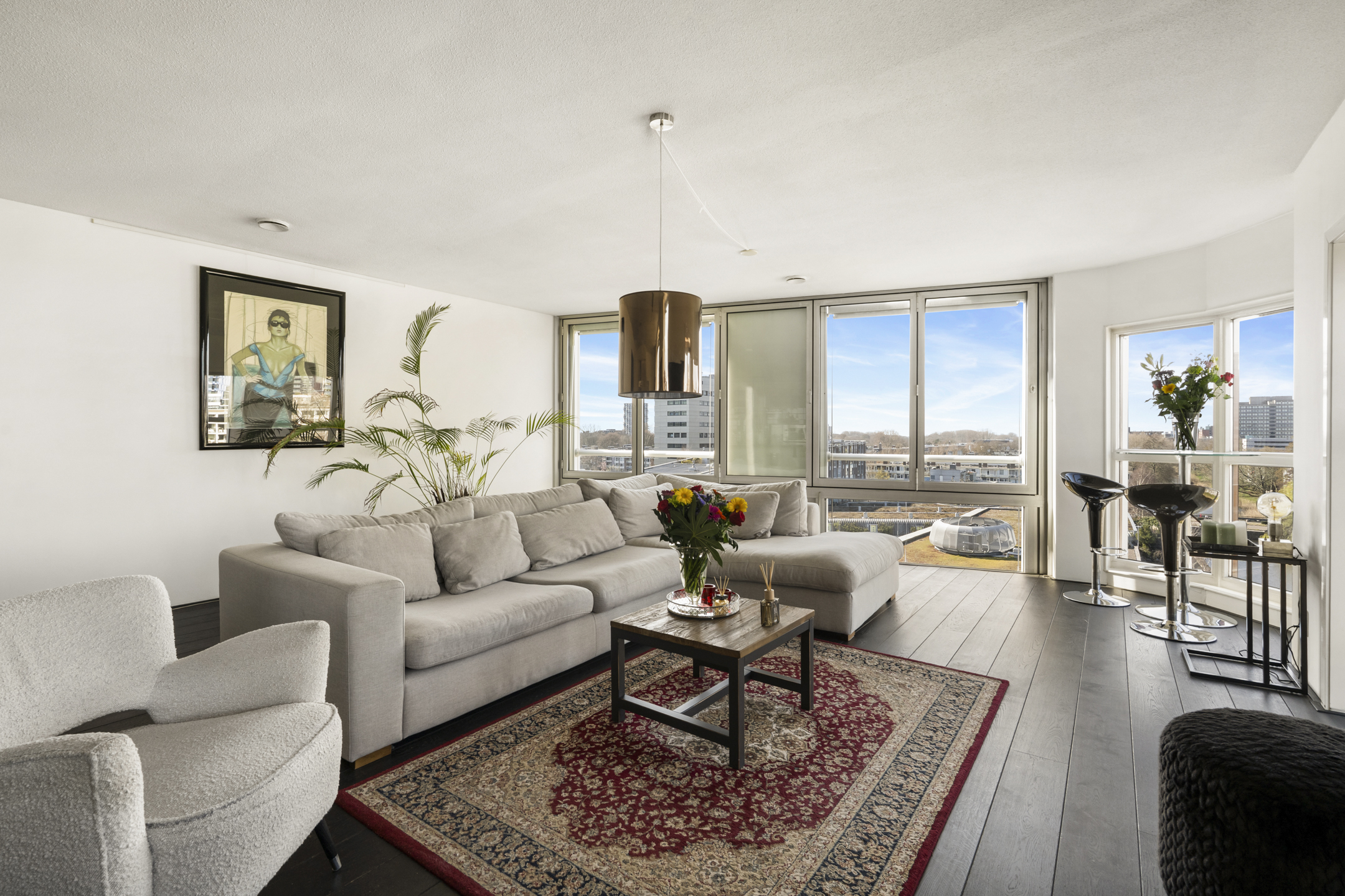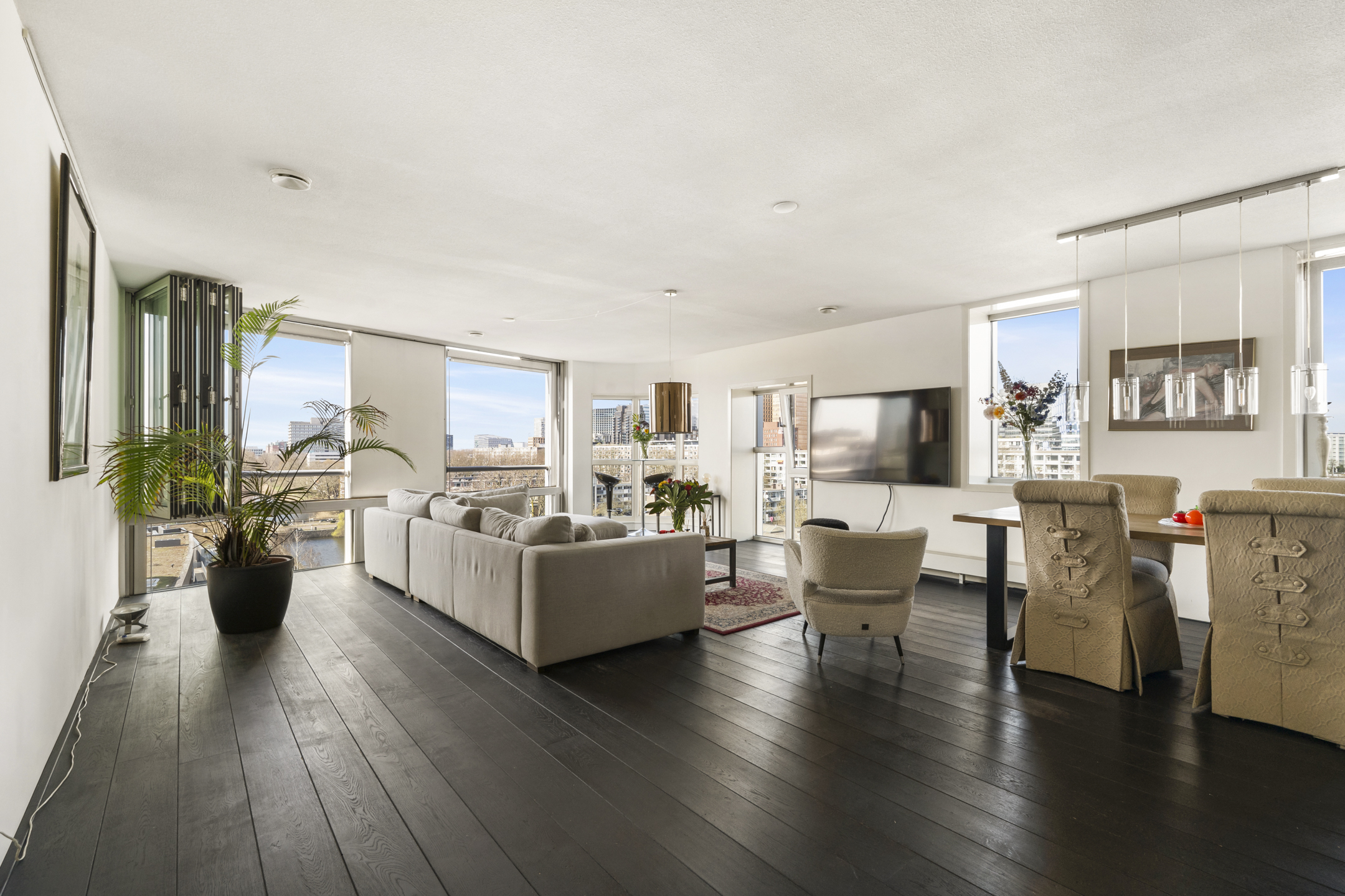 Luxurious three-room corner apartment of 117 m² with unobstructed views of the water and the Zuidas skyline, featuring two bedrooms, a high-end kitchen with cooking island, and an optional private parking space. The apartment is located on the seventh floor of the striking Gelderhof apartment complex, completed in 2004.