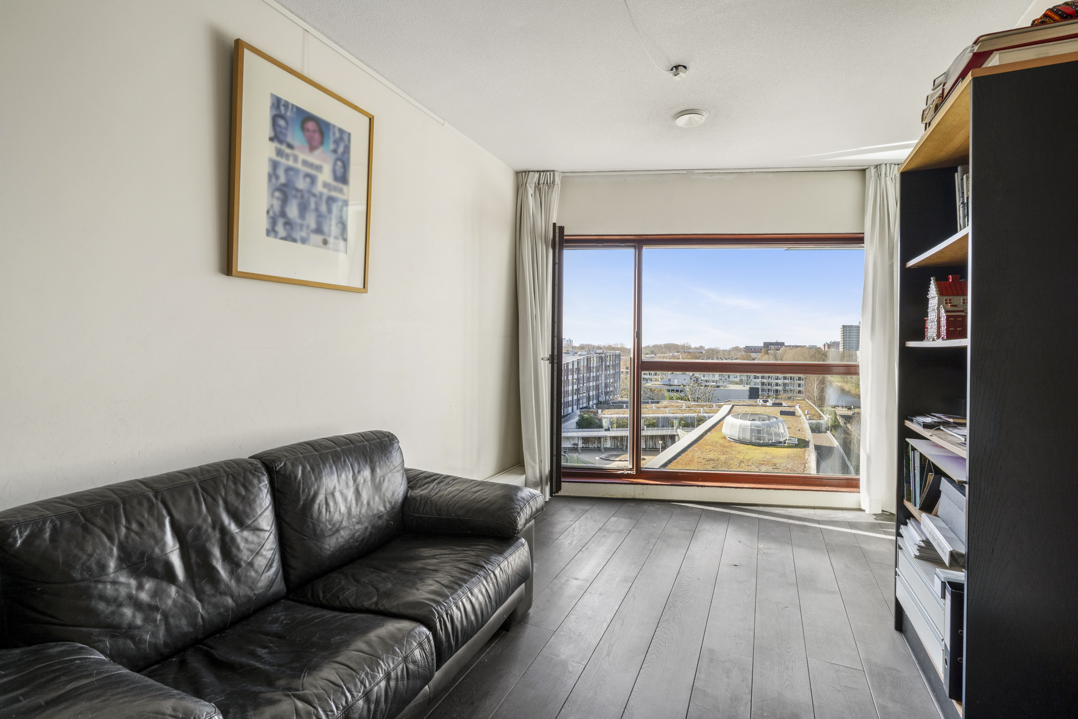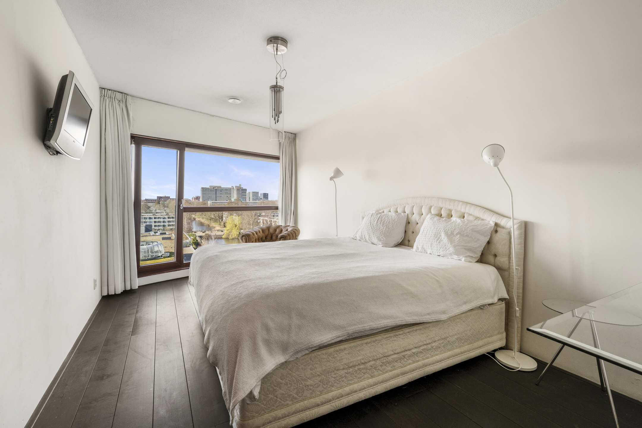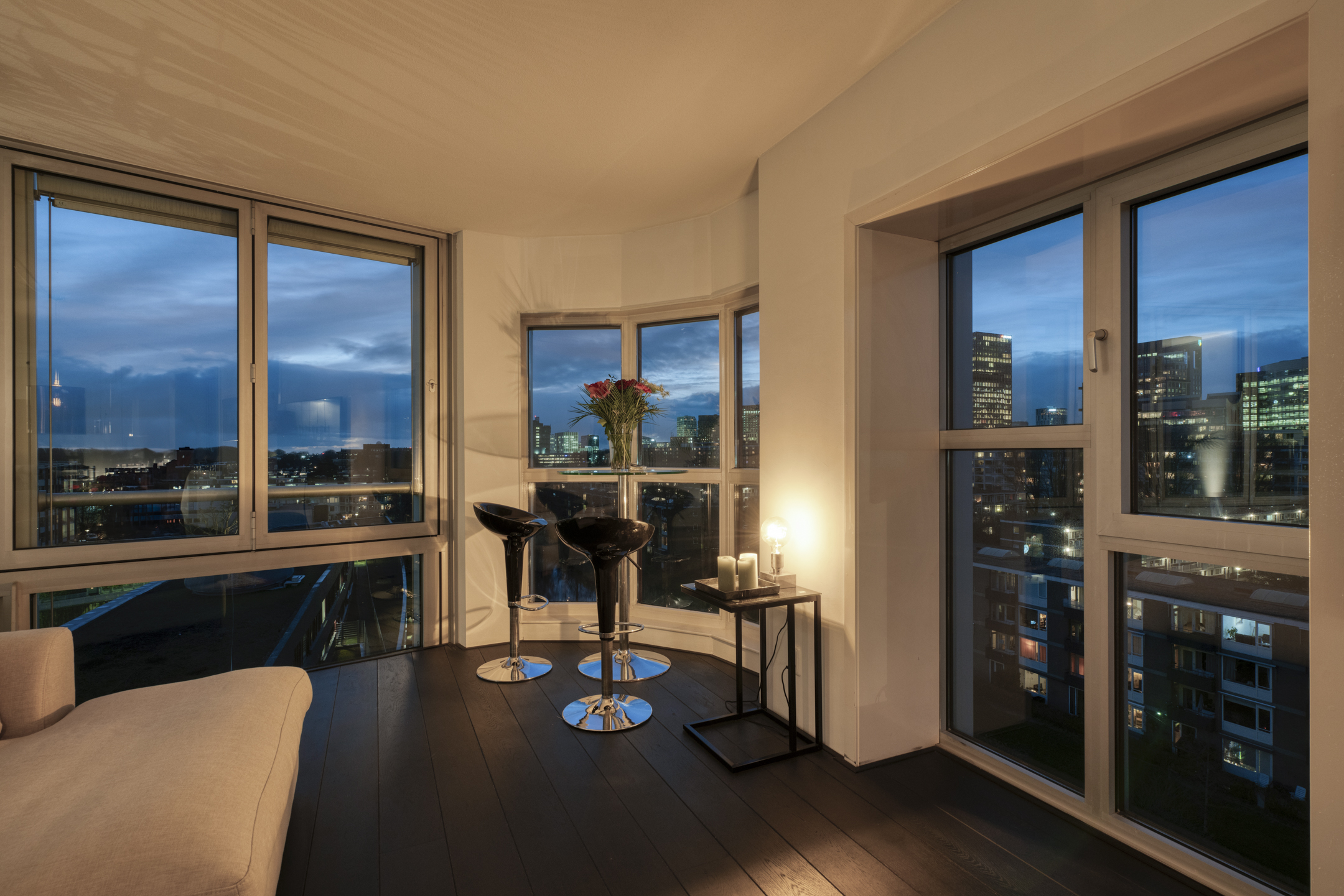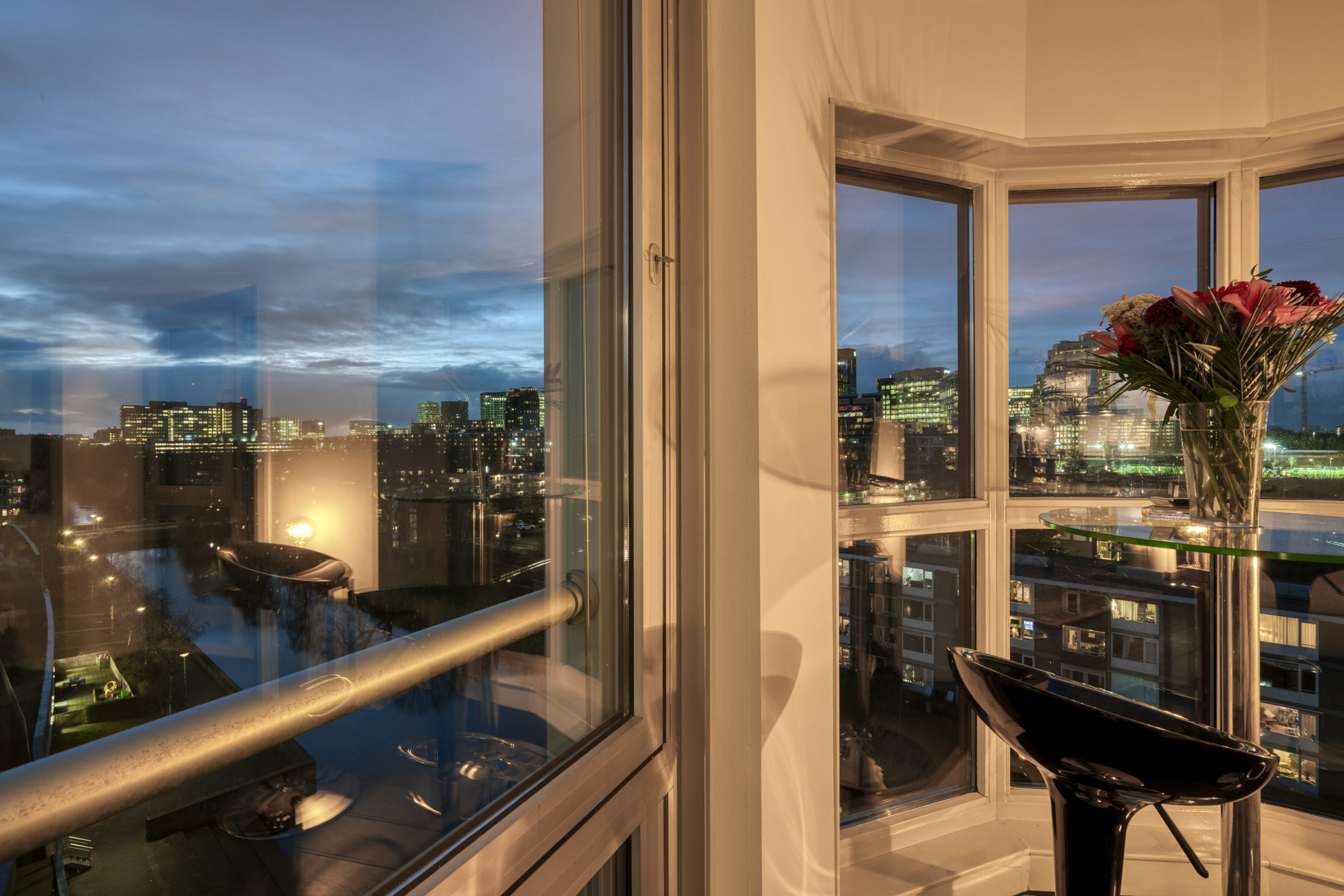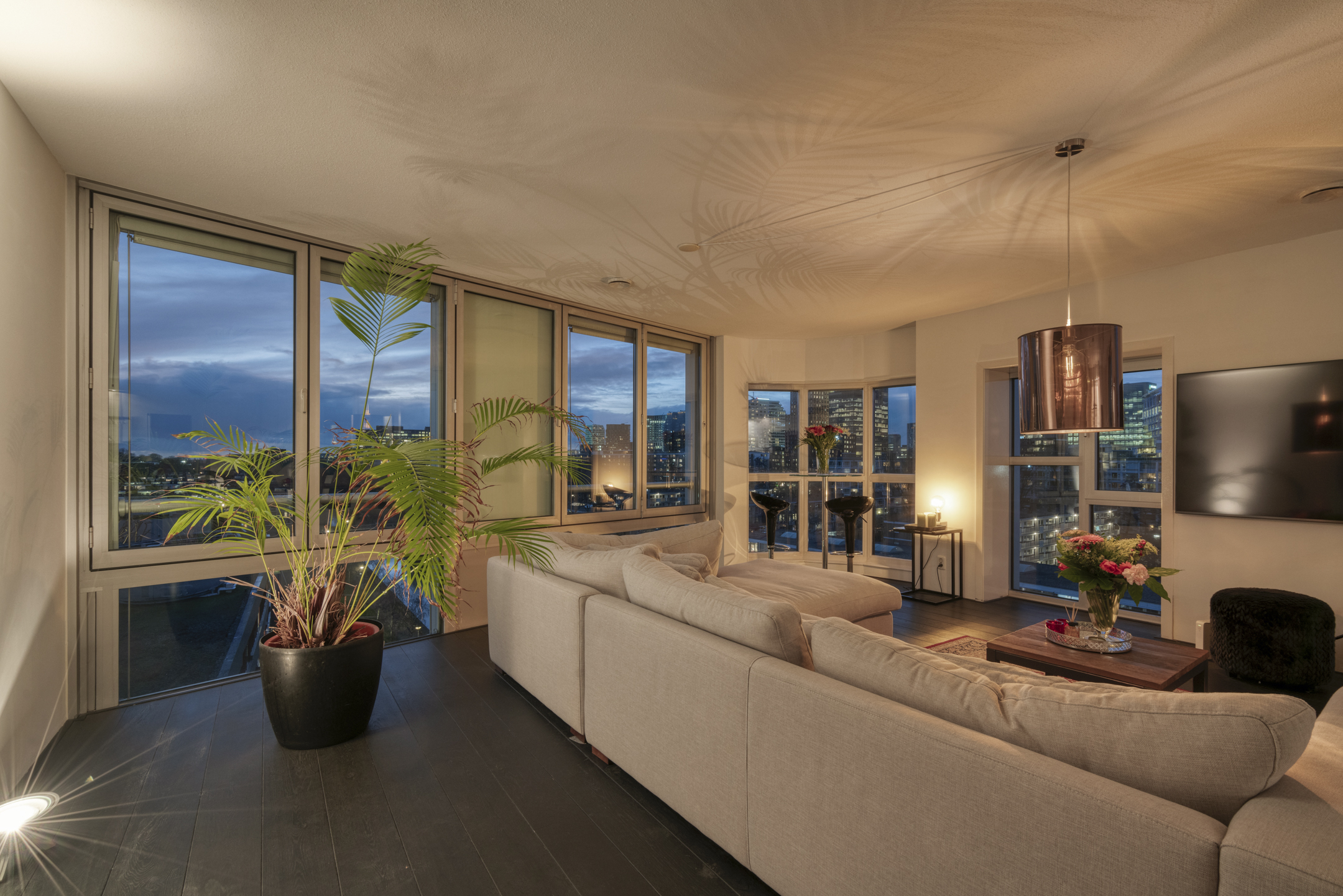 Luxurious three-room corner apartment of 117 m² with unobstructed views of the water and the Zuidas skyline, featuring two bedrooms, a high-end kitchen with cooking island, and an optional private parking space. The apartment is located on the seventh floor of the striking Gelderhof apartment complex, completed in 2004.