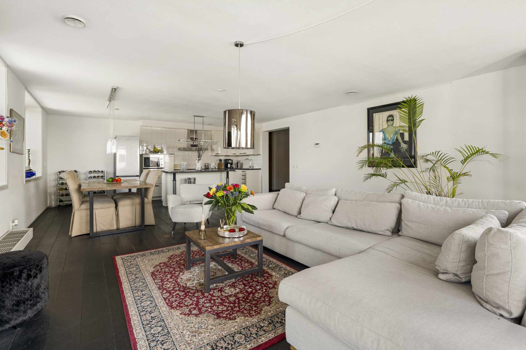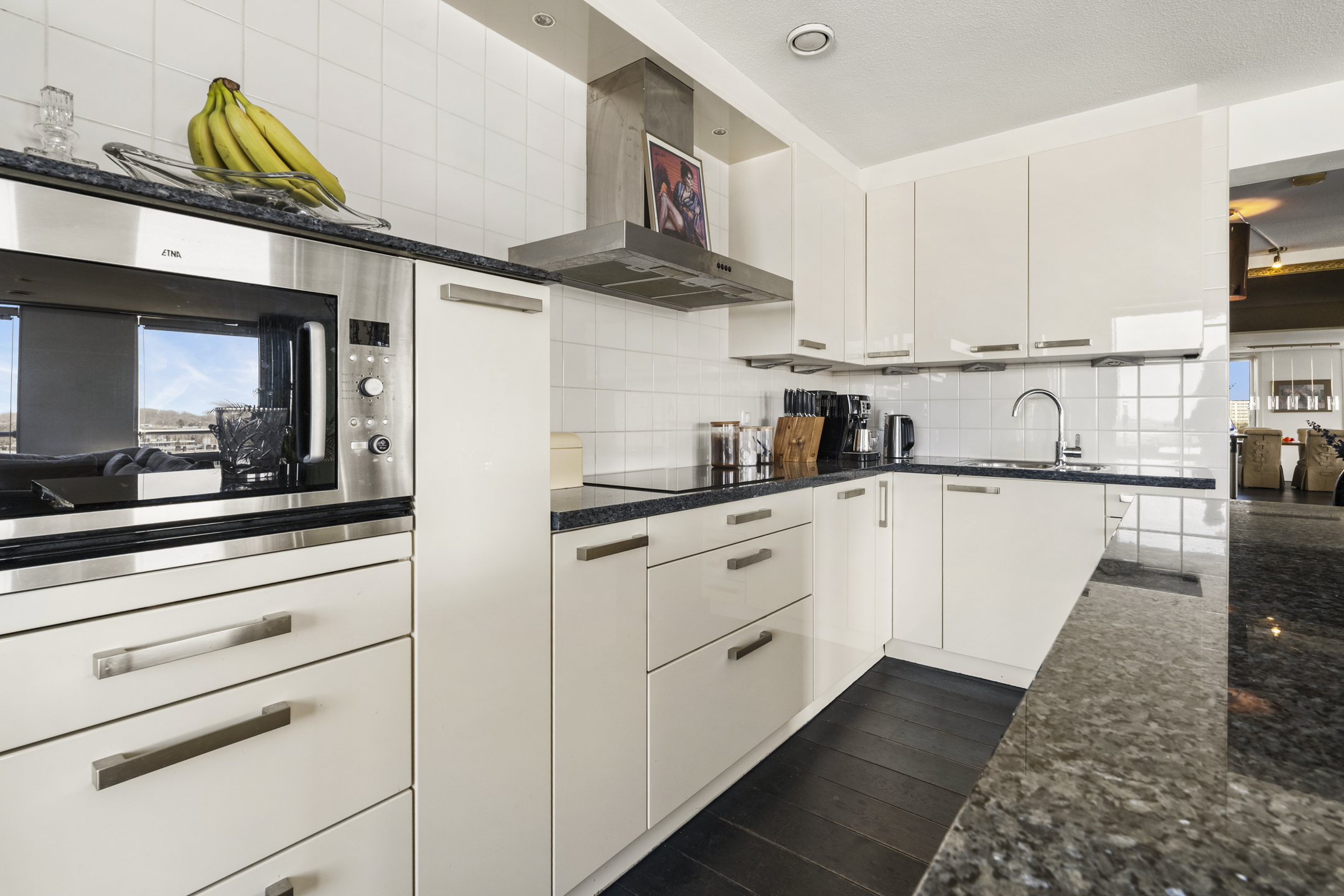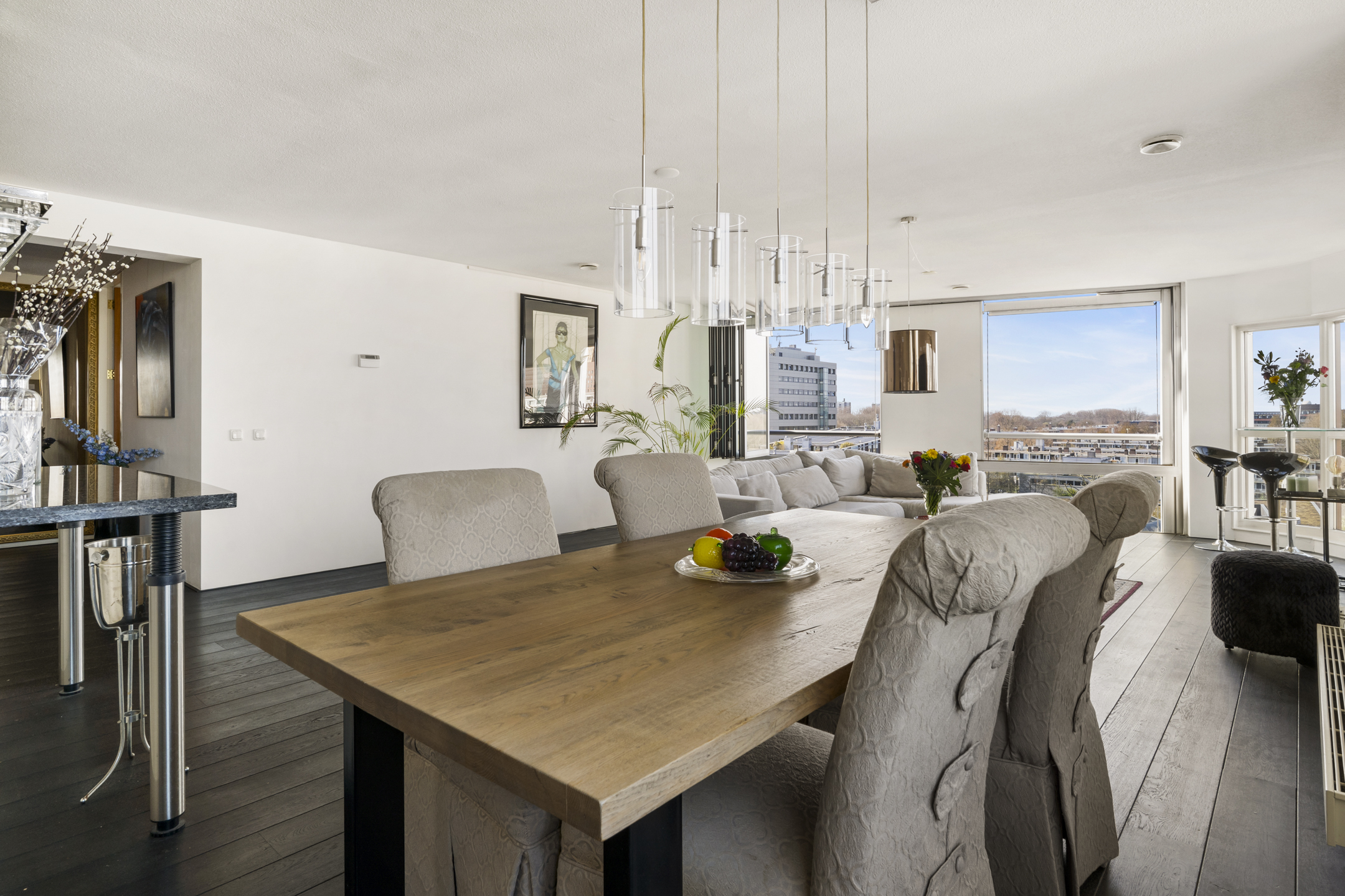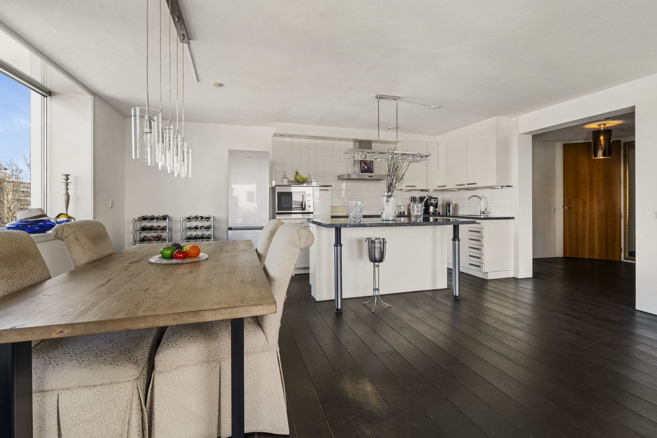 Luxurious three-room corner apartment of 117 m² with unobstructed views of the water and the Zuidas skyline, featuring two bedrooms, a high-end kitchen with cooking island, and an optional private parking space. The apartment is located on the seventh floor of the striking Gelderhof apartment complex, completed in 2004.