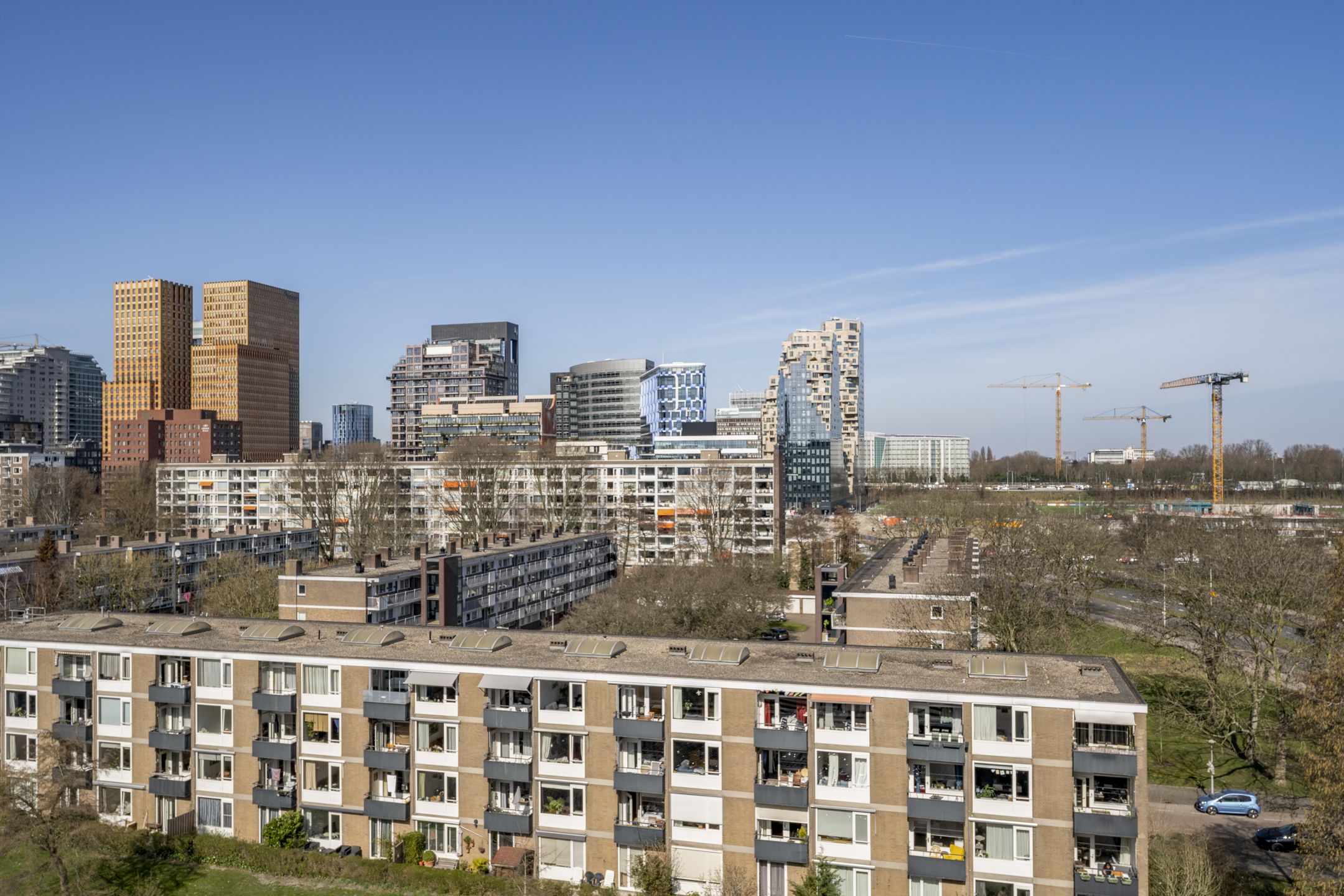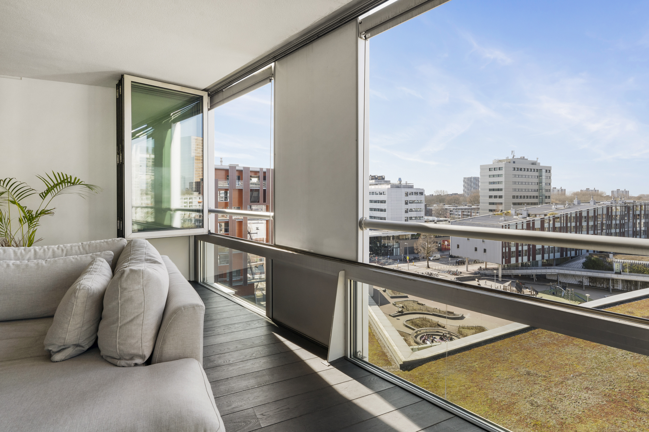 A sunny corner apartment on the seventh floor with panoramic views, privacy, and optional parking, in a prime location in Amsterdam.