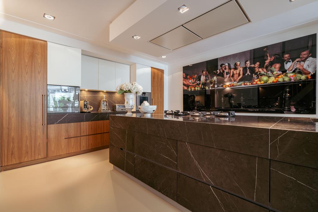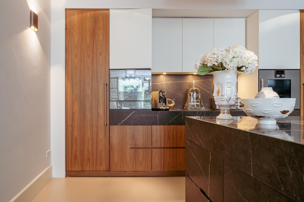 To the front is a bedroom with an en-suite bathroom featuring a washbasin and walk-in shower—currently used as a home gym, but easily repurposed. At the rear is the stunning open-plan kitchen, the centerpiece of this level. Outfitted with Gaggenau appliances, including a fridge, freezer, Quooker, five-burner gas stove integrated into the counter, oven, steam oven, dishwasher, and wine fridge, the kitchen combines luxury and functionality. A solid natural stone countertop with a wooden breakfast bar provides a warm, refined look.