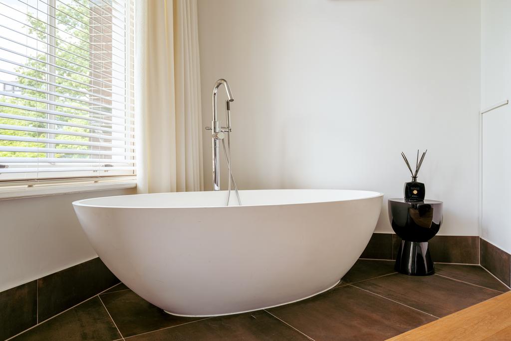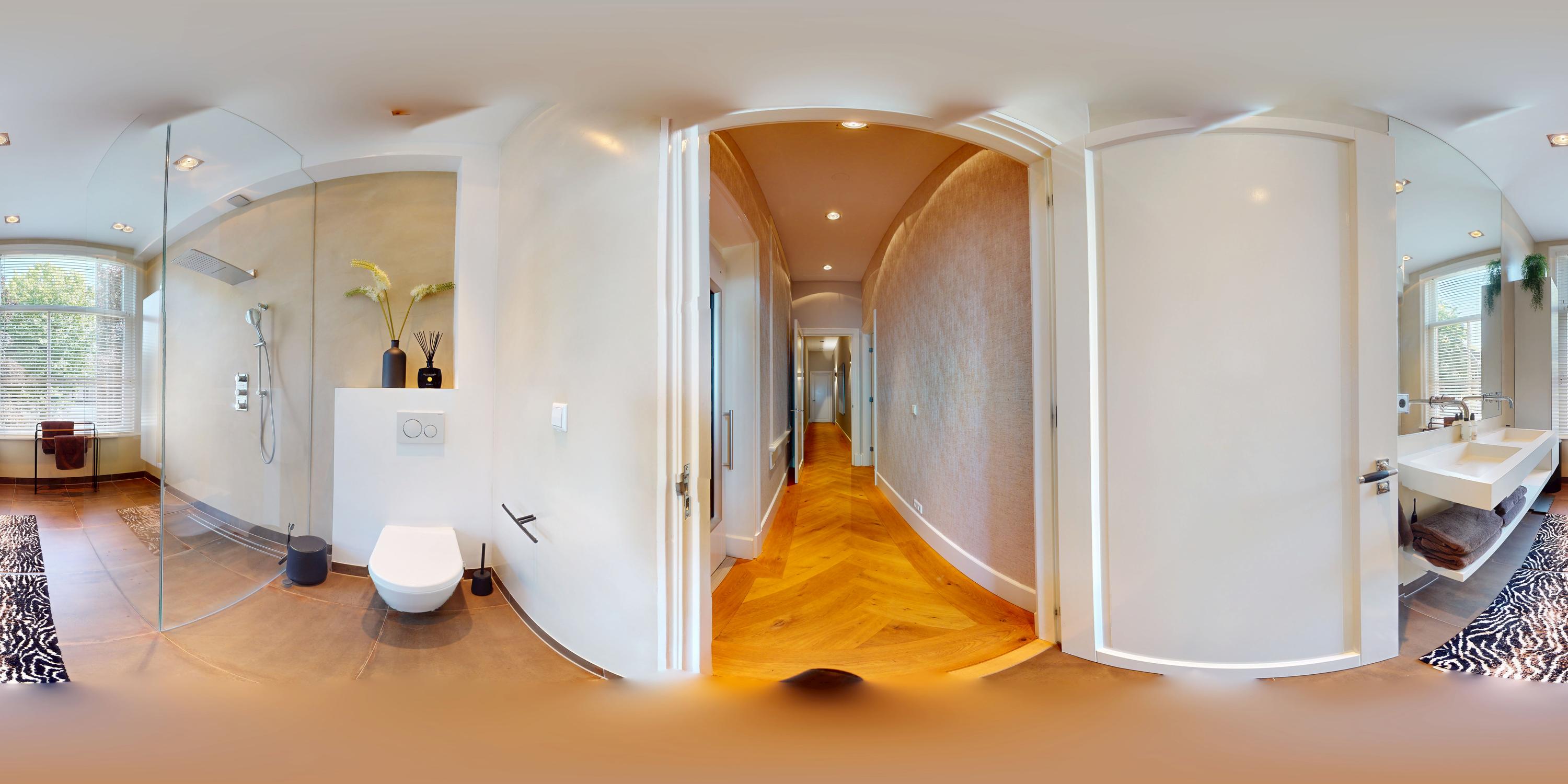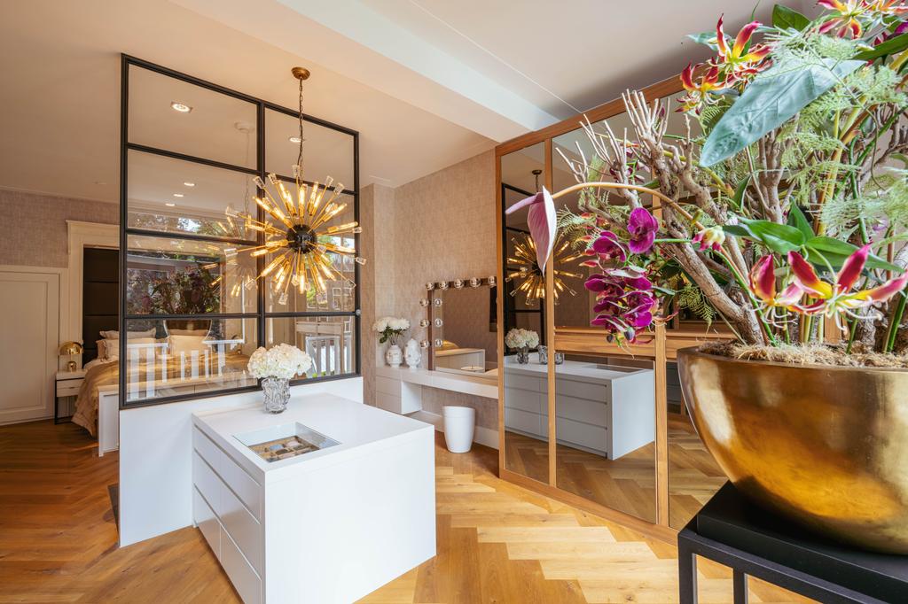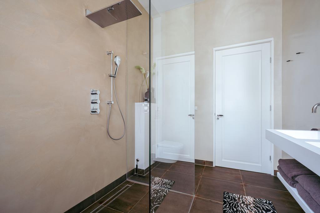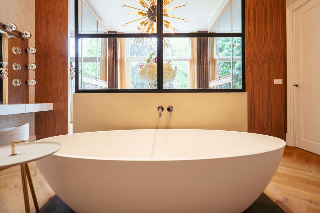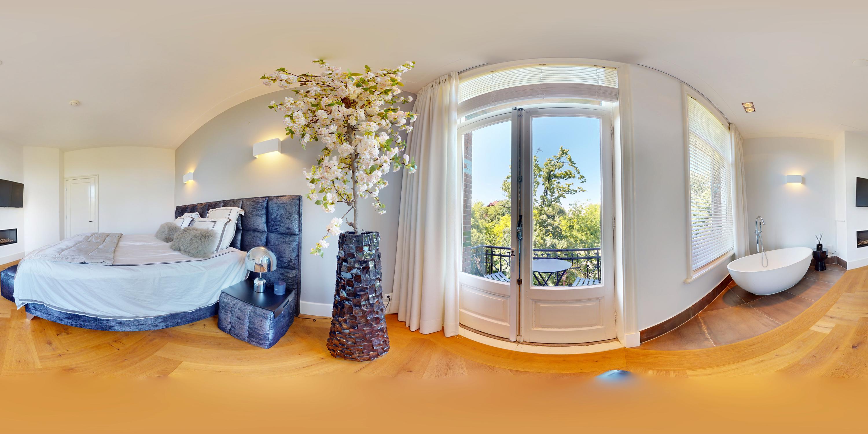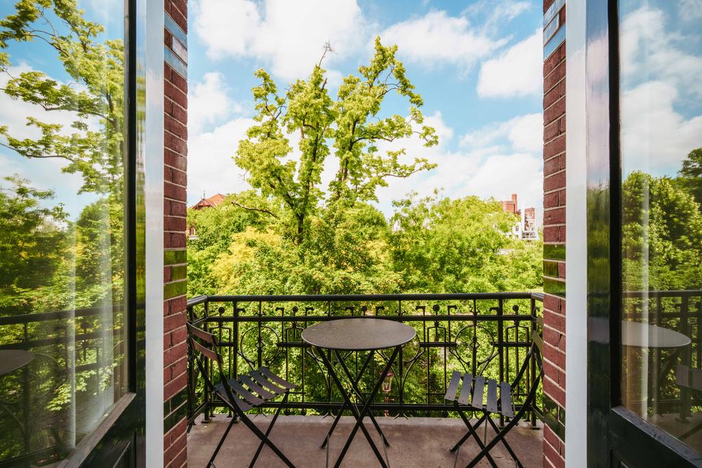Also at the rear is a modern bathroom with a double vanity, spacious walk-in shower, and toilet. At the front of the home is a second large bedroom, with a gas fireplace, a freestanding bathtub, and French doors opening onto a balcony with breathtaking views over Vondelpark.