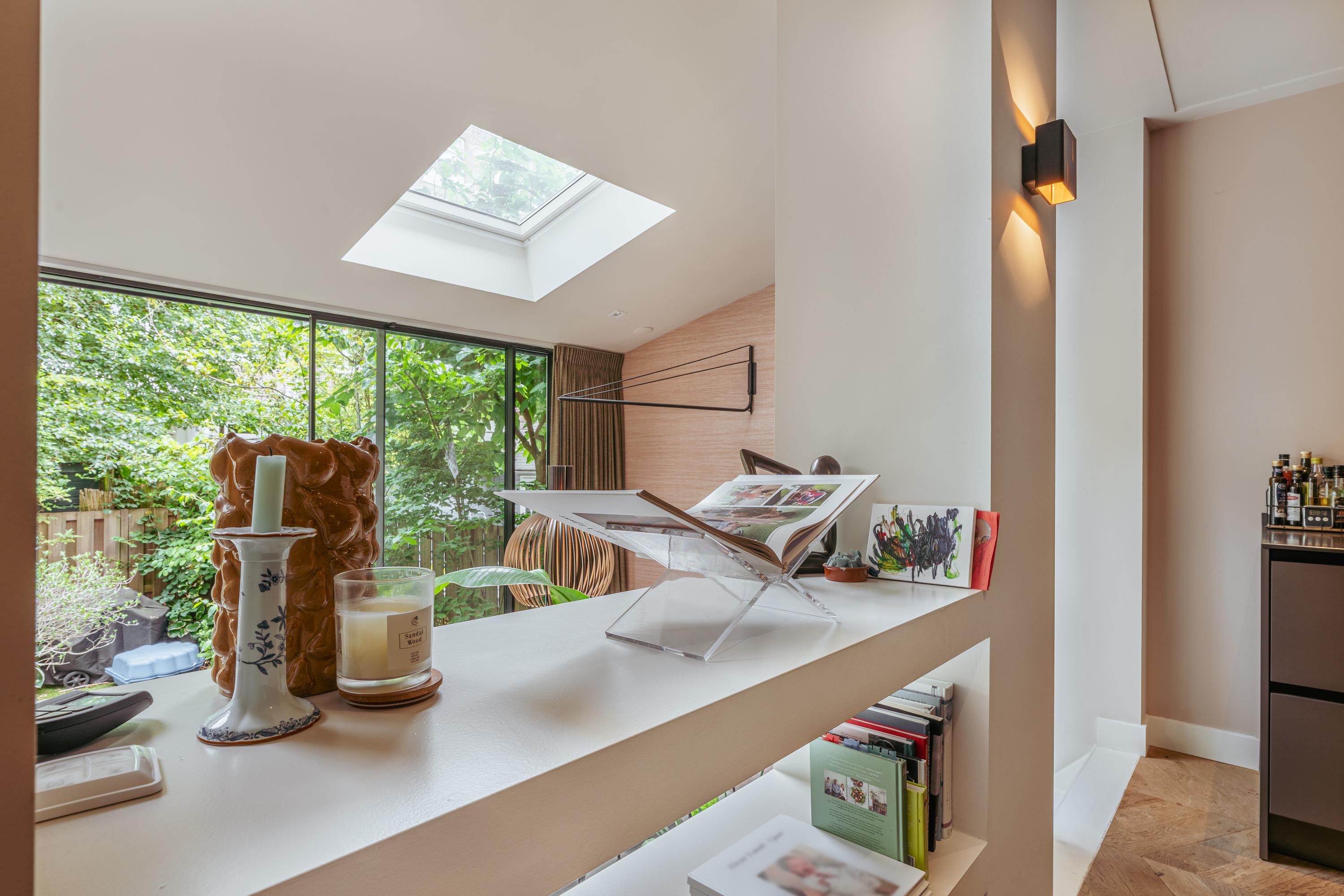 A few steps down, you enter the recently constructed extension with skylights, which allow plenty of natural light to flood the space. This area currently serves as an atmospheric dining room, with an additional seating area arranged around a modern gas fireplace. Floor-to-ceiling sliding glass doors lead to the beautifully landscaped east-facing garden of approx. 32 m², complete with a practical storage shed.