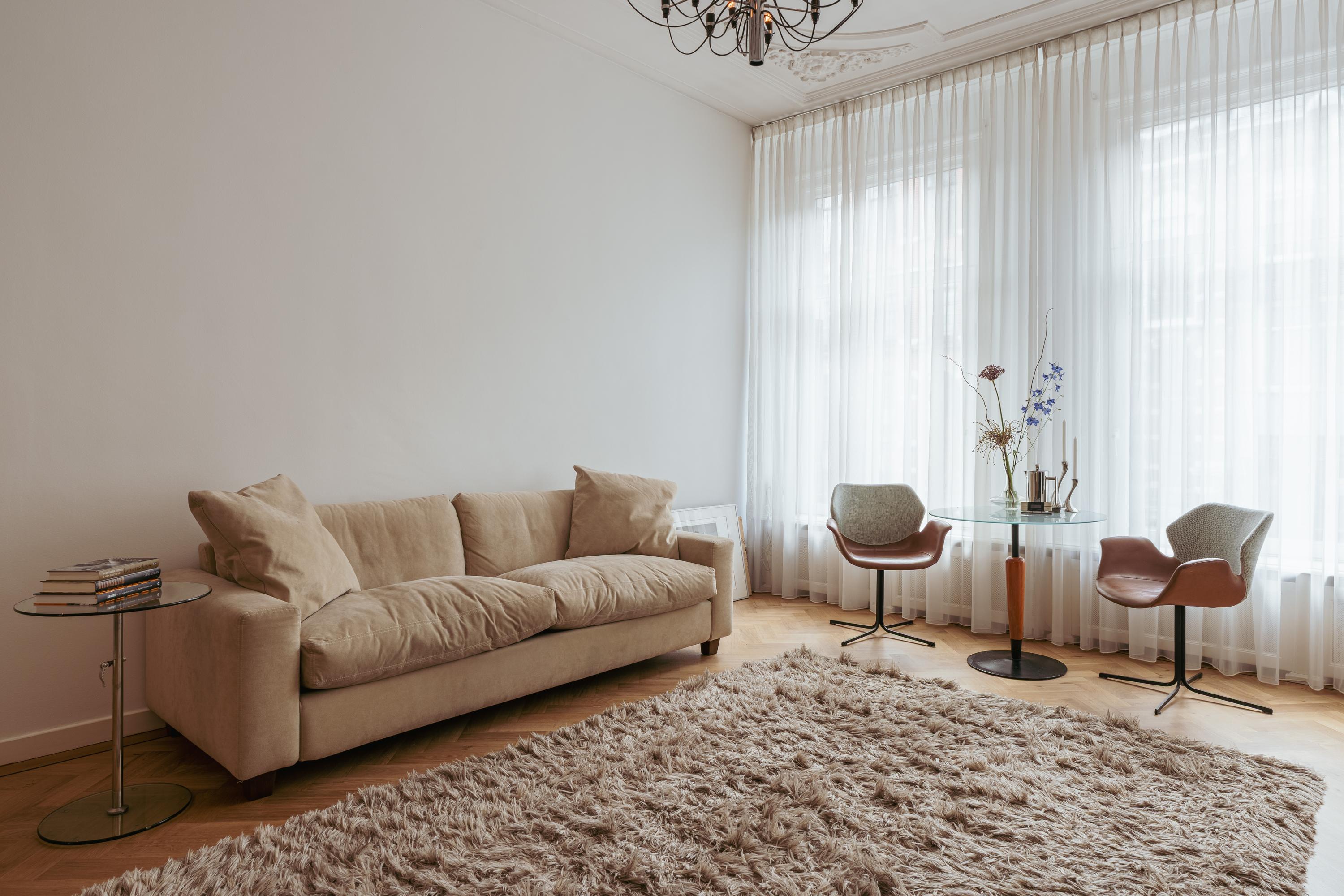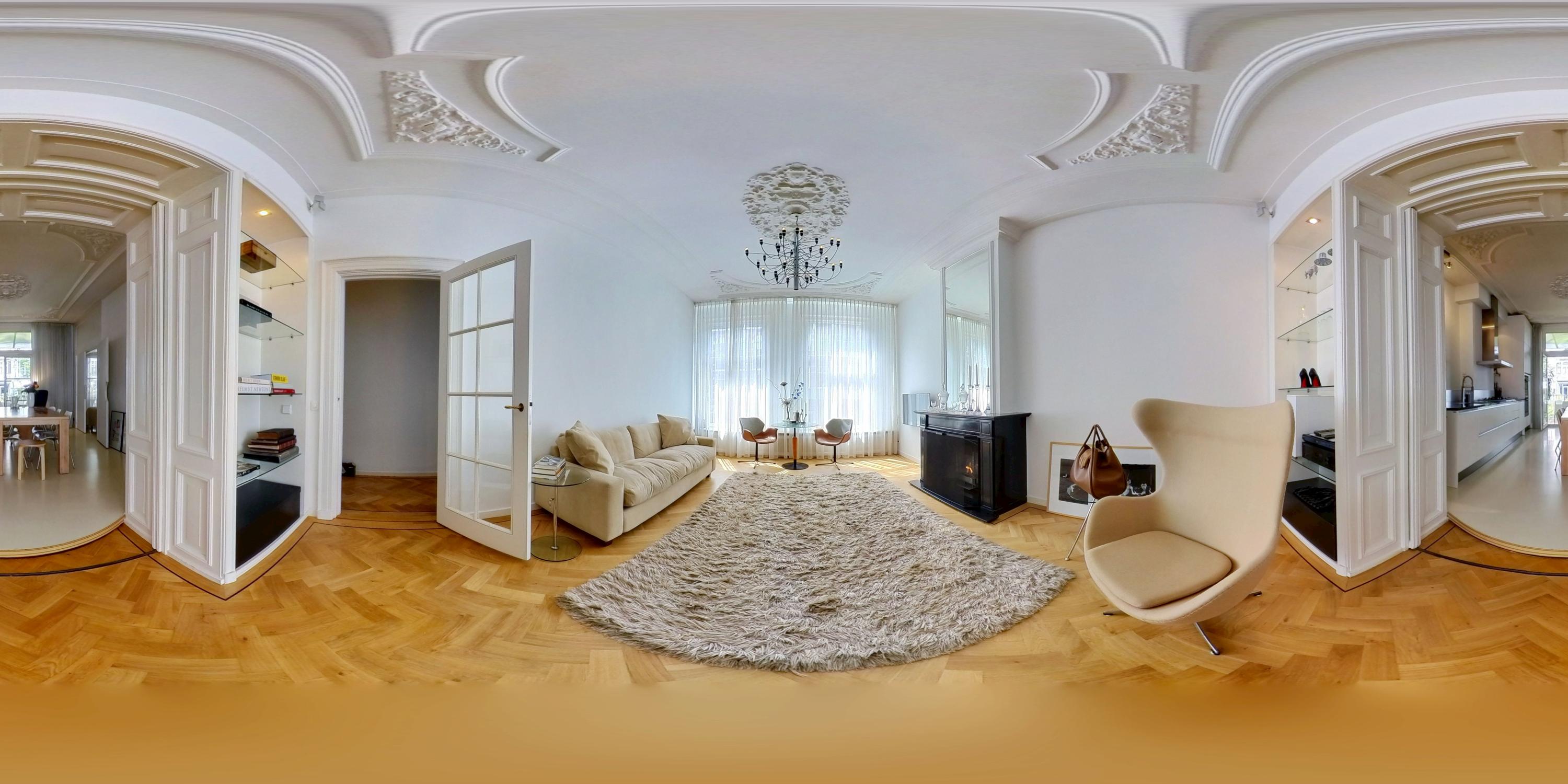 Aan de voorzijde van de woning bevindt zich de royale woonkamer met sfeervolle (open) haard en grote raampartijen, waardoor de ruimte baadt in natuurlijk licht. De woonkamer wordt extra gekenmerkt door prachtige authentieke details, waaronder rijk gedecoreerde plafondornamenten en originele schuifdeuren, die de ruimte een elegante en karaktervolle uitstraling geven. Dankzij de riante afmetingen is dit een ideale plek voor een comfortabele zithoek en een royale leefruimte.