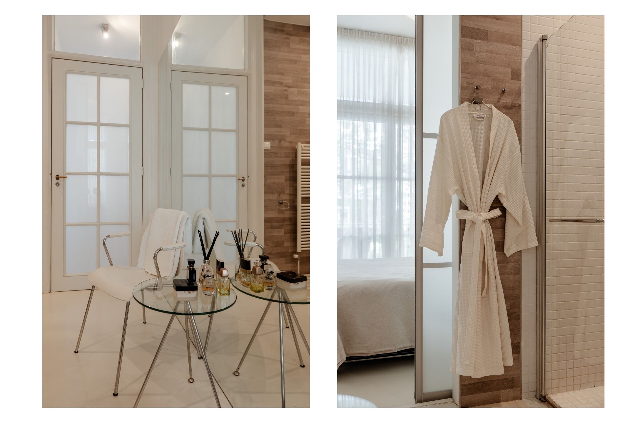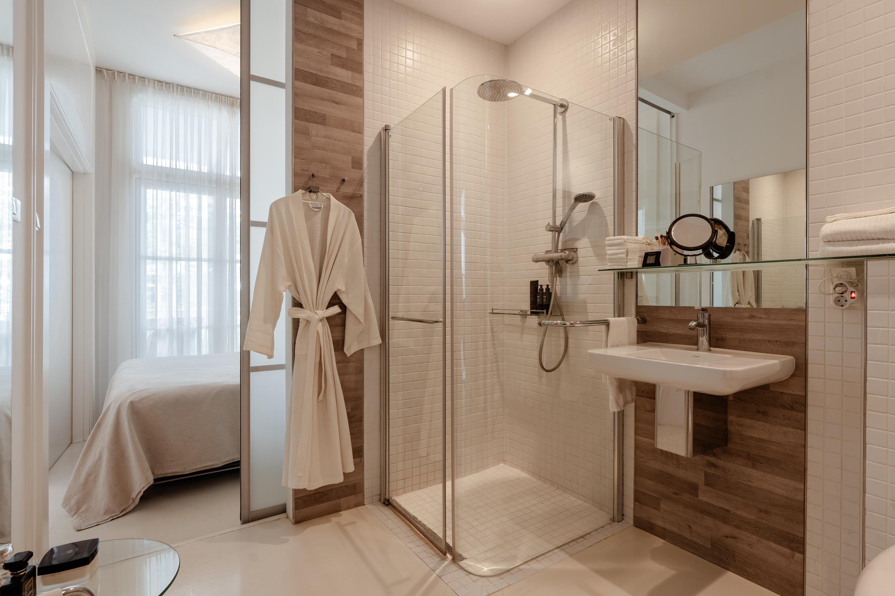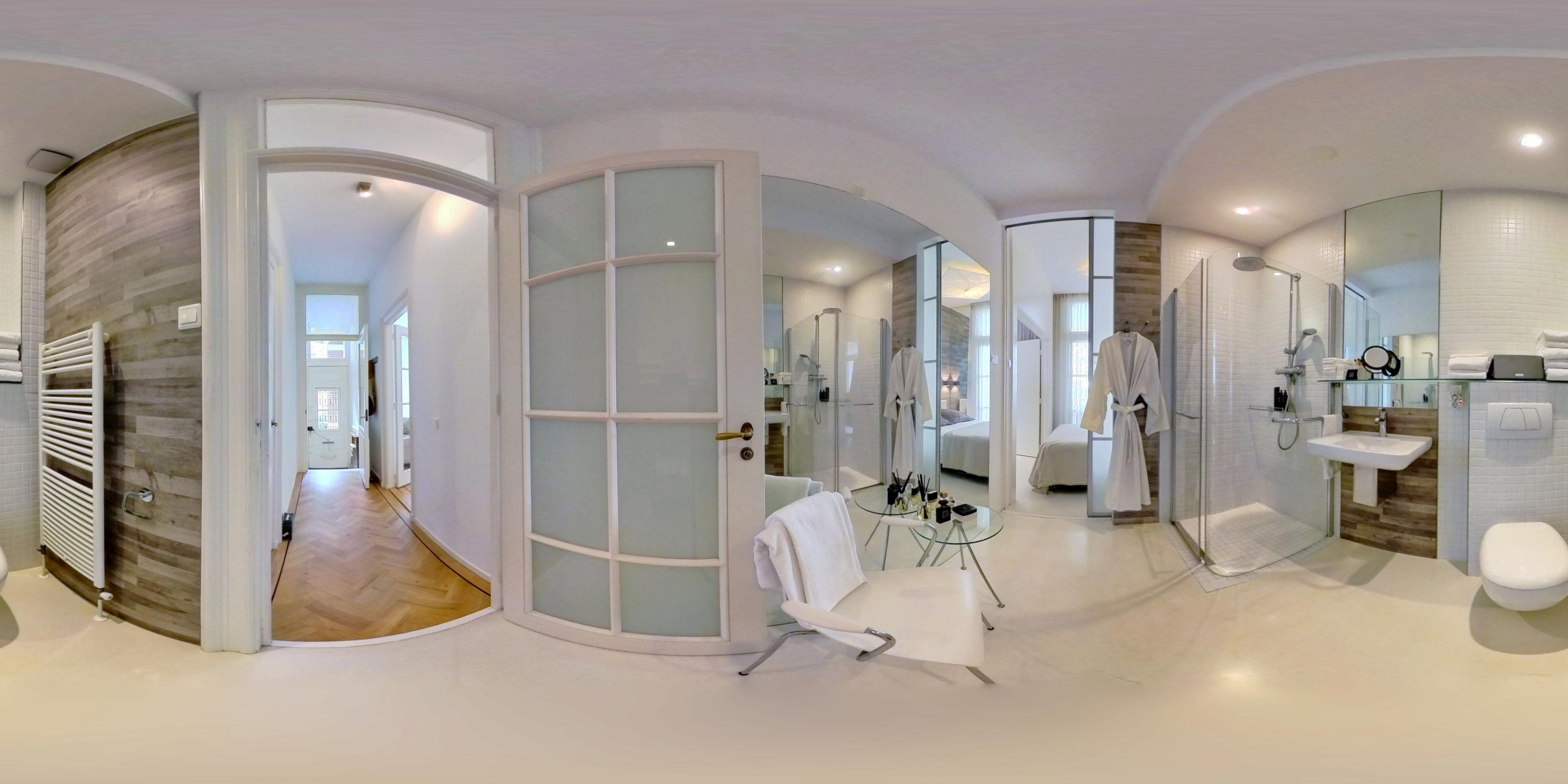 Aangrenzend aan de slaapkamer bevindt zich de en-suite badkamer, bereikbaar via een schuifwand en uitgerust met een inloopdouche, wastafel, toilet en designradiator.
