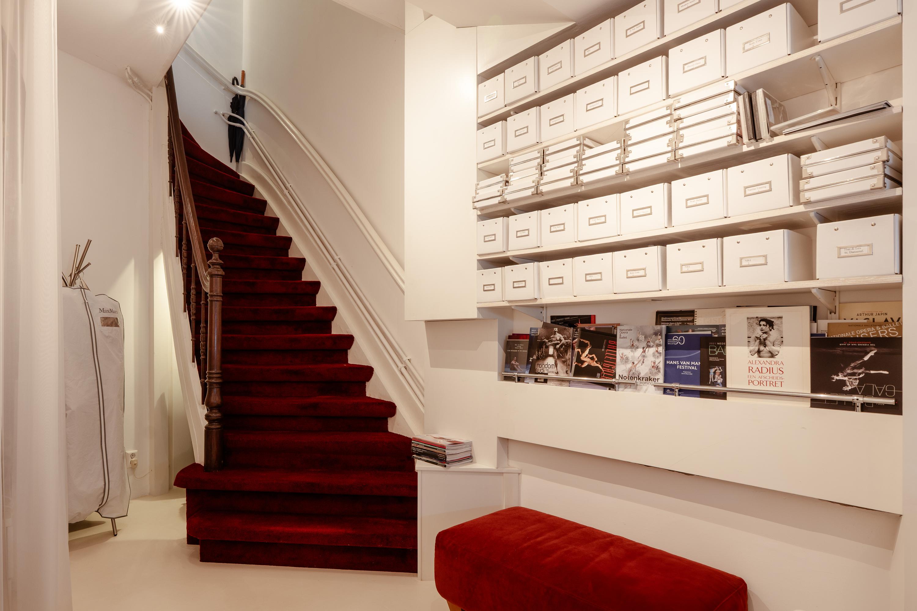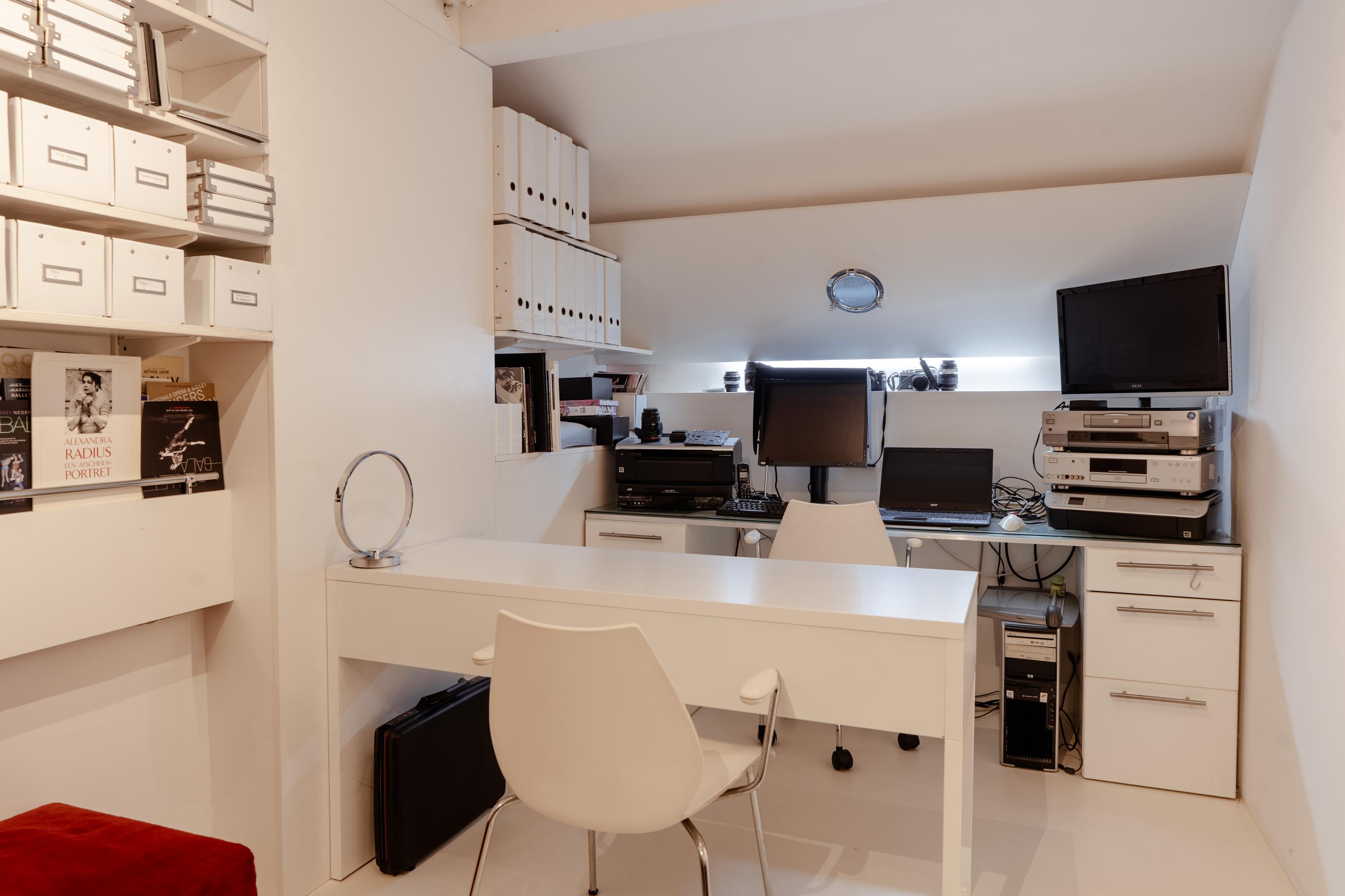Een rood beklede trap leidt naar het souterrain met vloerverwarming. Deze ruimte van circa 13 m² is uitermate geschikt als logeerkamer, yoga of sportruimte, aangevuld met volop bergruimte. Momenteel is de ruimte in gebruik als kantoor.
