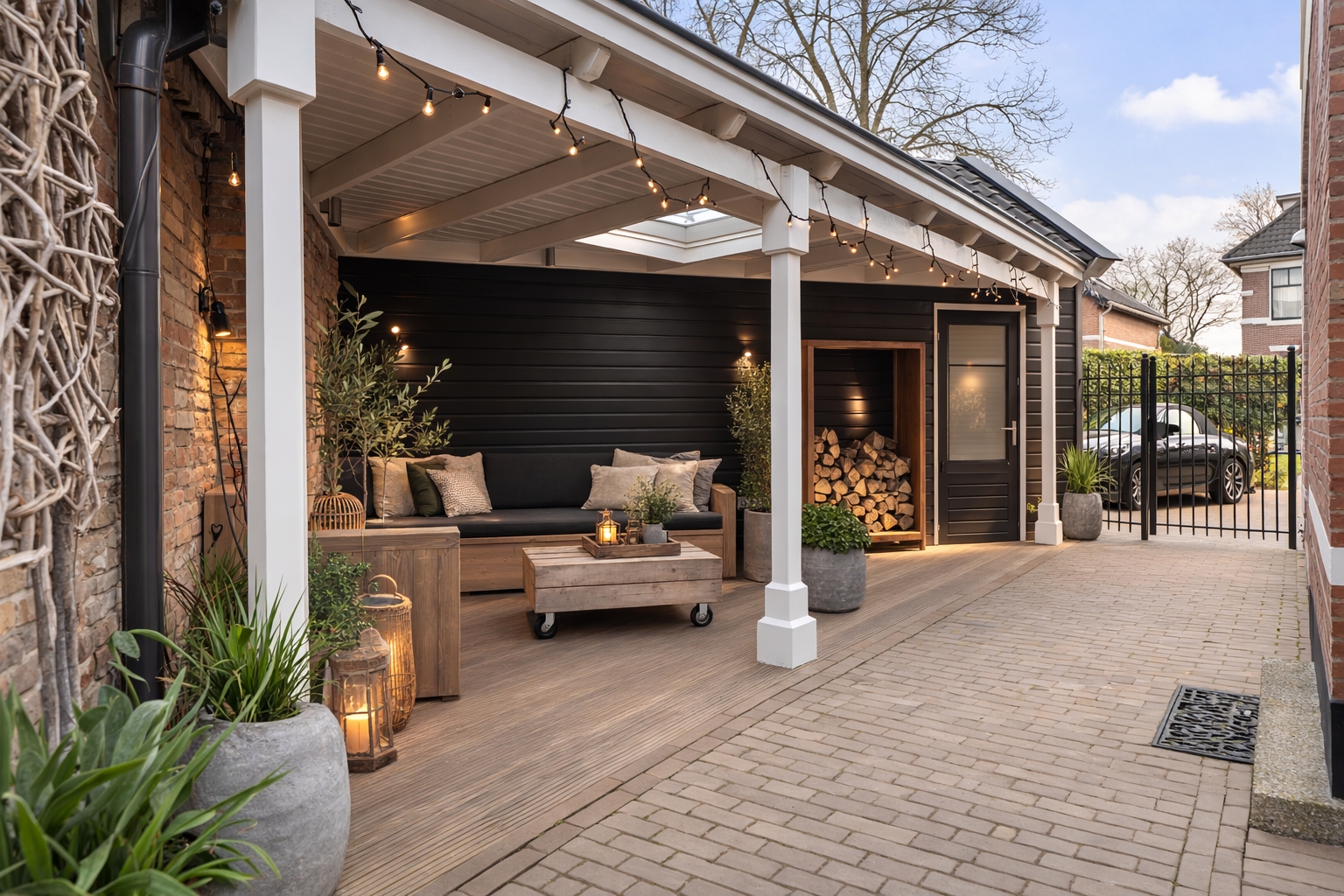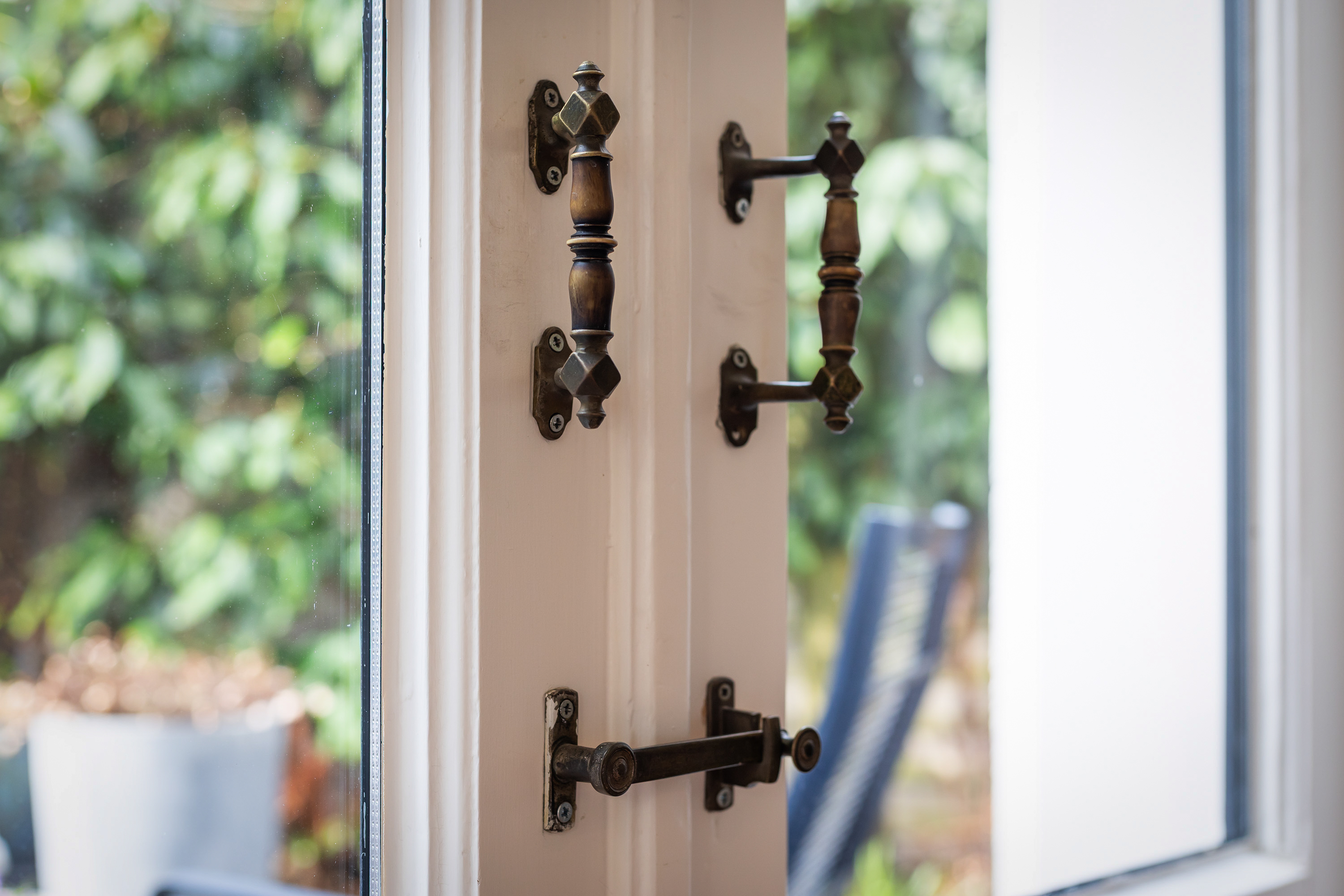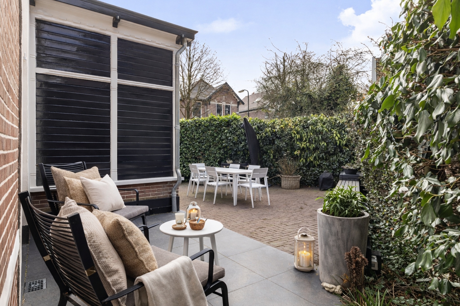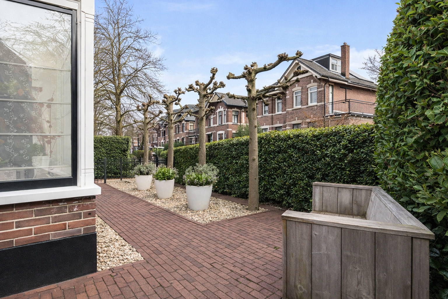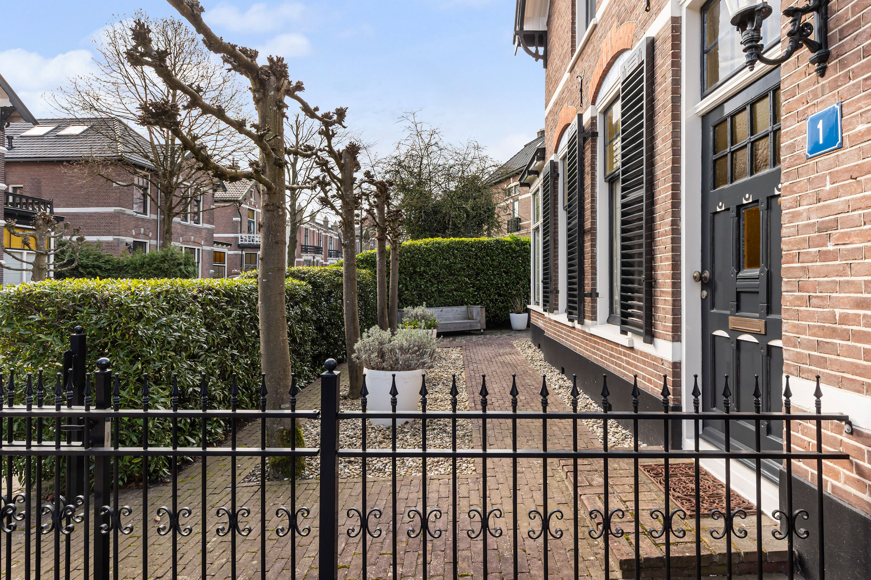 The front garden provides a distinguished entrance and is elegantly enclosed by ornate wrought-iron fencing, complemented by a green hedge and four carefully trained espalier trees. The combination of decorative brick paving and gravel lends a classic appearance that perfectly complements the architecture of the house.