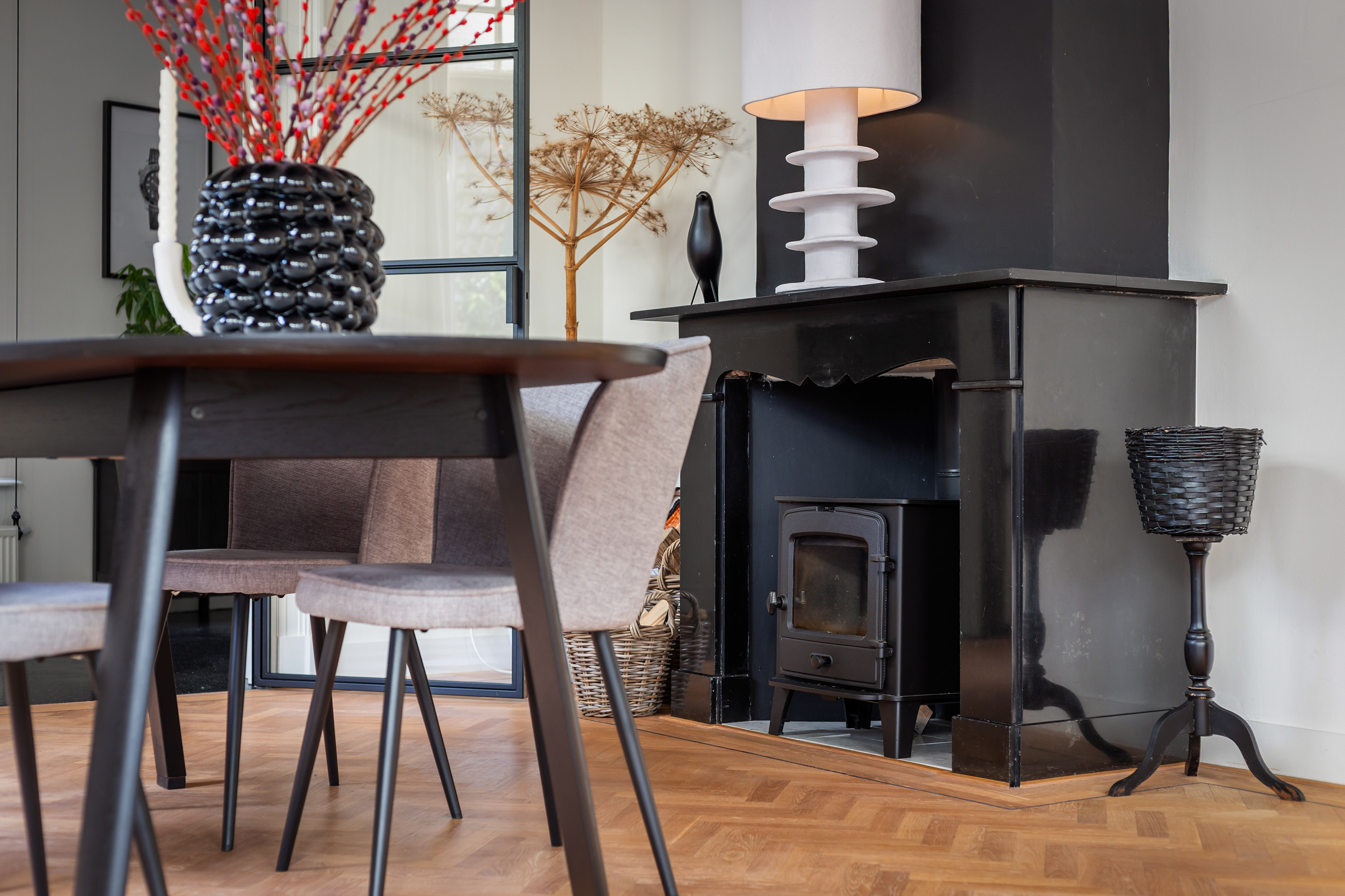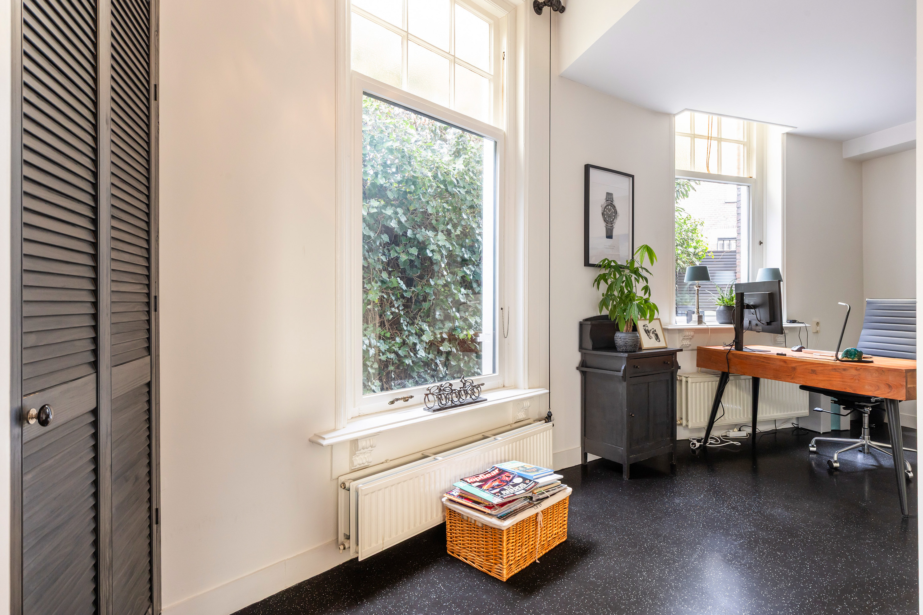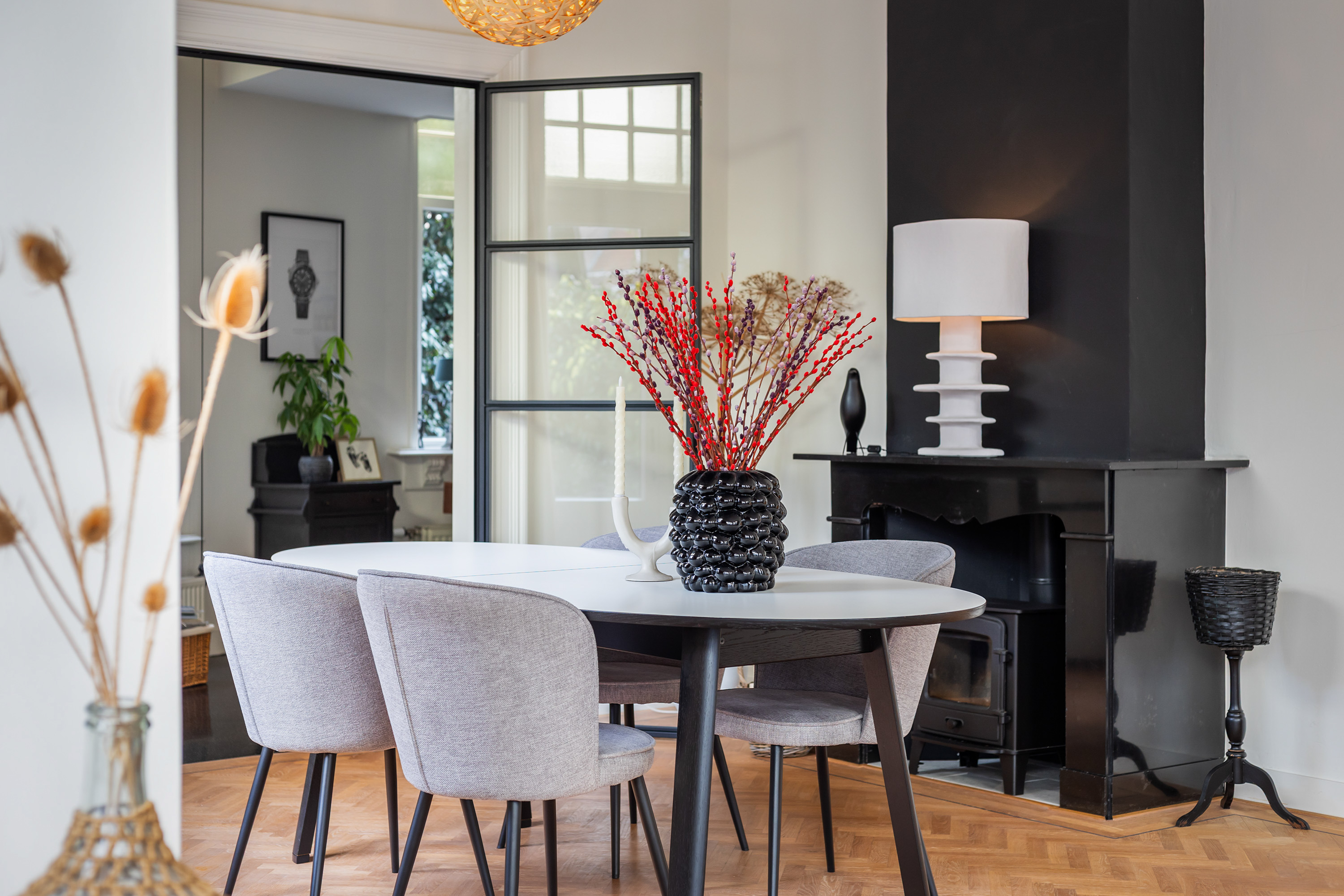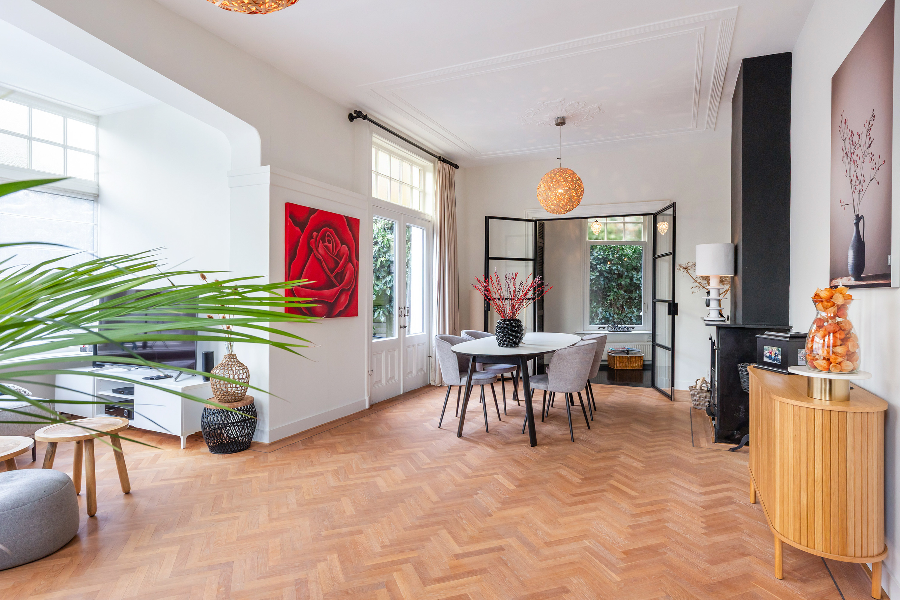 A door from the kitchen leads into the living room, which has a playful Z-shaped layout. At the rear, a study area provides a quiet space for working or studying from home. The ceilings are smoothly plastered, and through two elegant steel-framed glass doors one enters the L-shaped living area. Here, the character of the villa is fully expressed. Original ceilings with decorative cornices and mouldings, a granite fireplace with wood-burning stove, and an oak herringbone floor with border inlay create a rich and atmospheric setting. Double sliding doors open onto the terrace, creating a natural connection between indoors and outdoors.