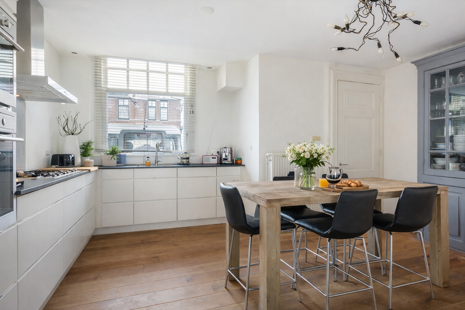 The kitchen forms an inviting central space within the home and is finished with an oak floor. The white KVIK kitchen is arranged in an L-shape and equipped with a range of integrated appliances, including a dishwasher, five-burner gas hob with extractor hood, combination oven with microwave function, separate oven, refrigerator and a freezer with three drawers. From the kitchen, there is access to a spacious utility room with a rear entrance. This practical space offers ample room for storage and coats and features an original window.
