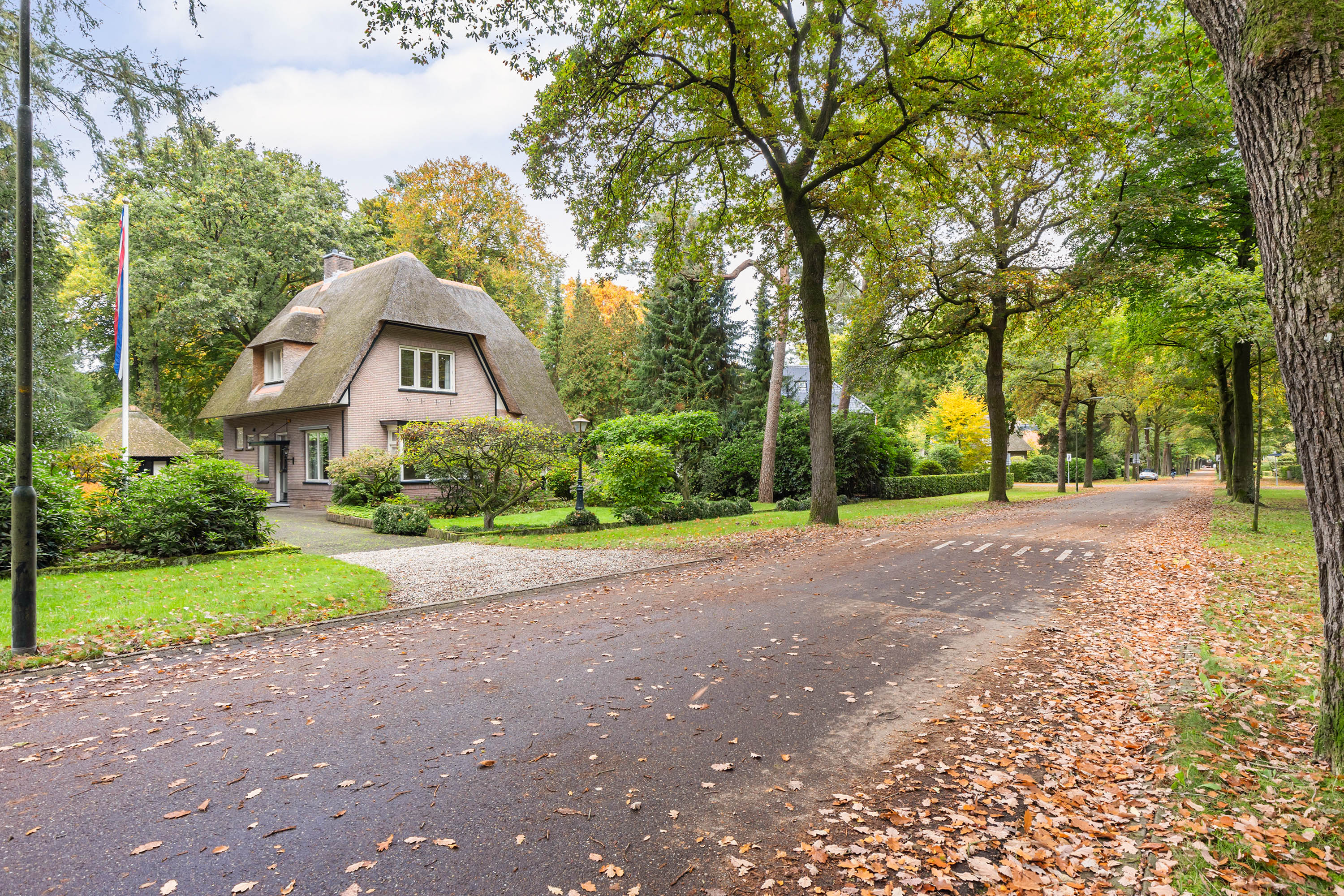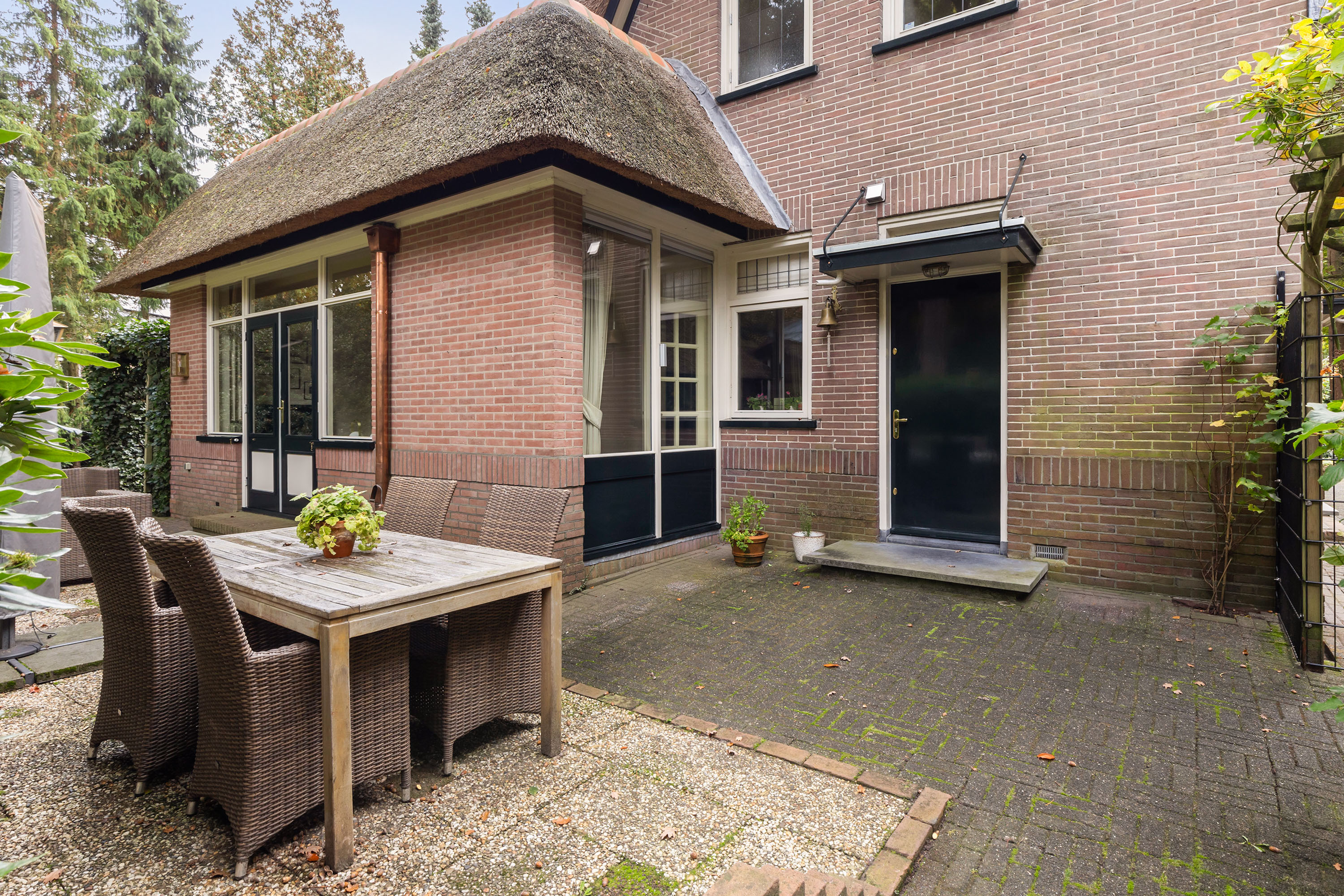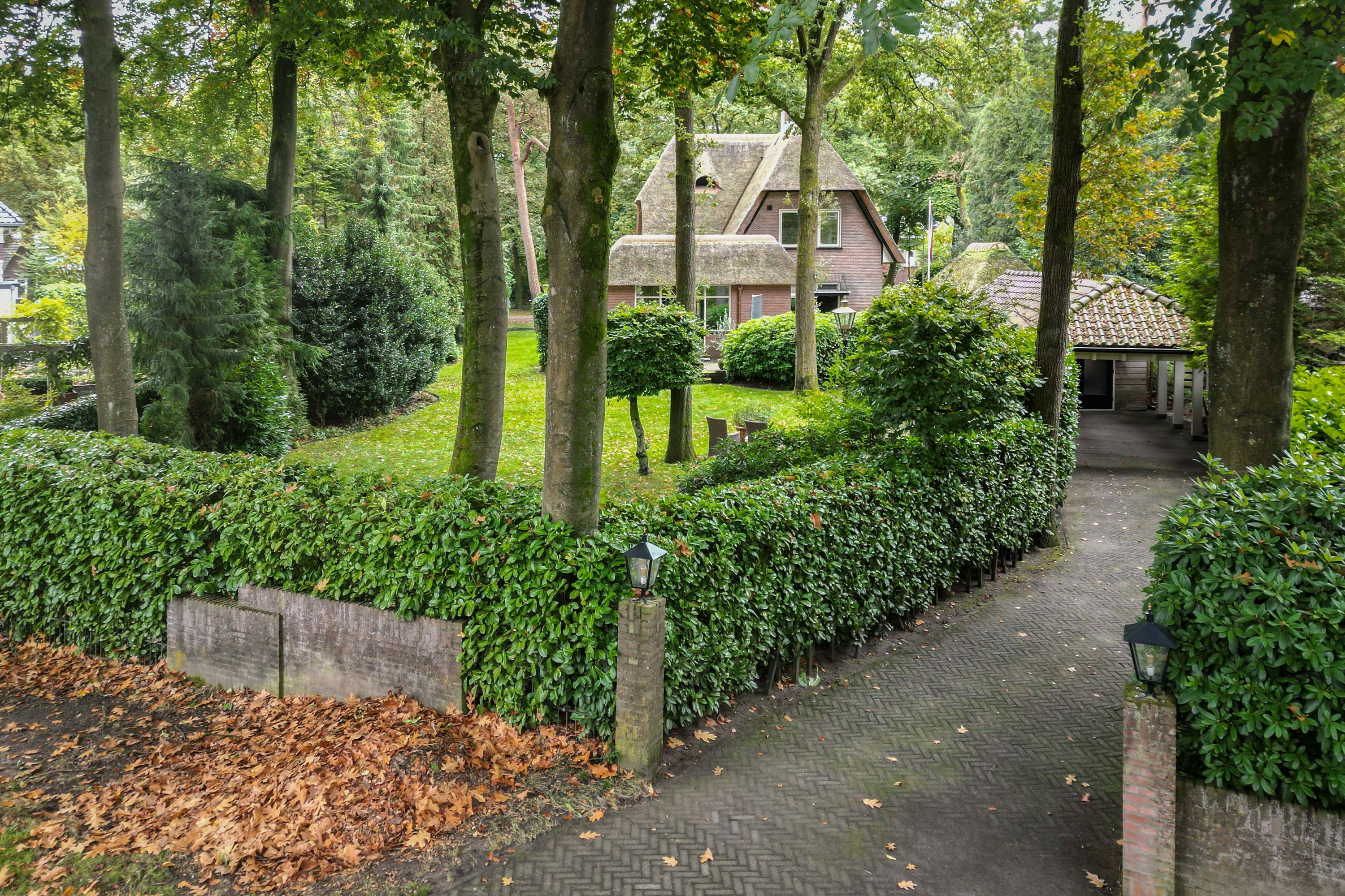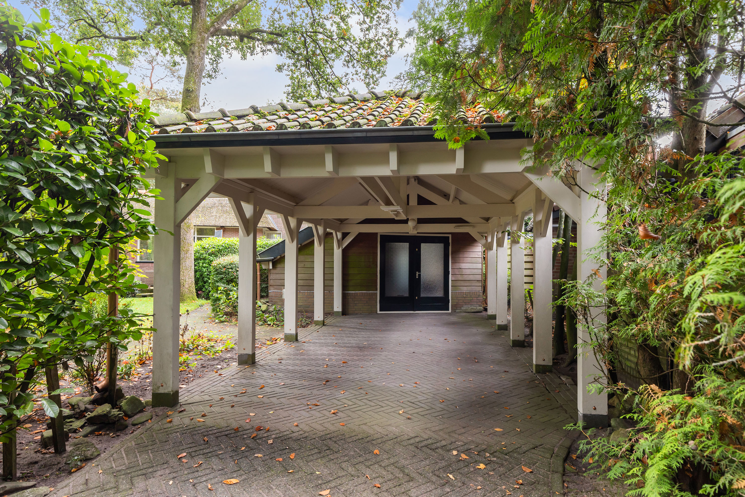 The 1,480 m² plot has dual access. From the driveway at the front, there is space for four cars beside the house. This leads to the garage, whose thatched roof and high ridge perfectly complement the villa’s architectural style. At the rear, via the Cederlaan, a generous driveway provides parking for five cars, alongside a large carport with a tiled roof. Beyond it stands a wooden storage shed with double doors.